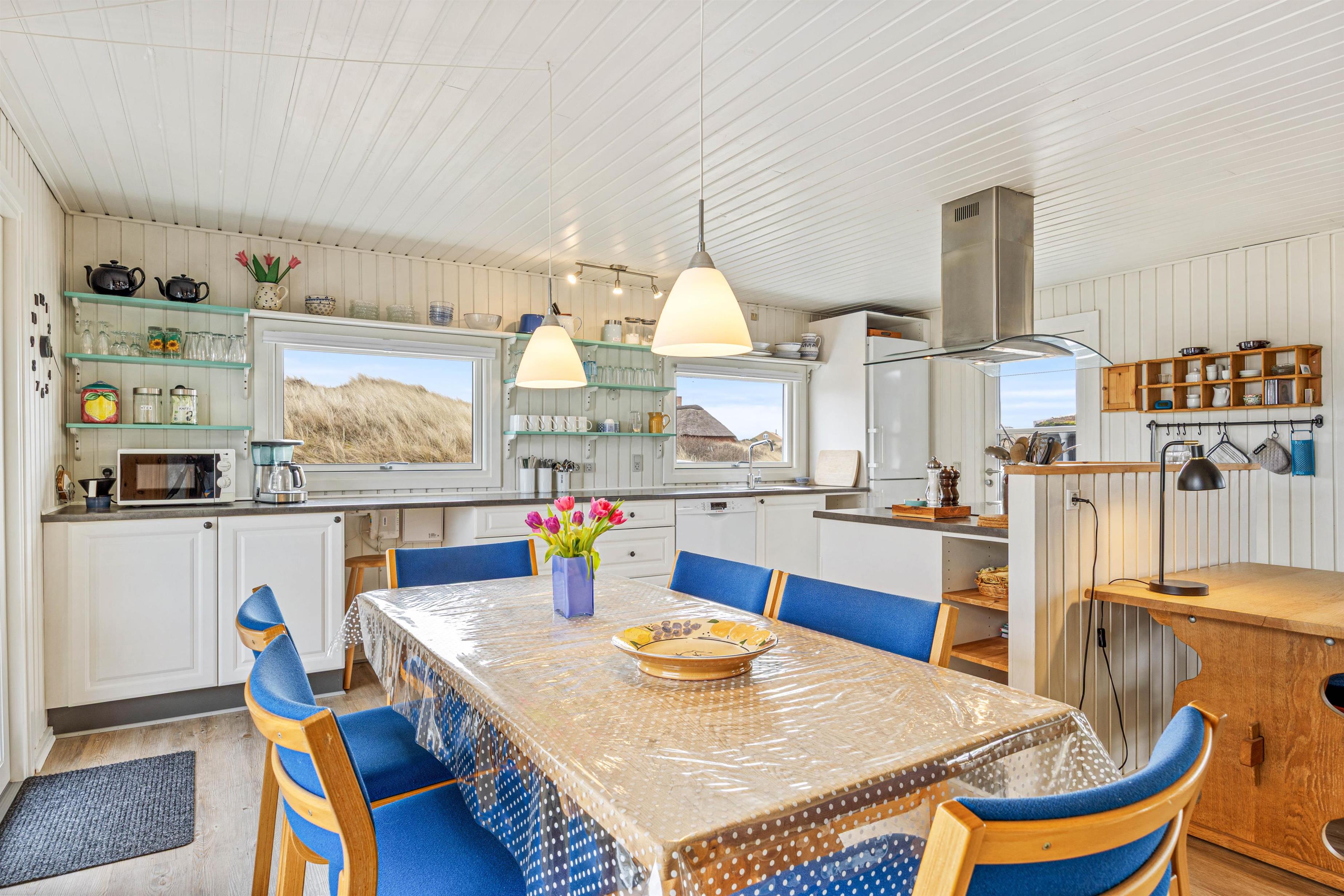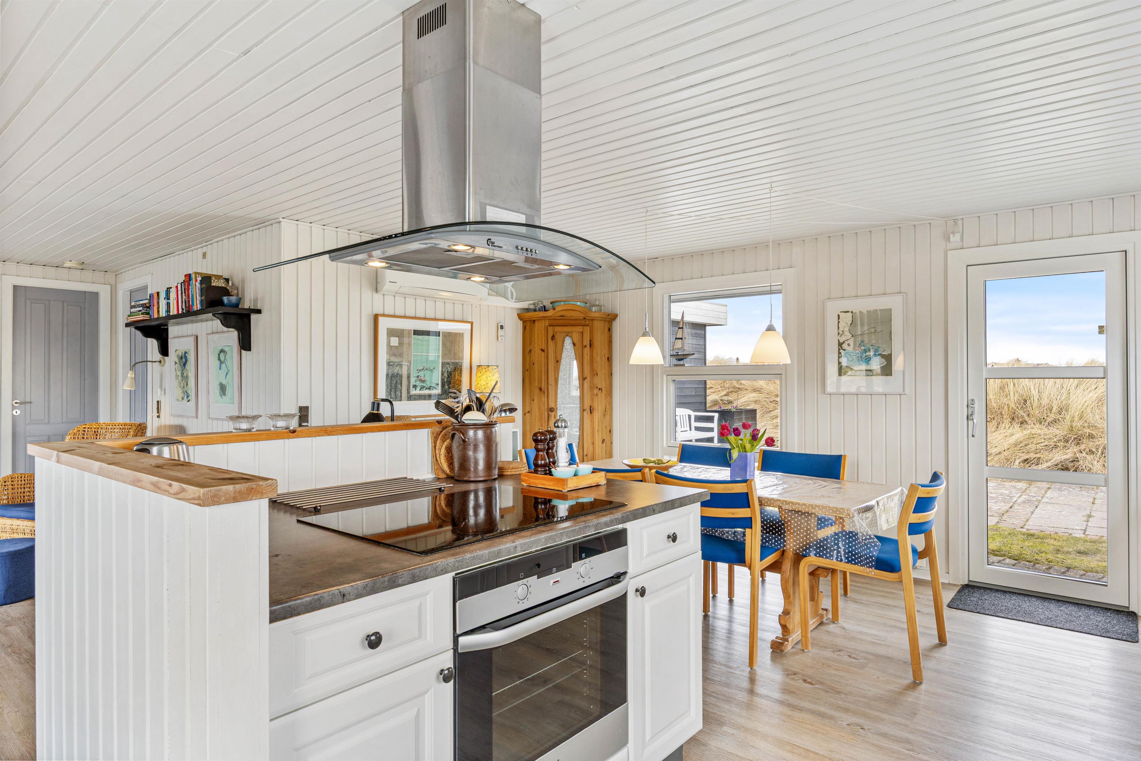 Sommerhusets hjerte er det rummelige køkken-alrum, hvor I finder et veludstyret køkken med plads til at lave mad i fællesskab. I stuen kan I alle samles om et spil eller se en god film i fjernsynet - her er også plads til, at man kan sætte sig ned og læse en god bog, imens de knitrende lyde fra brændeovnen skaber en hyggelig atmosfære.