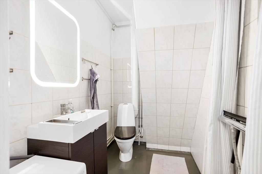 På førstesalen et toilet med håndvask. Soveværelse med dobbelt seng. Mulighed for opredning på madrasser til 2 personer.