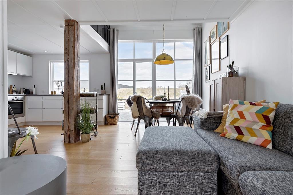 Træd ind i en lys og indbydende ferielejlighed fordelt på to etager. I stueplan finder du et åbent opholdsområde med komfortable møbler, brændeovn og direkte adgang til en stor terrasse – perfekt til afslapning efter en dag med aktiviteter. Køkkenet er fuldt udstyret med moderne faciliteter som keramiske kogeplader, ovn, mikrobølgeovn og opvaskemaskine, så du nemt kan tilberede dine måltider. På første sal er der tre soveværelser: to med dobbeltsenge og et med en dobbeltseng samt en overkøje – ideelt til familier eller grupper. Badeværelset byder på bruseniche, gulvvarme og vaskemaskine. Der er desuden gratis Wi-Fi