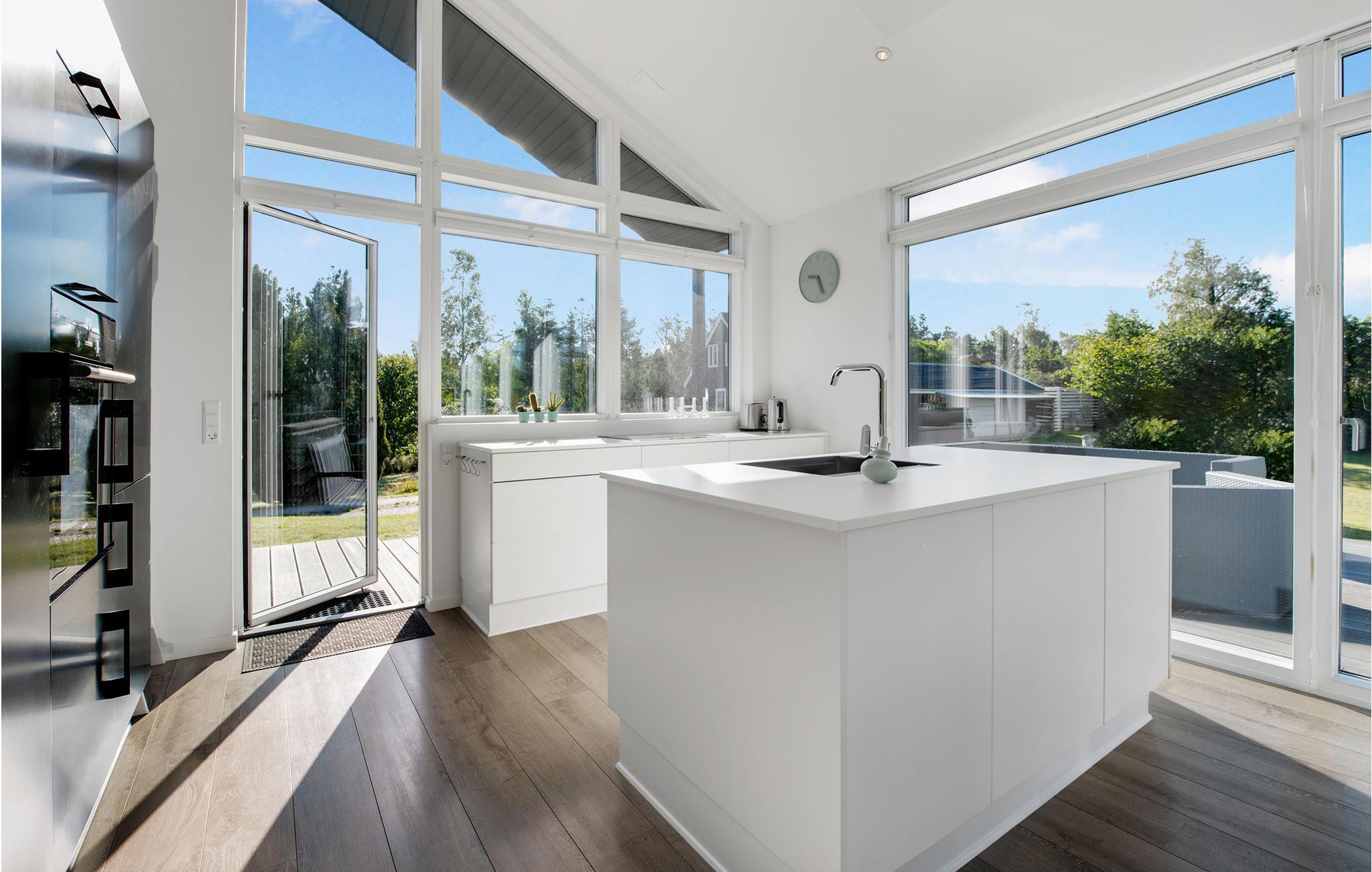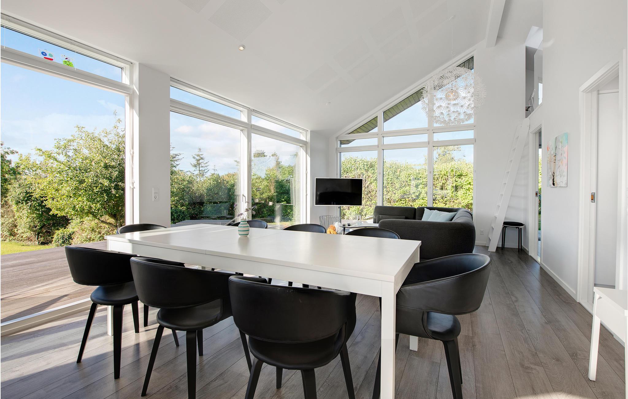 Velkommen til dette eksklusive feriehus, der garanteret tilbyder dig en fantastisk ferie. Inde i huset kan du forvente en lys og moderne atmosfære med masser af dagslys og moderne møbler i skandinavisk stil. Takket være de store vinduer har du en smuk udsigt over haven og grønne områder fra den åbne stue og spiseplads. Takket være det åbne køkken kan du være sammen med resten af familien mens du laver mad og diskutere dagens begivenheder.