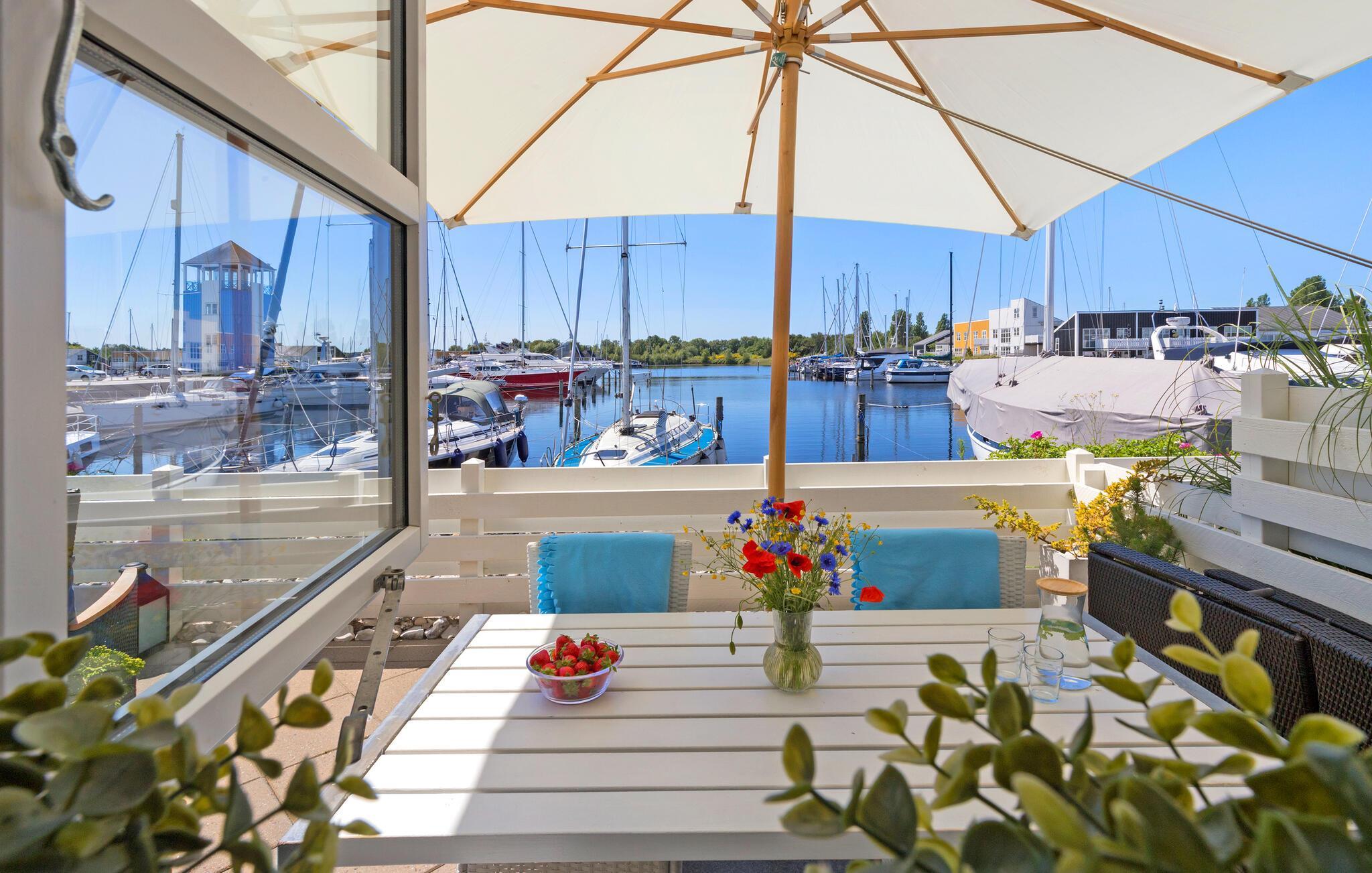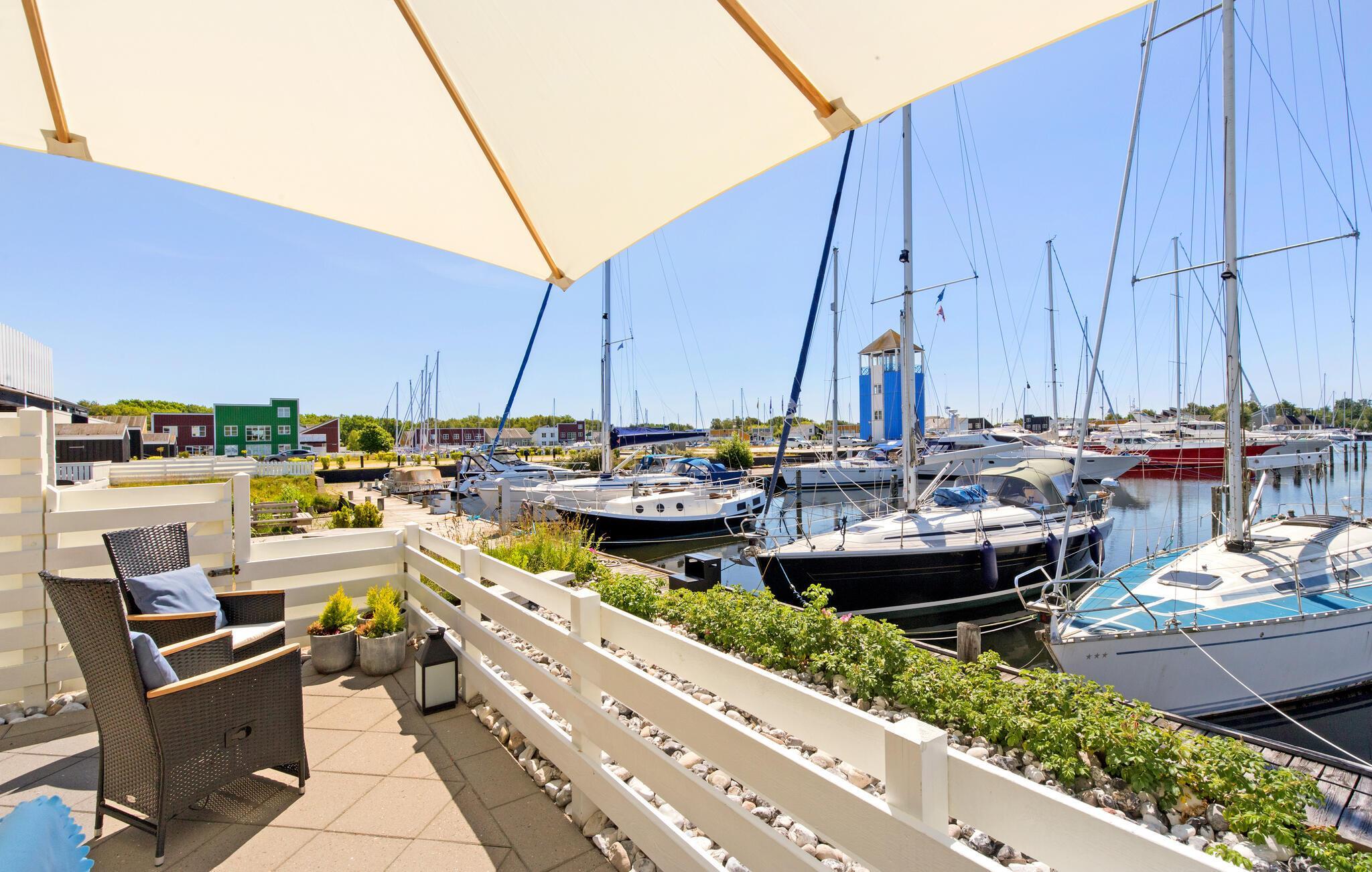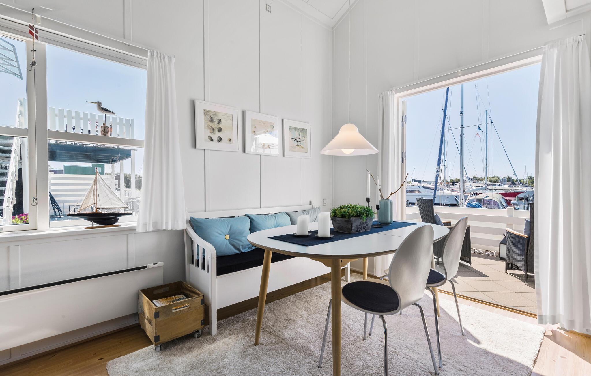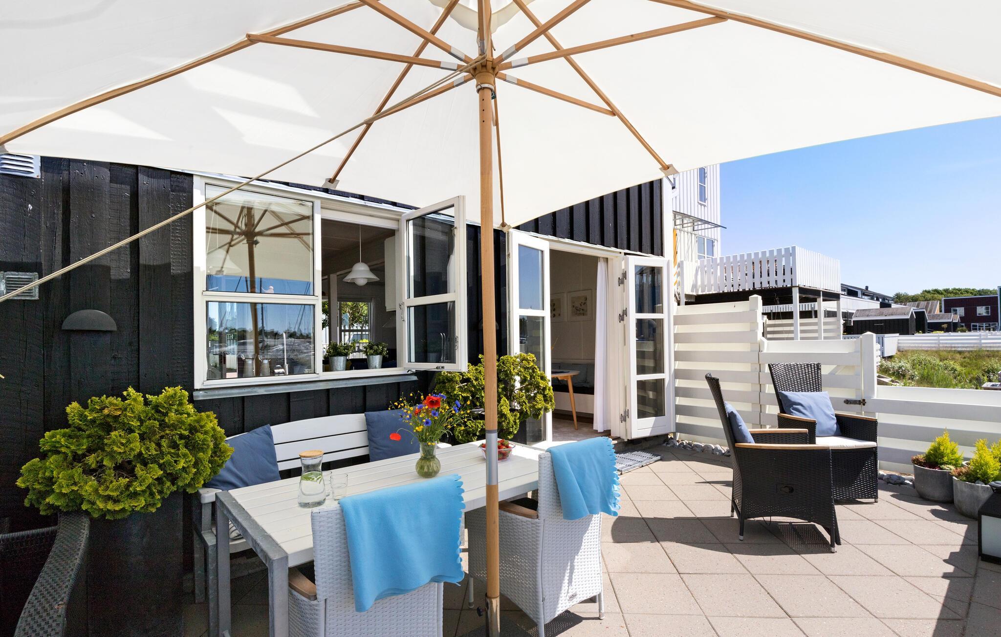 Feriehuset er indrettet med kvalitetsmøbler og sans for indbydende farver og sammensætning. Fra huset er der direkte udgang til en dejlig træterrasse, som er beliggende lige ud til det åbne havnebassin. Her kan solen og udsigten nydes det meste af dagen.