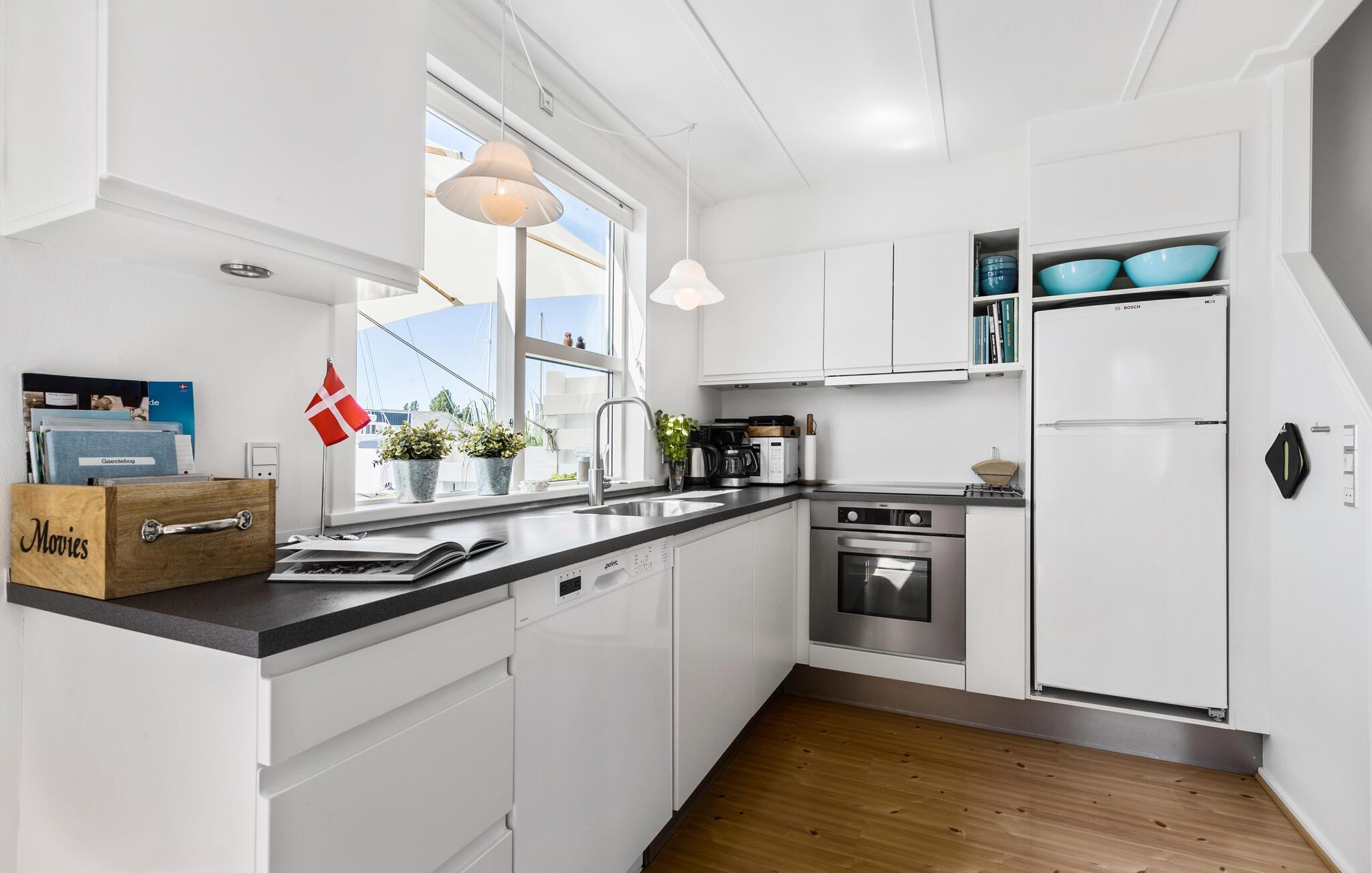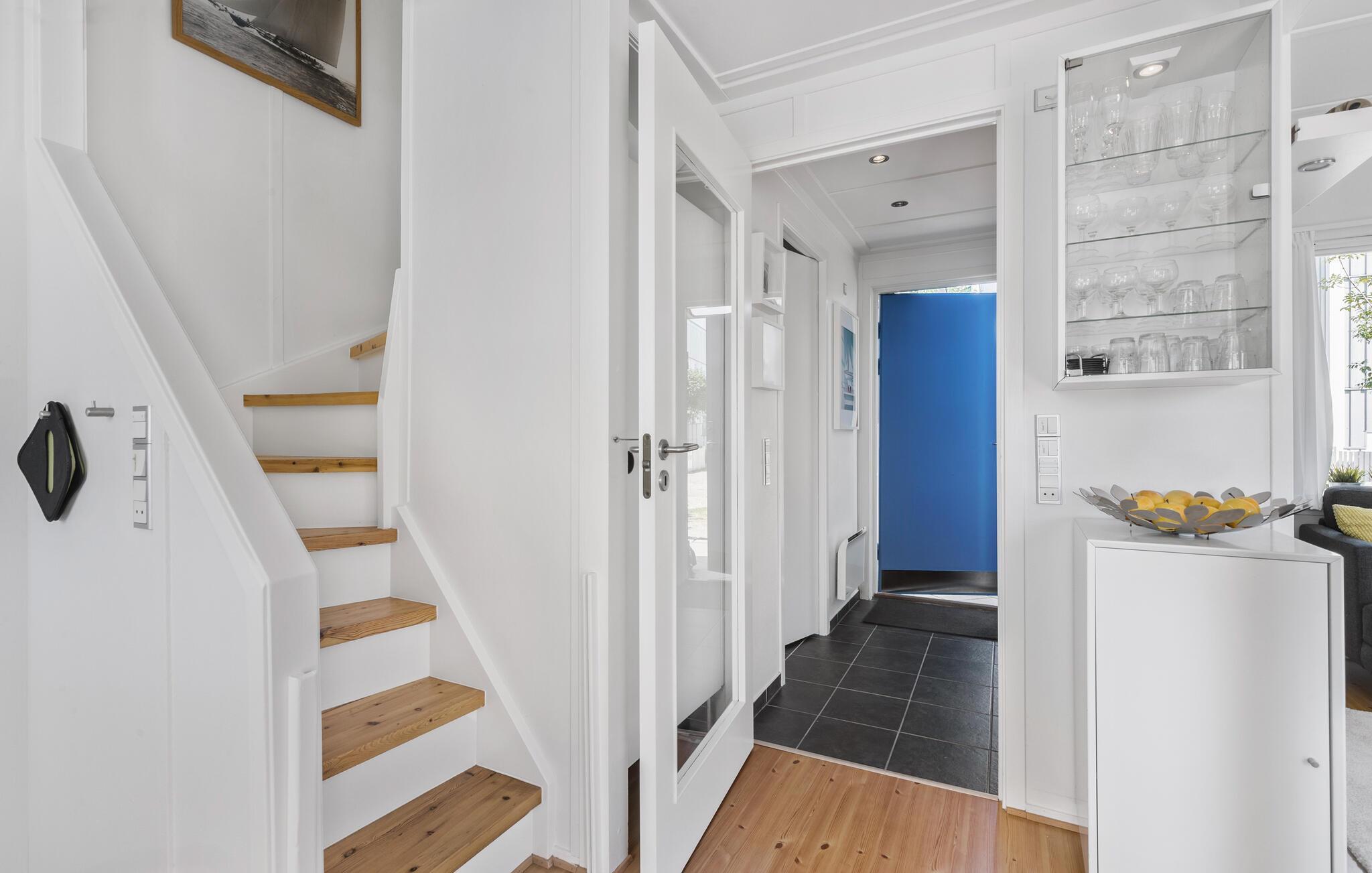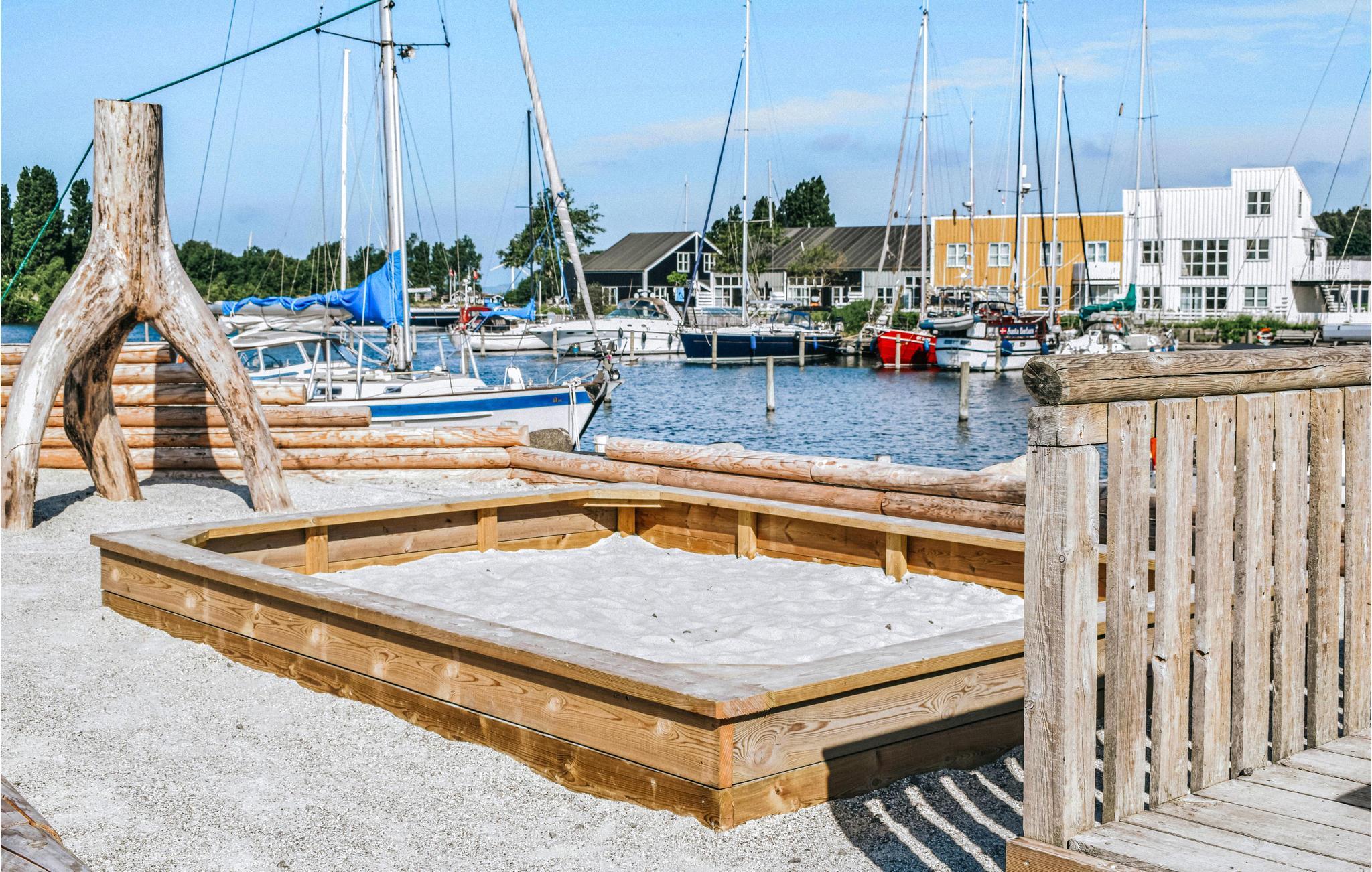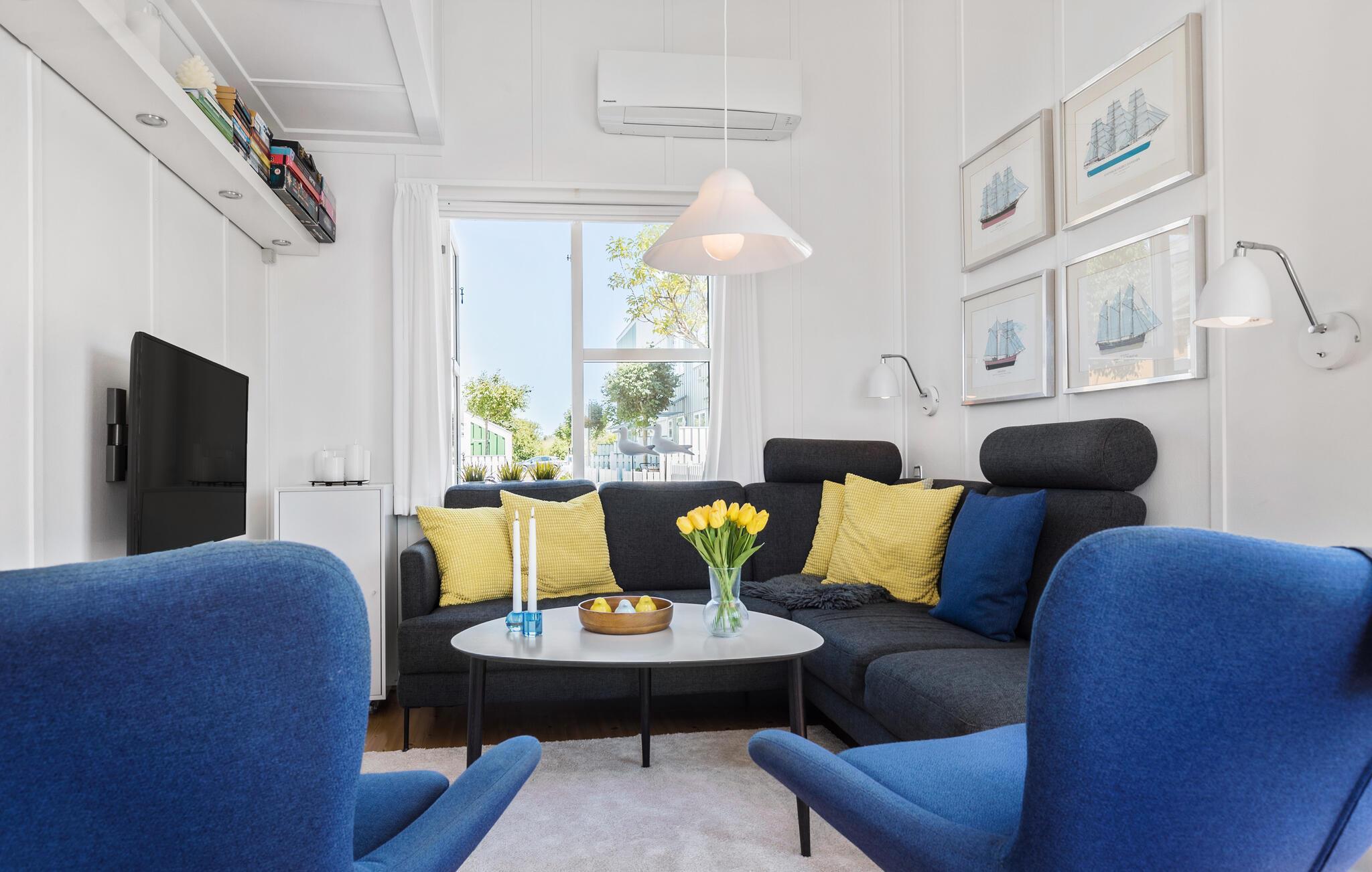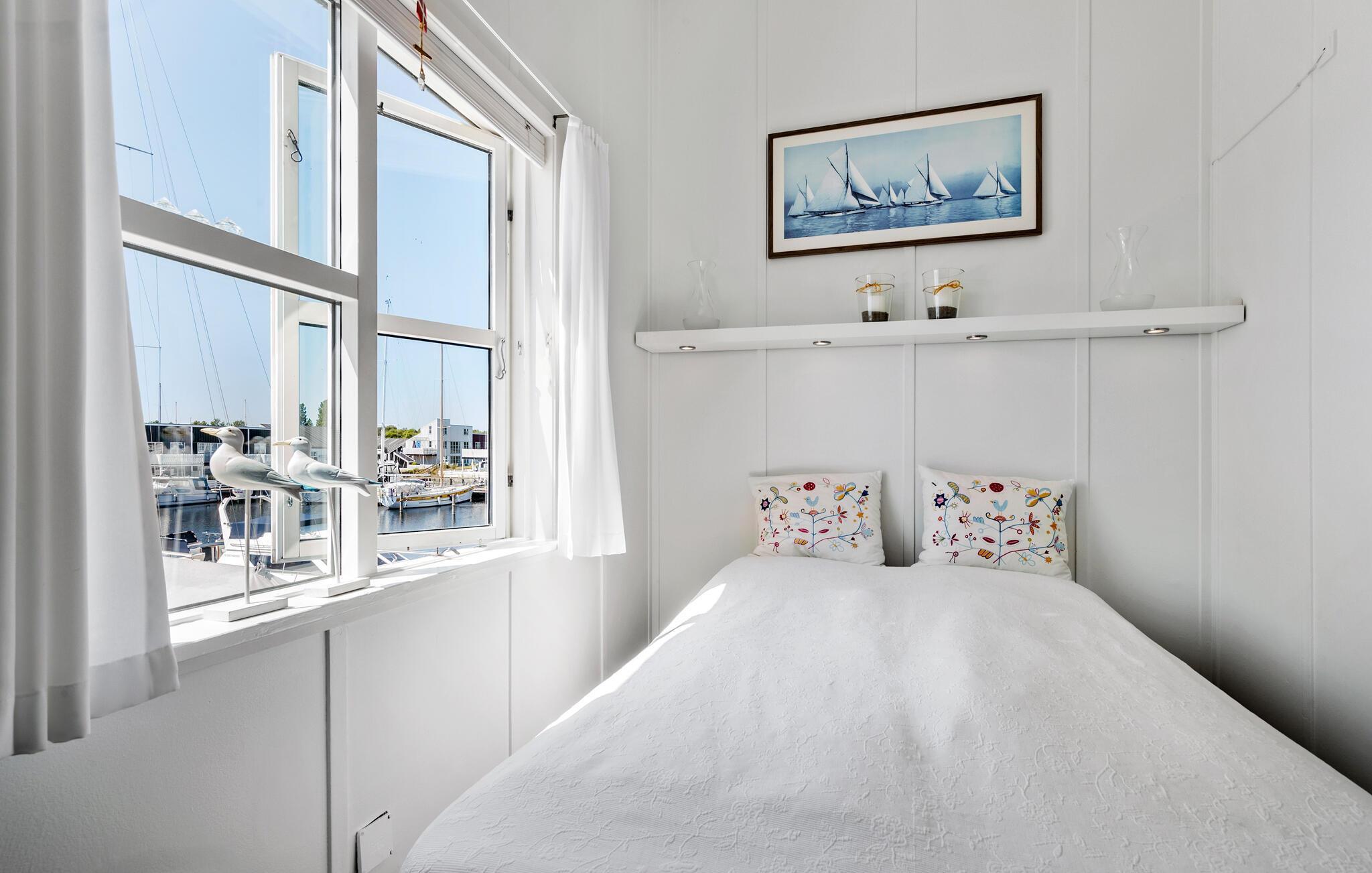 Feriehuset er indrettet med kvalitetsmøbler og sans for indbydende farver og sammensætning. Fra huset er der direkte udgang til en dejlig træterrasse, som er beliggende lige ud til det åbne havnebassin. Her kan solen og udsigten nydes det meste af dagen.