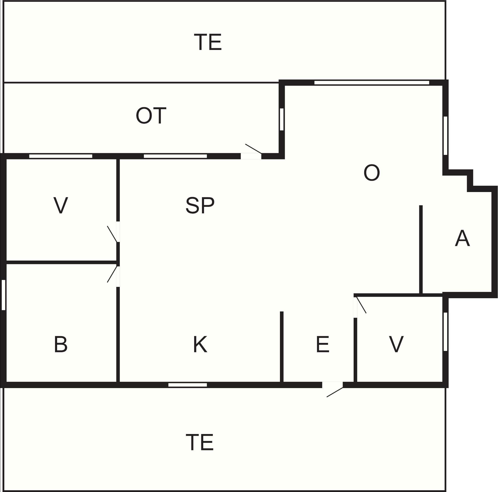 Stuen ligger i åben forbindelse med spiseafdeling og køkken, hvor der er udgang til endnu en terrasse. Der er to soveværelser med dobbeltseng og en alkove i stue med to opredninger. Badeværelse med bruser, toilet og vaskemaskine.