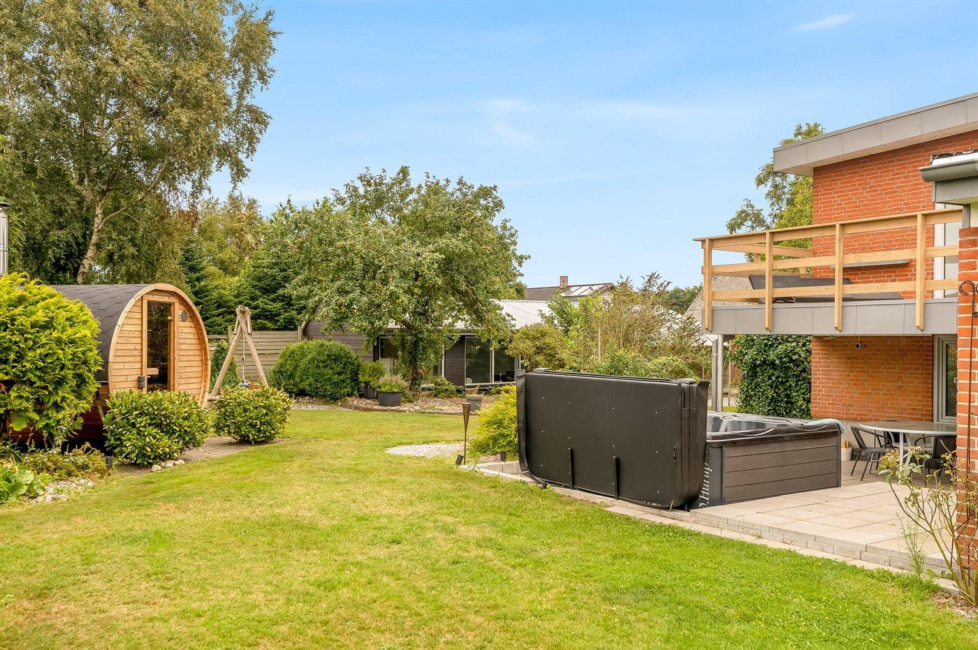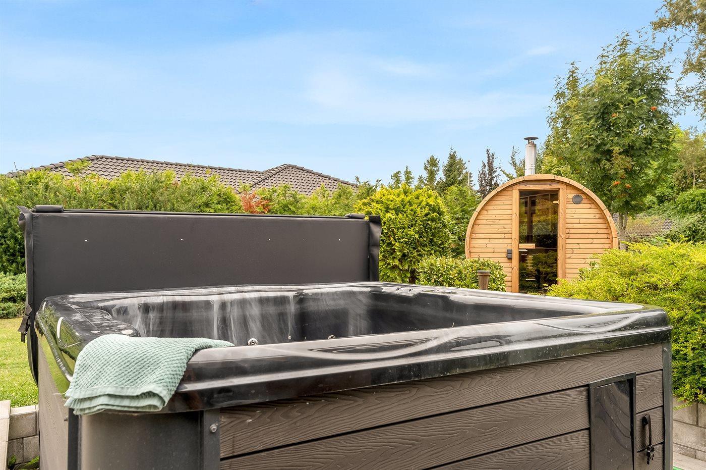 Udenfor venter en verden af velvære og afslapning. En imponerende tøndesauna og et dejligt udendørs spabad giver mulighed for at nyde velvære under åben himmel. Dette er det perfekte sted at koble af og skabe minder med hele familien.