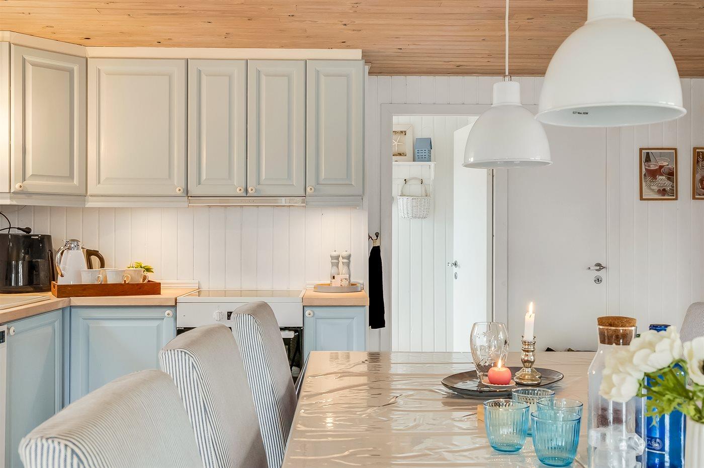 Køkkenet er udstyret med 1 køleskab. Der er 4 induktionskogeplader, varmluftovn samt opvaskemaskine.