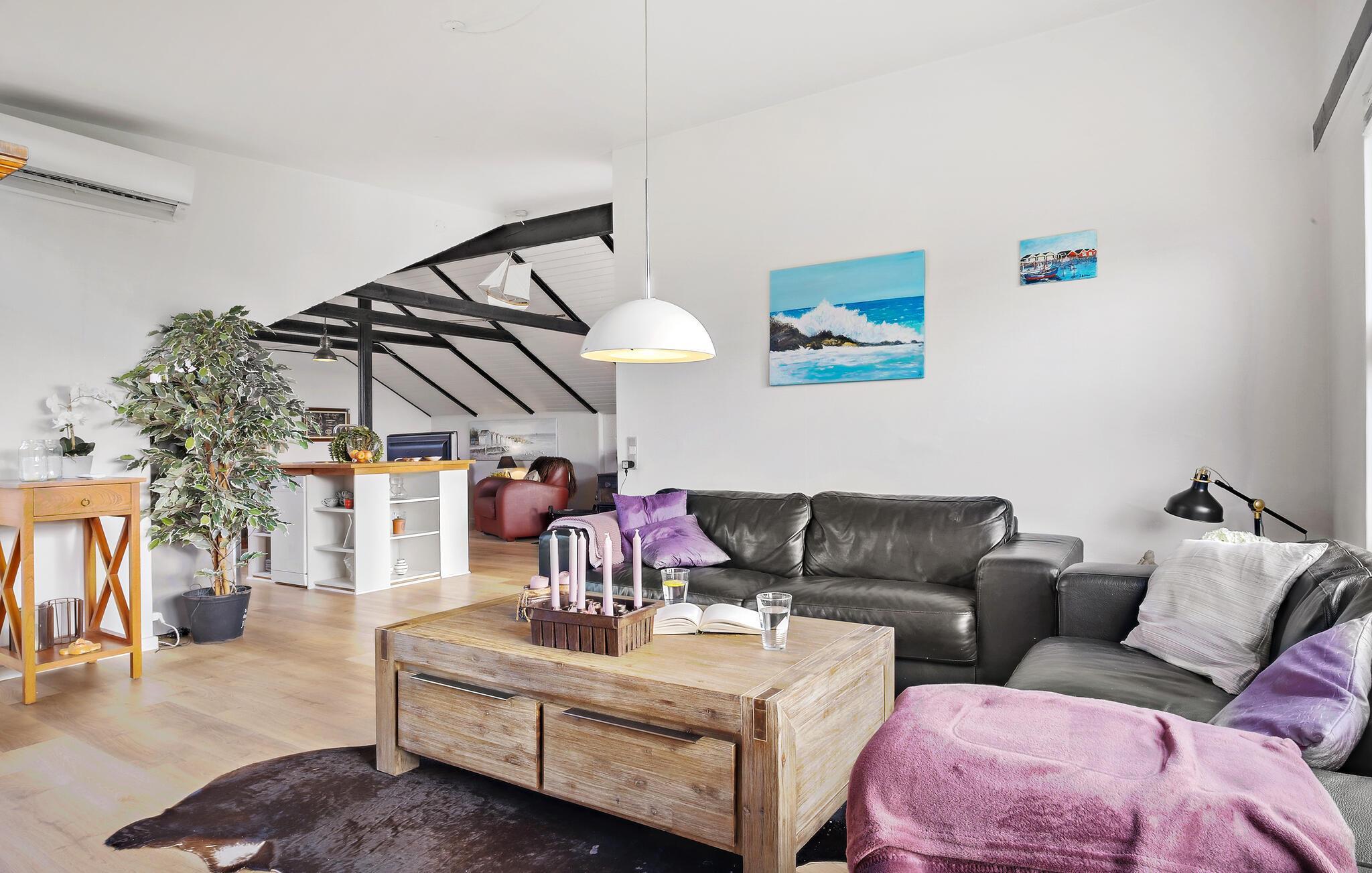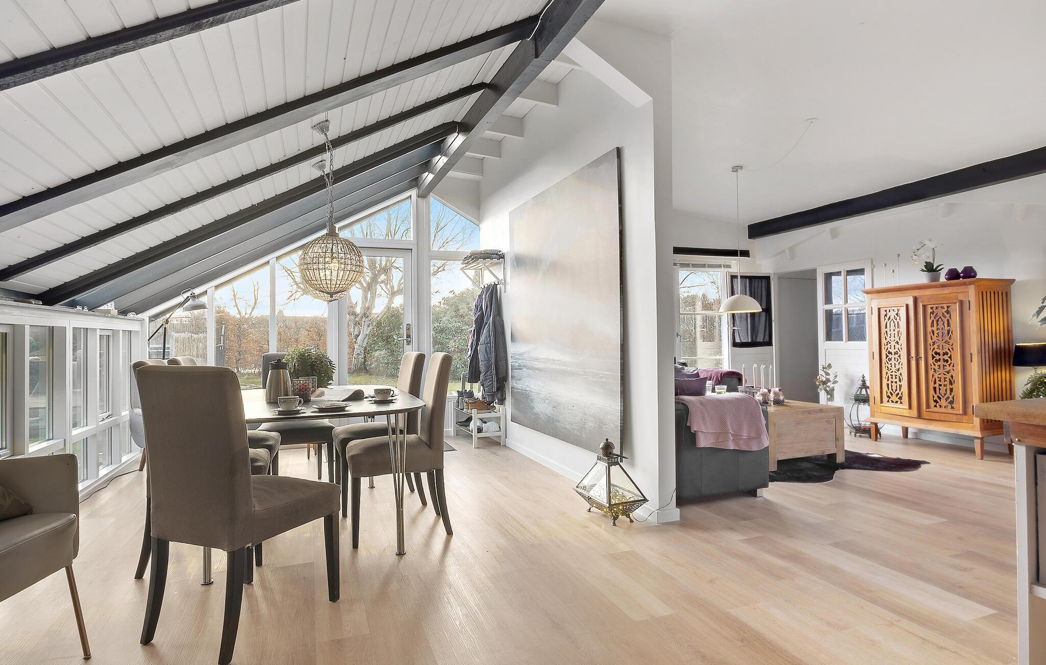 Hyggeligt feriehus i Øster Hurup nær Kattegat med træbjælker og åben planløsning, perfekt til familieferie.