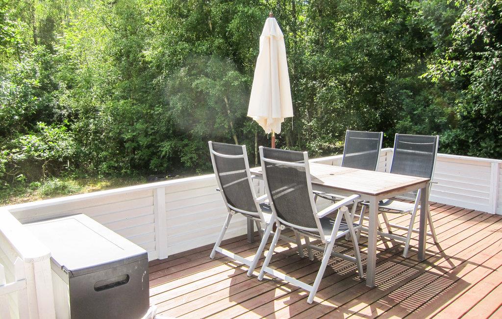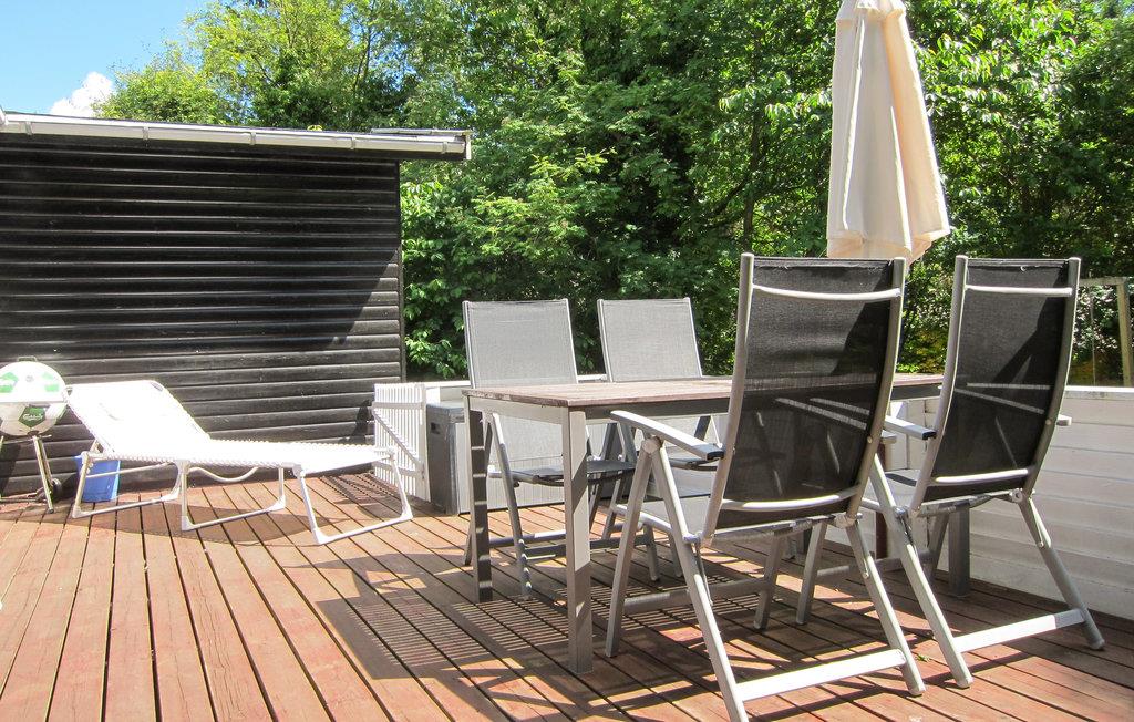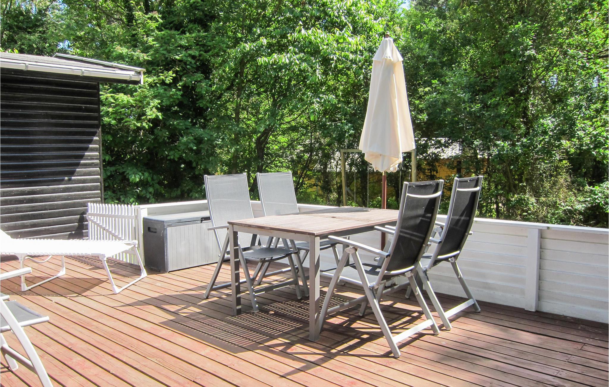Til huset hører en dejlig træterrasse med havemøbler - herunder liggestole til solbadning - og en grill til hyggelige grillaftener. Haven tilbyder god plads til leg og boldspil for børnene.