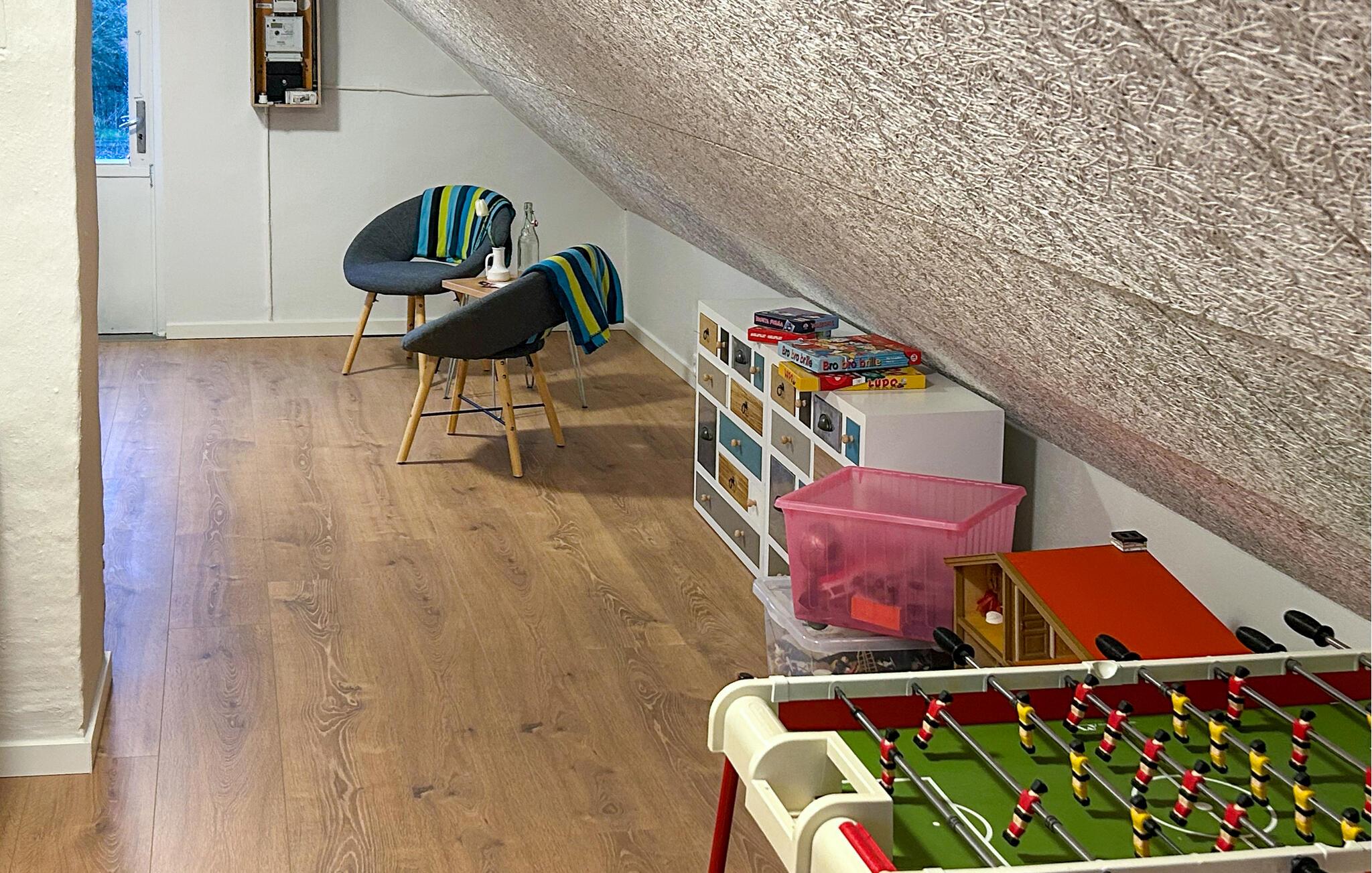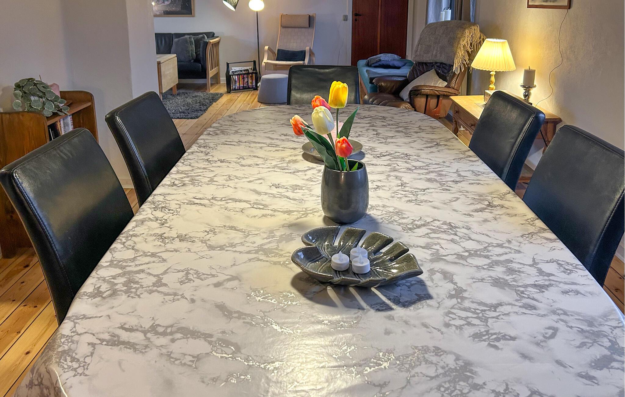 Dette sommerhus giver jer gode rammer til at slappe af og nyde feriedagene i et dejligt område. Find jer godt til rette i den rummelige opholdsstue. Trægulvene og de velvalgte møbler skaber en hyggelig atmosfære. Efter dagens oplevelser kan I slappe af i sofaen og lænestolene, læsr en bog eller se en film. Den tilstødende spiseplads lægger op til skønne måltider, som I kan tilberede i det praktiske køkken.