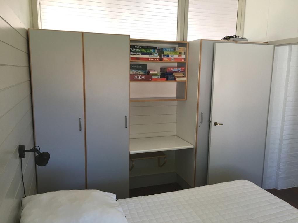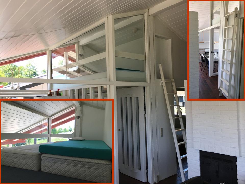 Insgesamt verfügt das Ferienhaus über sechs Schläfplätze verteilt auf Zimmer mit Doppelbett und Zimmer mit vier Betten, davon ein Doppelbett und ein Etagenbett. Eine Leiter im Wohnzimmer führt zum gemütlichen Loft, das bei Kindern sehr beliebt ist. Das Badezimmer in hellen Farben ist mit Dusche ausgestattet.
