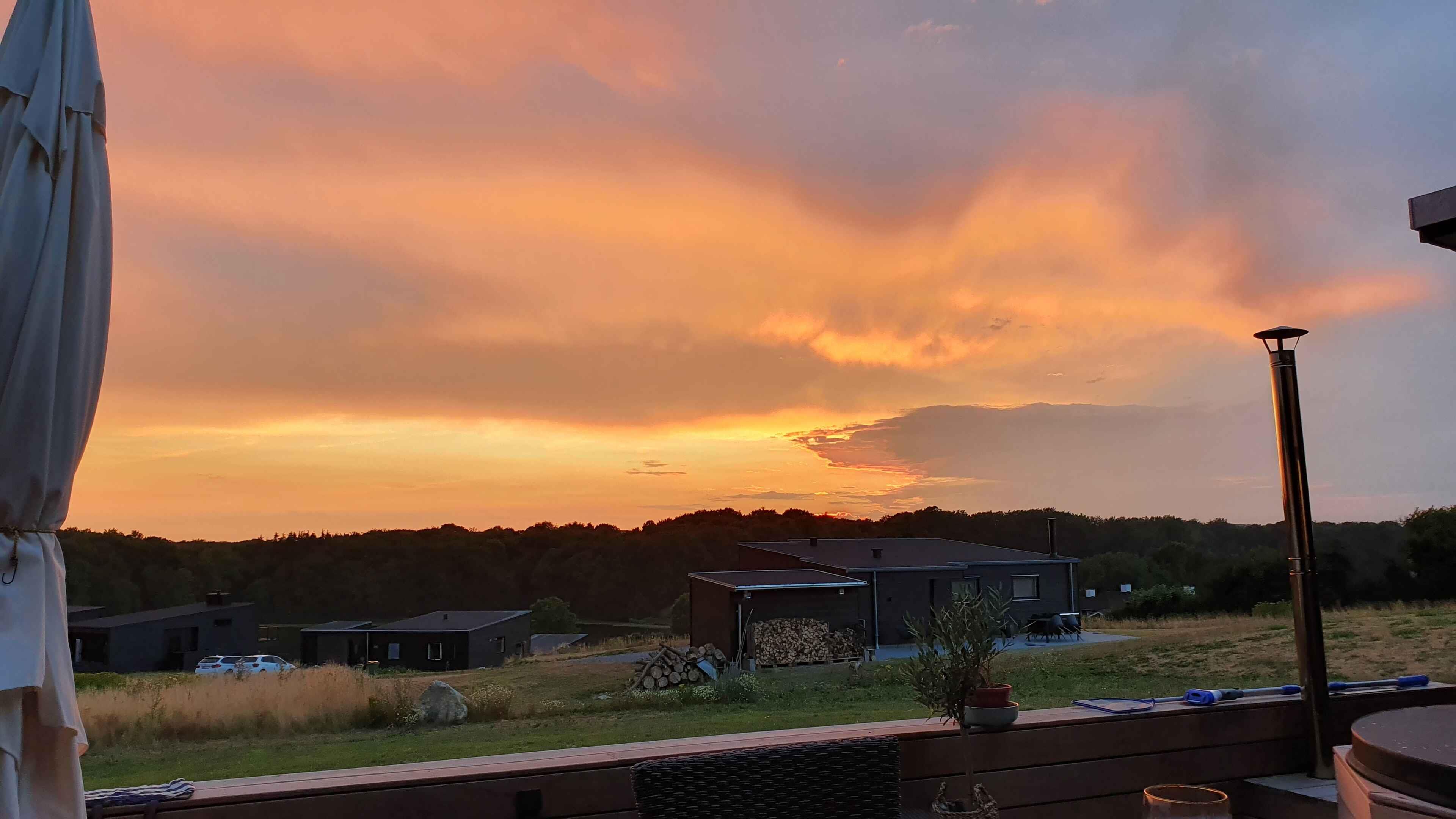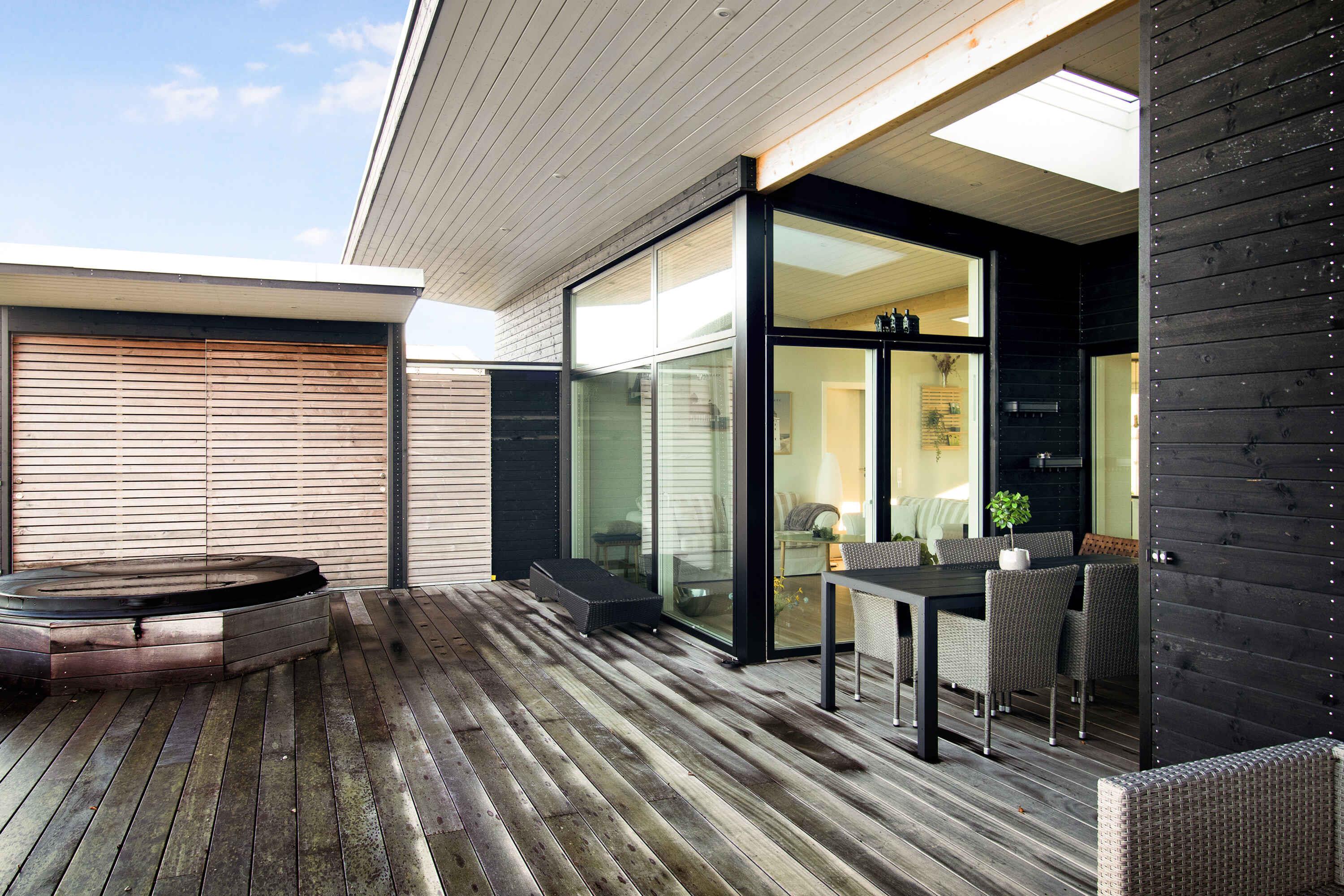 Nyt topmoderne sommerhus på 100m2 med lækker træterrasse, vildmarksbad og fantastisk panoramaudsigt over skov og landskab, beliggende kun 400 m fra vandet. Plads til i alt 4 personer.
