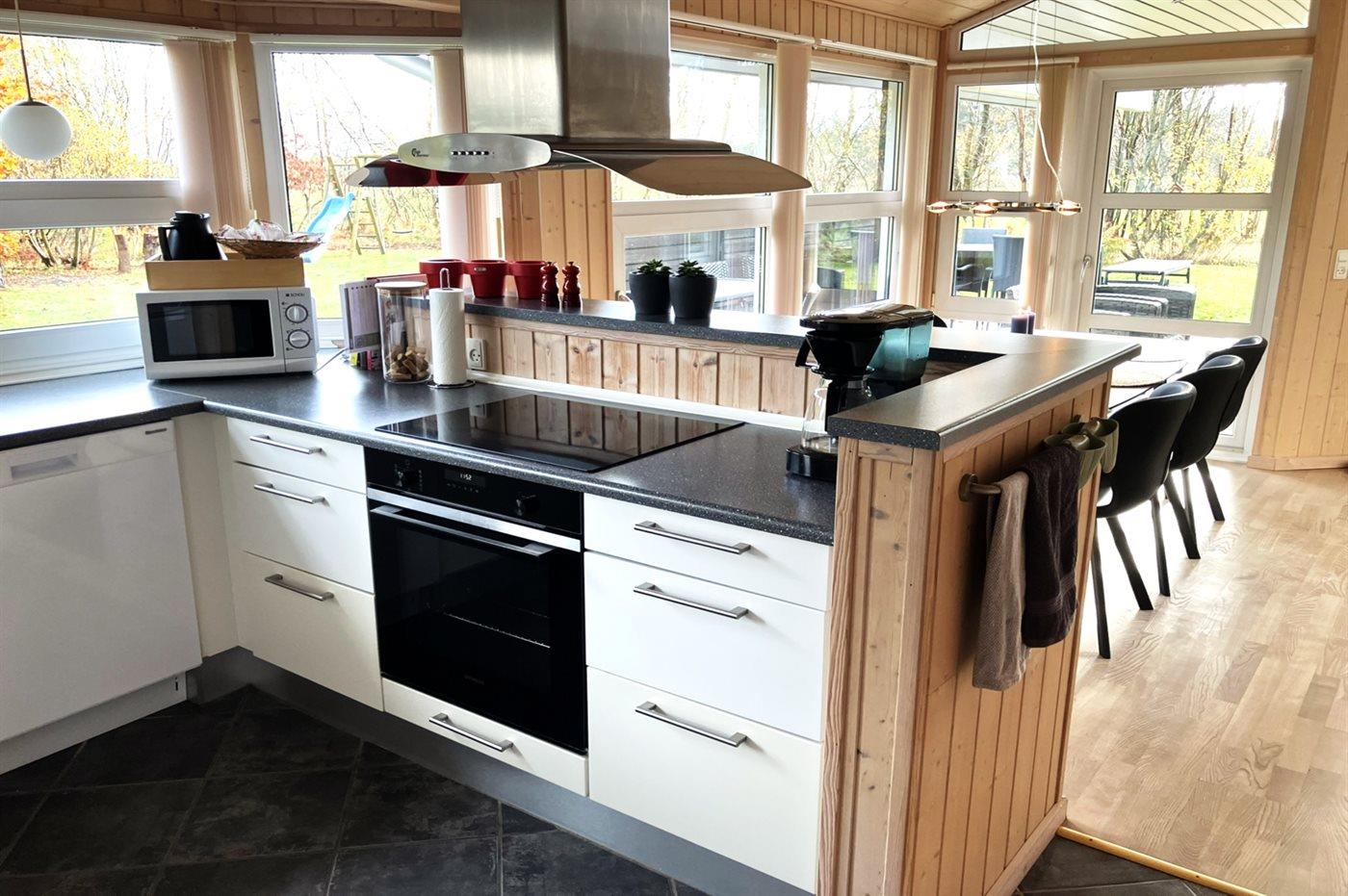 Køkkenet er udstyret med 1 køleskab. Der er 4 keramiske kogeplader, varmluftovn, mikrobølgeovn samt opvaskemaskine.