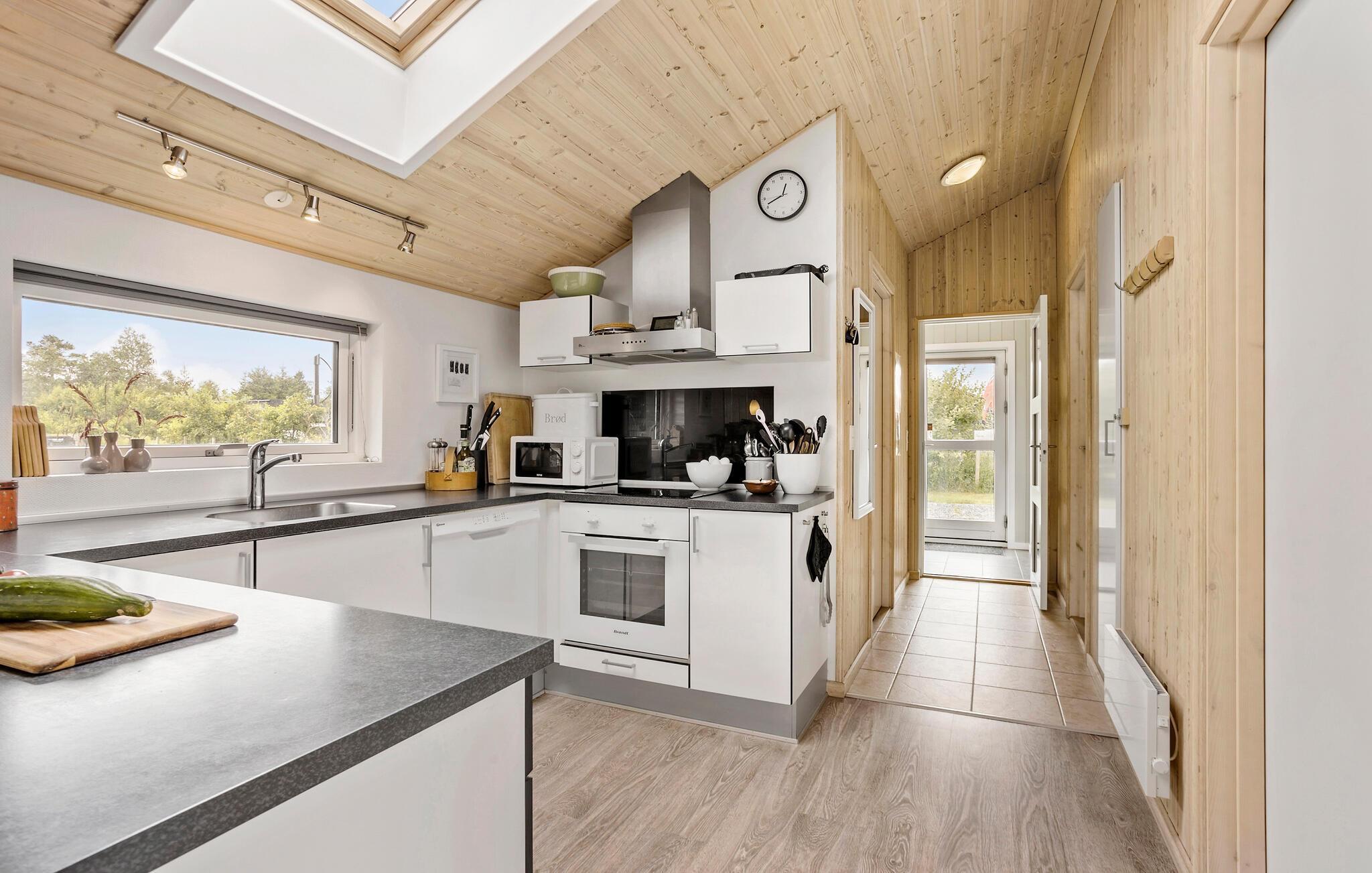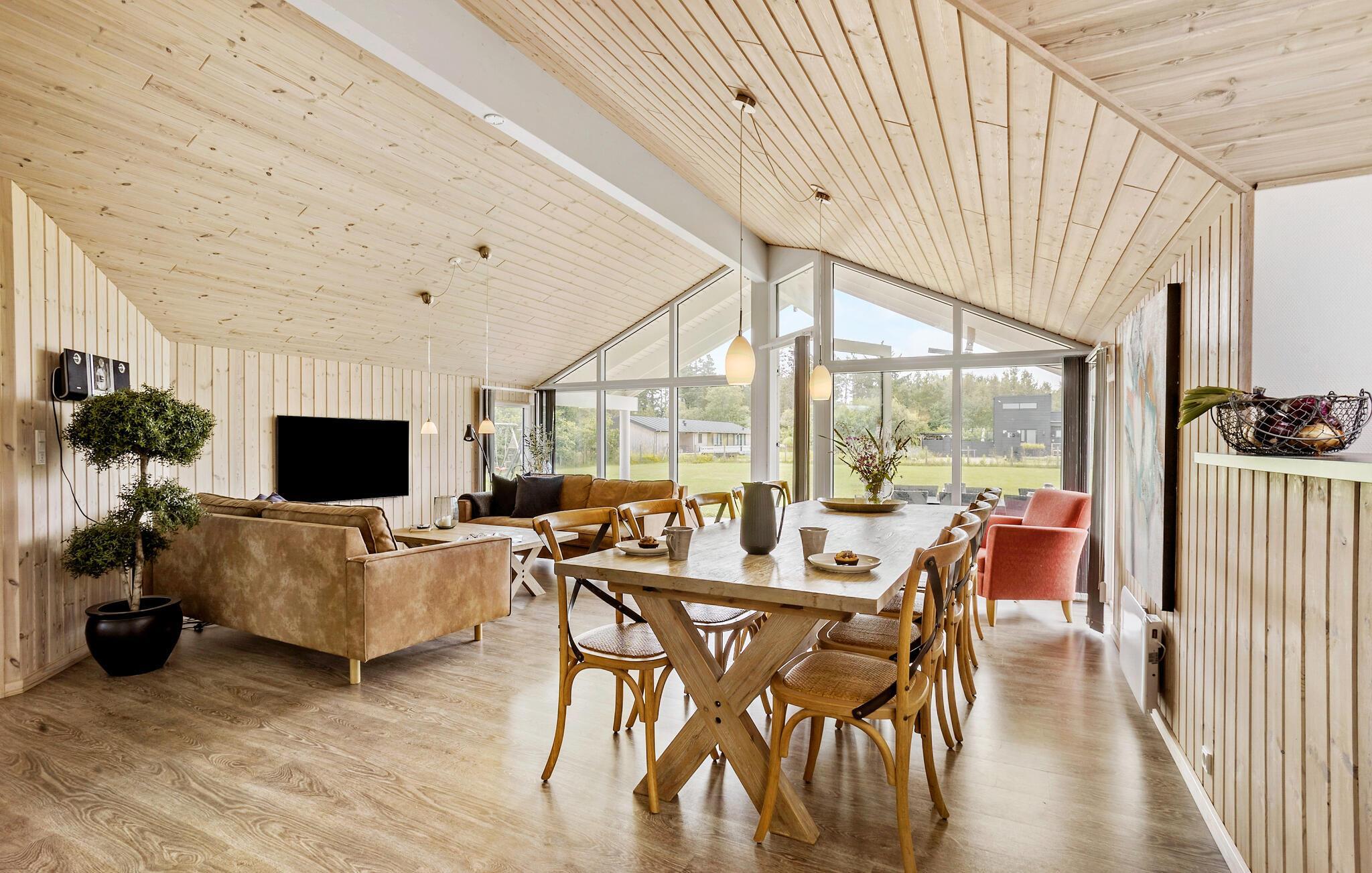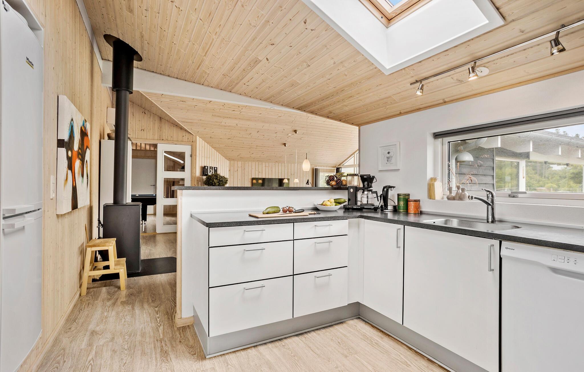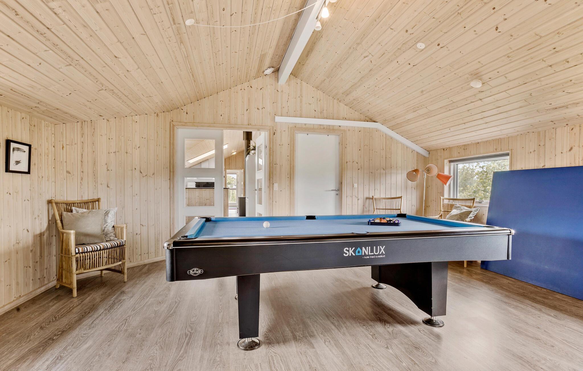 Velkommen til dette rummelige sommerhus i det nordjyske. Huset er indbydende med højt til loftet og store vinduer, som lukker en masse naturligt lys ind. Her kan I starte dagen med en lækker familiemorgenmad, lægge en plan for dagen inden I drager ud på nye ferieoplevelser. I det lyse køkken kan I lave dagen aftensmad og nyde det rundt om det flotte spisebord eller hvis vejret er godt, kan I dække op på bordet på terrassen. På køligere dage kan I fyre op i brændeovnen og spille spil sammen i stuen. Hvis I skal have lidt mere sved på panden, kan I dyste mod hinanden i billiard i aktivitetsrummet.