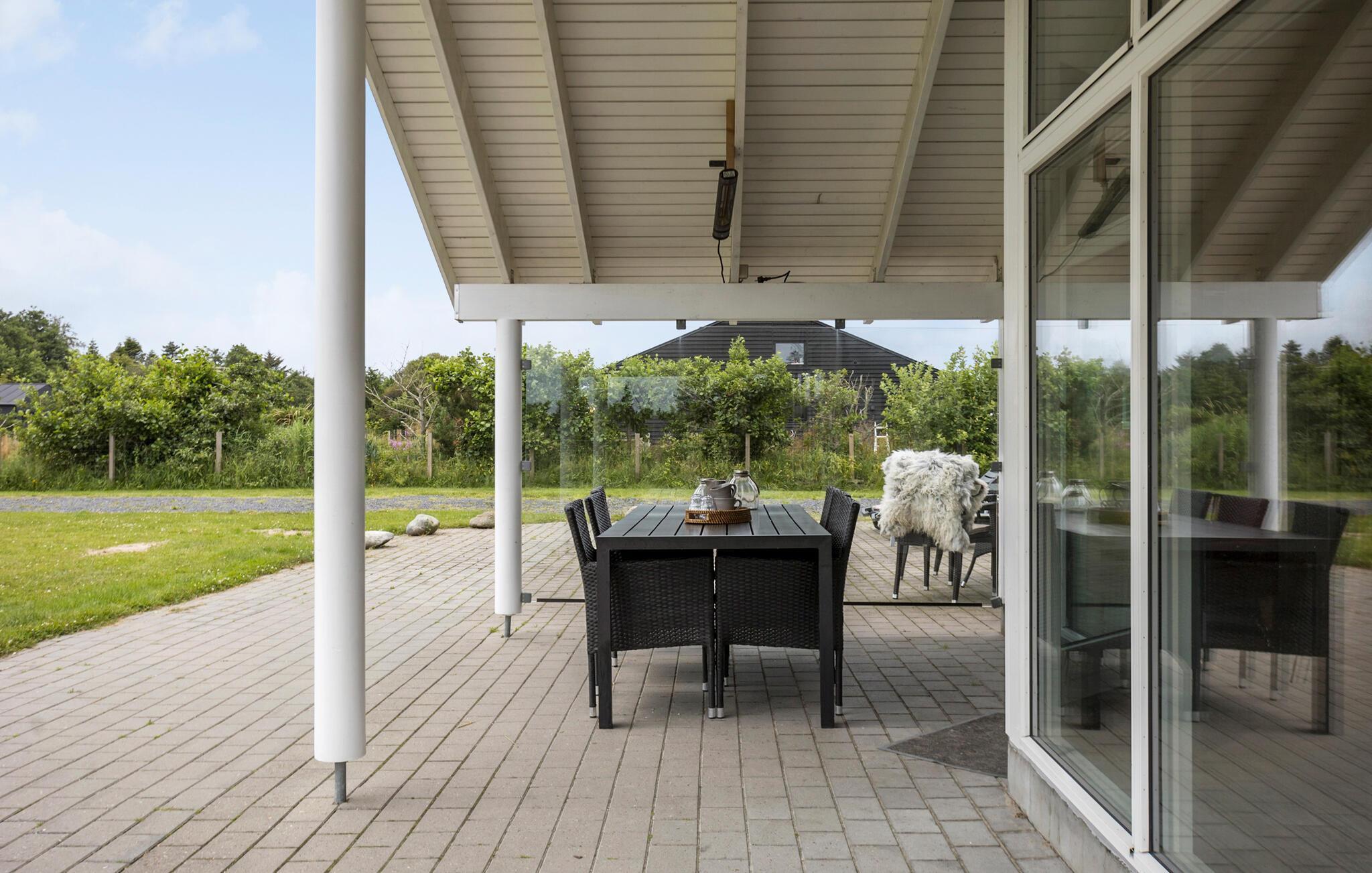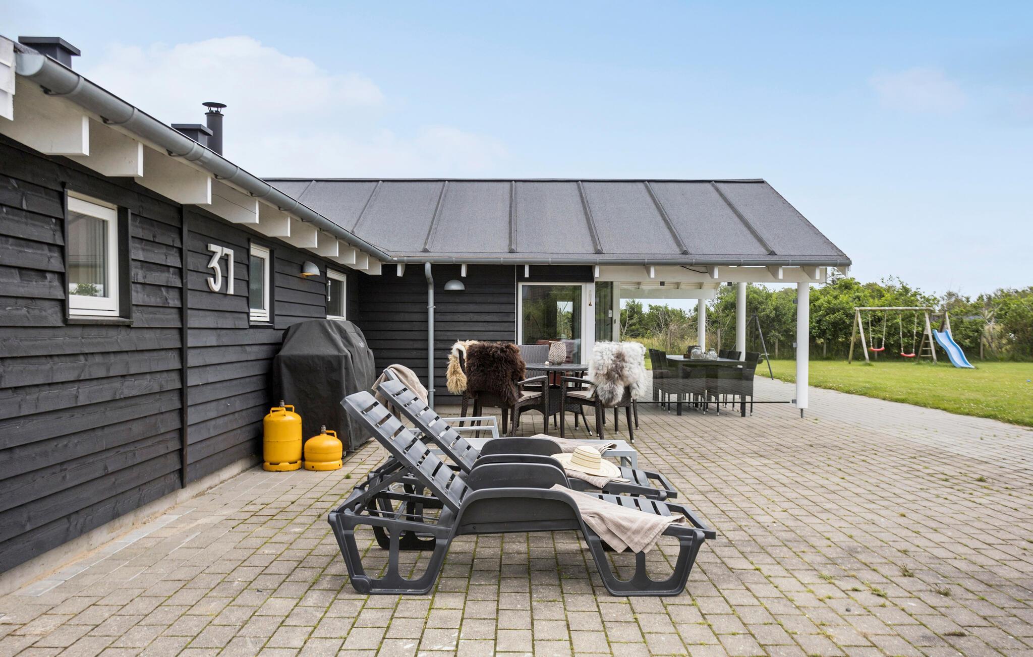 Udover at nyde aftensmaden på terrassen, kan I grille i løbet af dagen mens børnene leger i haven. Her er aktiviteter for både store og små, såsom gynge, sandkasse og fodboldmål. Terrassen er delvis overdækket, så I kan nyde de lange sommeraftener uanset om duggen kommer.