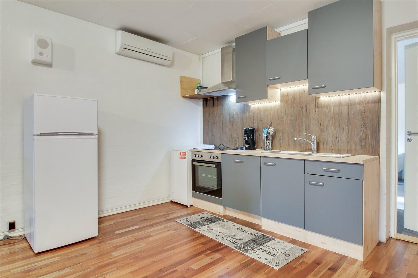 Køkkenet er udstyret med 1 køleskab. Der er 4 keramiske kogeplader, varmluftovn, mikrobølgeovn samt opvaskemaskine.
