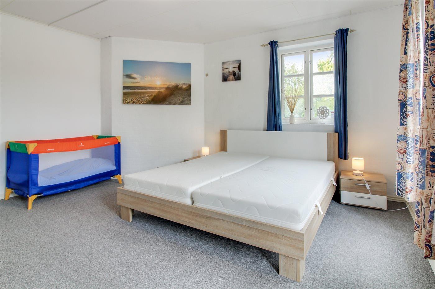 Der er i alt 2 soveværelser. Sovepladserne fordeler sig på: 2 sovepladser i dobbeltseng. 2 sovepladser i enkeltsenge. Derudover er der 1 stk. barneseng.