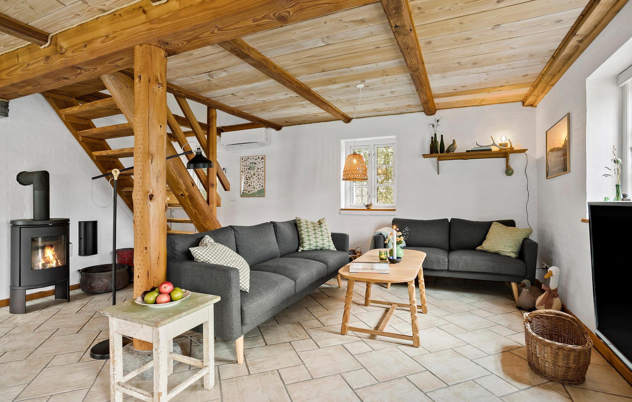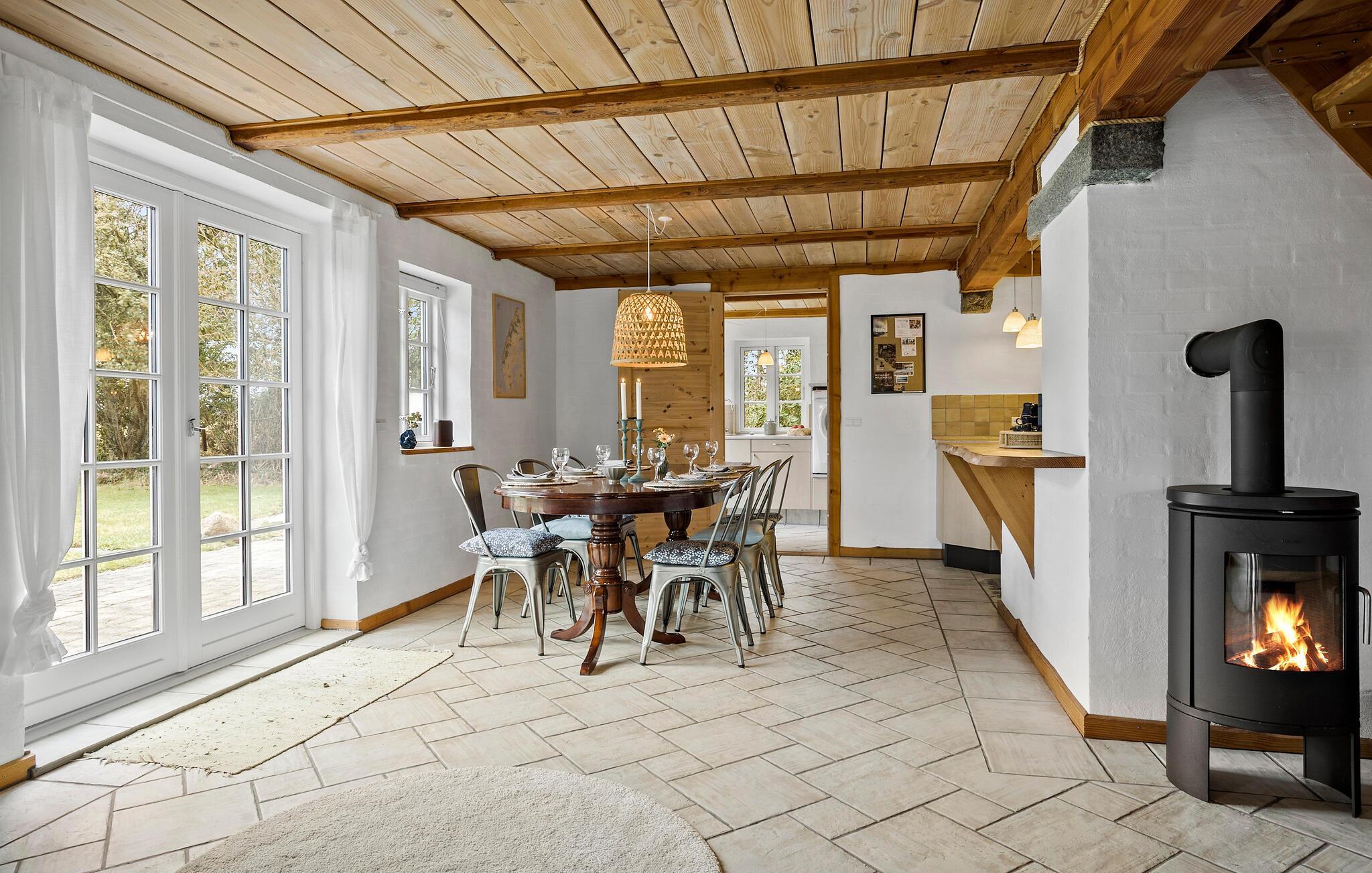Huset ligger i særdeles flotte omgivelser kun minutters gang fra Krik Vig, og derfor er det den helt rette bolig for jer, der søger en ferie med fred, ro og masser af smuk natur. Huset er flot indrettet over to etager med et vellykket mix af rustikke træelementer og moderne faciliteter, der gør det nemt at sænke skuldrene og slappe af efter en aktiv feriedag. Køkkenet er stort og veludstyret, så gør madlavningen til et sjovt fællesprojekt, inden I dækker op til middagen ved det fine spisebord af træ. Tænd op i brændeovnen og nyd dens varme knitren, der giver det helt rette lydtapet til sofahygge med brætspil eller en god film til langt ud på aftenen.