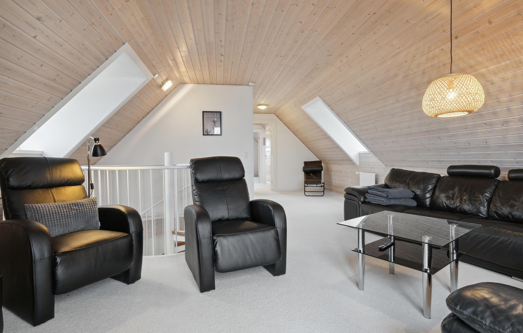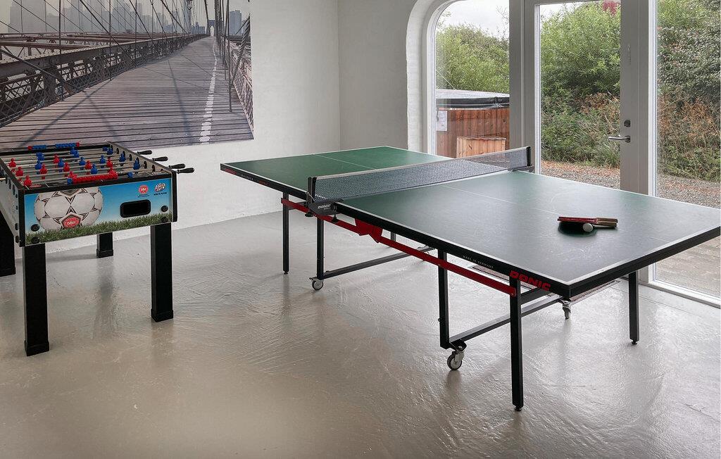 Oplev hyggelige timer med familien og nyd den unikke beliggenhed. Træd ind i den lyse opholdsstue med sofaer, store vinduer og en åben planløsning. Gør det behageligt og nyd den varme atmosfære. Brug den rummelige spiseplads til fælles måltider, og lav mad i køkkenet med rigelig bordplads. Gåop ad vindeltrappen til øverste etage, hvor endnu en opholdsstue venter på jer med komfortable sofaer og udsigt over vandet. Spil bordtennis eller bordfodbold i det separate aktivitetsrum og tilbring timevis med underholdning.