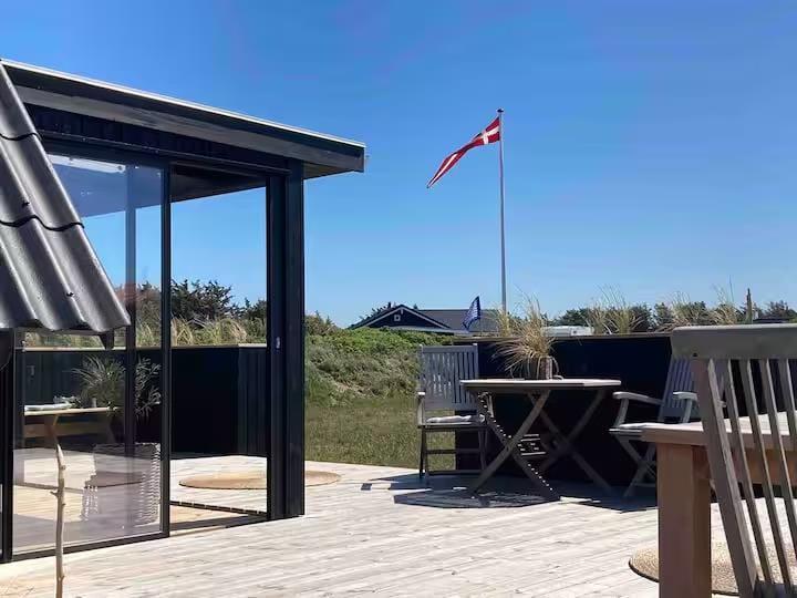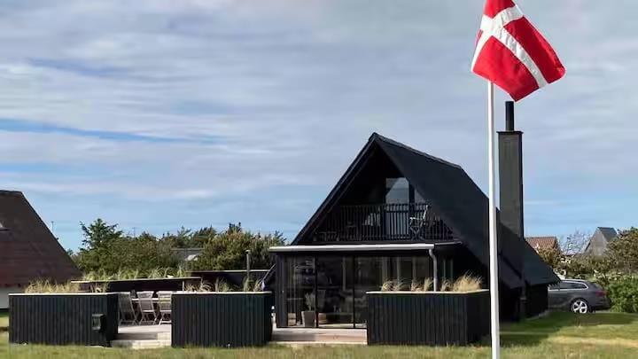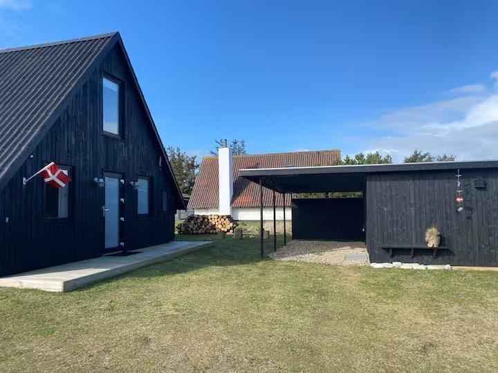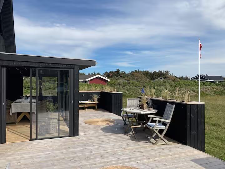 Allerede når du træder ind i huset, mærker du, hvordan æstetik og komfort går hånd i hånd. Det karakteristiske A-formede design skaber højt til loftet og en luftig rumfornemmelse, mens de lyse materialer og den smagfulde indretning giver en rolig og indbydende stemning. Her er kræset for detaljerne, og du vil hurtigt opdage, hvordan de små finesser – fra de smukt afstemte farver til den hyggelige belysning – er med til at gøre ferien lidt ekstra særlig. Om aftenen samles I måske i sofaen med et spil eller en god film, mens ilden fra brændeovnen knitrer og varmer stuen op – eller du nyder bare stilheden og en kop te med udsigt til klitternes bølgende landskab.