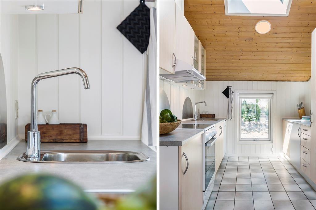 Der er også god plads til leg og afslapning ude i det fri på den store grund. På græsplænen kan hele familien spille fodbold eller andre havespil, og hvis du trænger til en tilbagelænet pause, er det skønt at kunne trække sig tilbage på den lækre træterrasse, der breder sig rundt om huset. Det meste af terrassemiljøet er åbent, men der også et overdækket areal, der fungerer som den perfekte overgang mellem stuen og udearealet – for eksempel om aftenen, hvis I vil sidde i det fri, men samtidig i ly for dug og i læ for brisen fra havet.