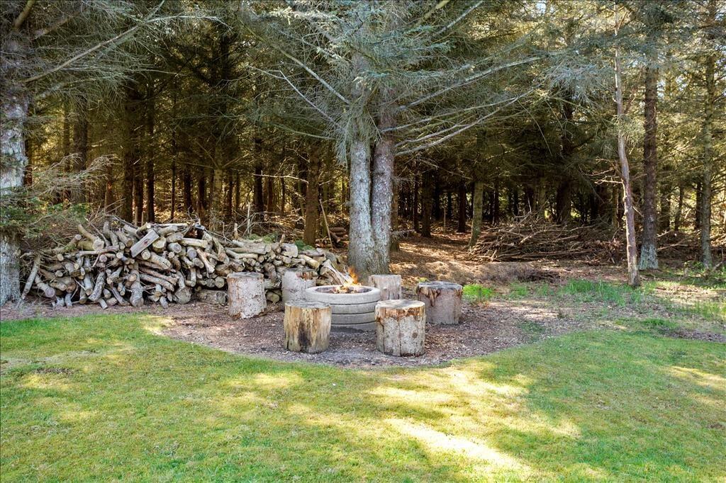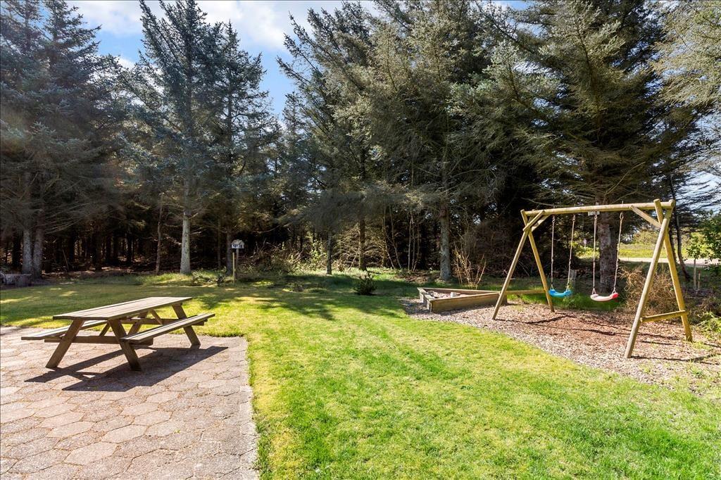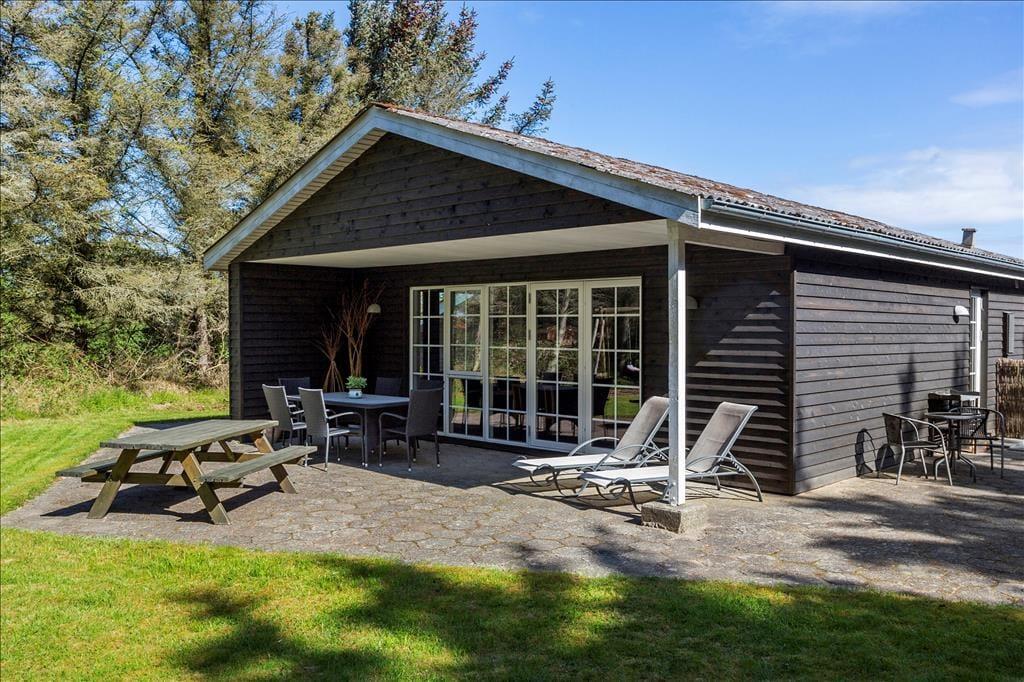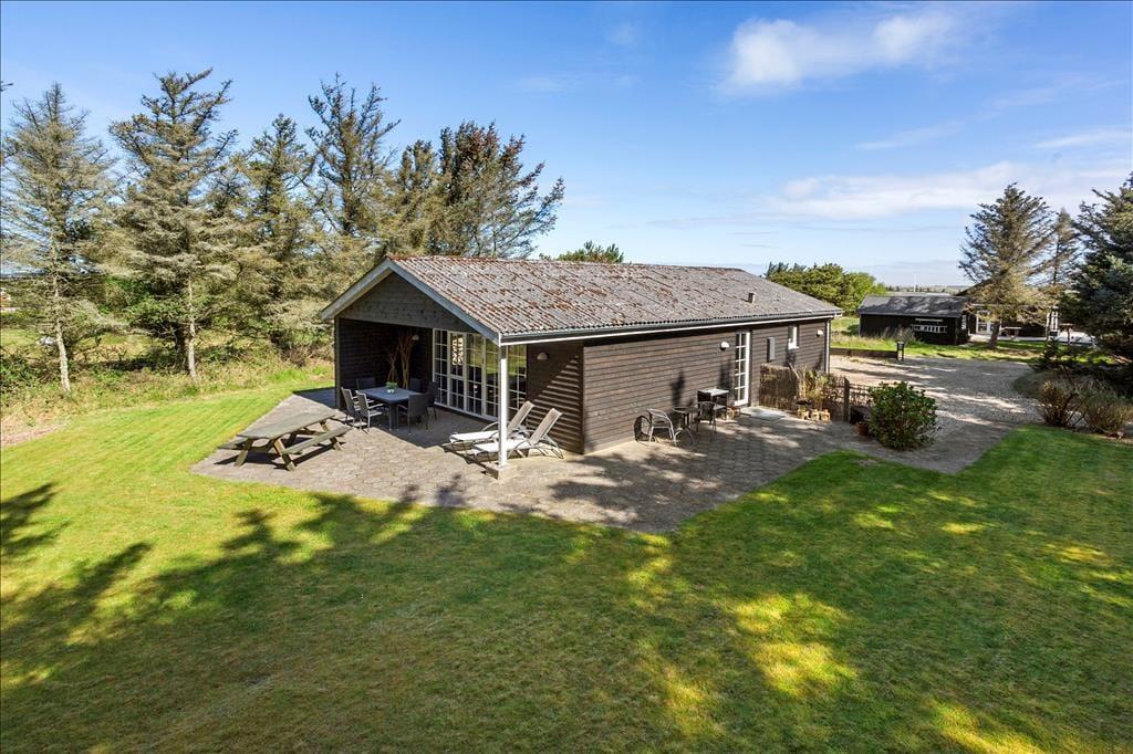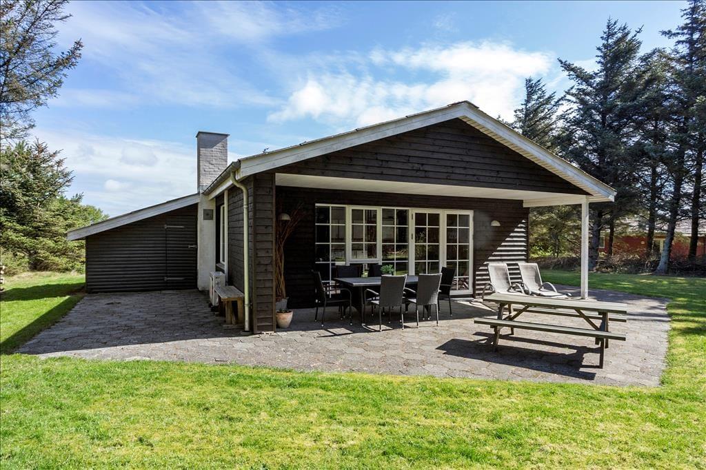 Udenfor finder du en skøn terrasse, der indbyder til både afslapning og hyggelige måltider i det fri. Terrassen er delvist overdækket, hvilket gør det muligt at nyde de lange sommeraftener, uanset om duggen falder, eller vinden blæser fra Vesterhavet. Den store have giver plads til både leg og fordybelse – perfekt for børnene eller en stille stund med en god bog. Området omkring huset er roligt og fredfyldt, og du kan hurtigt fornemme naturens nærvær, når fuglene kvidrer, og duften af havsalt når terrassen.