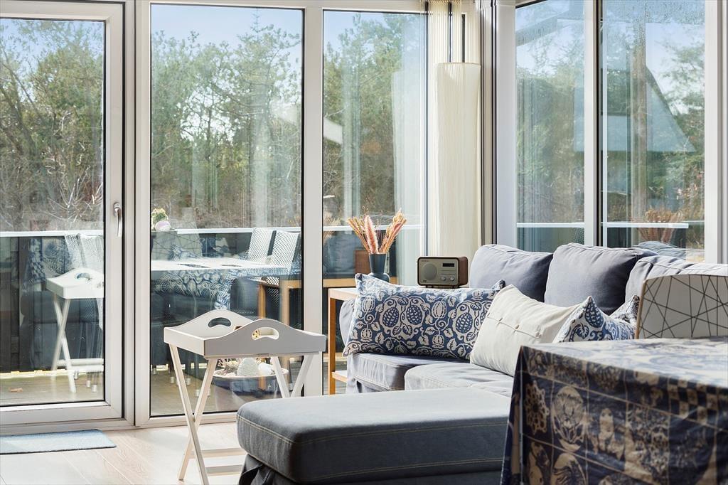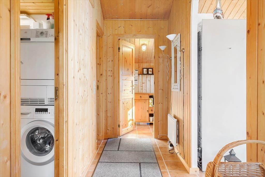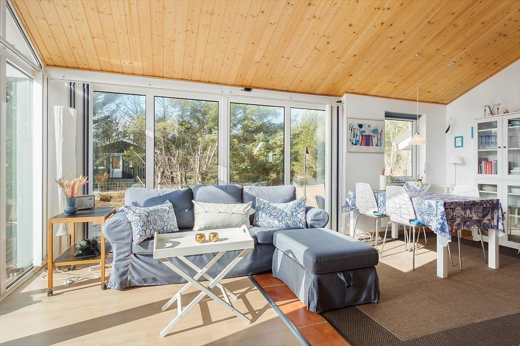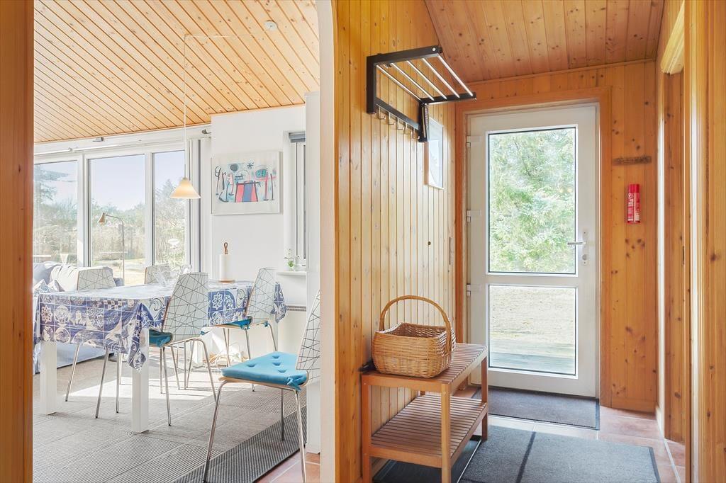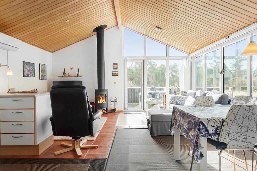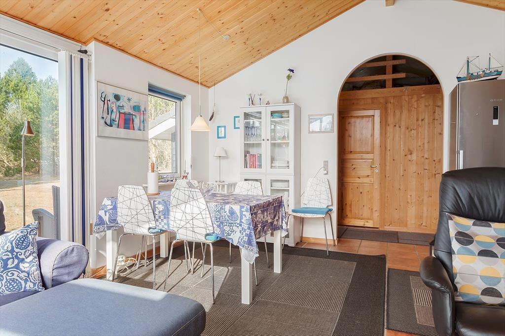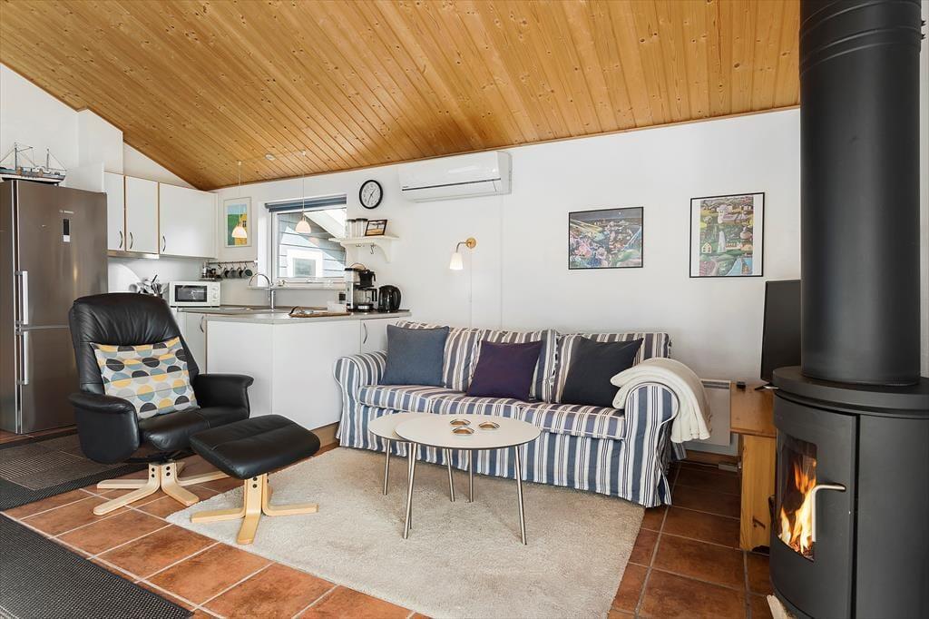 Når du træder ind i sommerhuset, bliver du mødt af en lys og venlig indretning, der skaber en følelse af hjemlig hygge. Stuen er indrettet med komfortable møbler, hvor du kan slappe af efter en dag ved havet. På kølige aftener sørger brændeovnen for en skøn, knitrende varme, der indbyder til afslappede stunder med en god bog eller et spil kort. Køkkenet er åbent og funktionelt, så I let kan samles om madlavningen og nyde et godt måltid sammen ved spisebordet. Hele huset er velholdt og pænt indrettet, hvilket gør det til en dejlig ramme om jeres ferie.