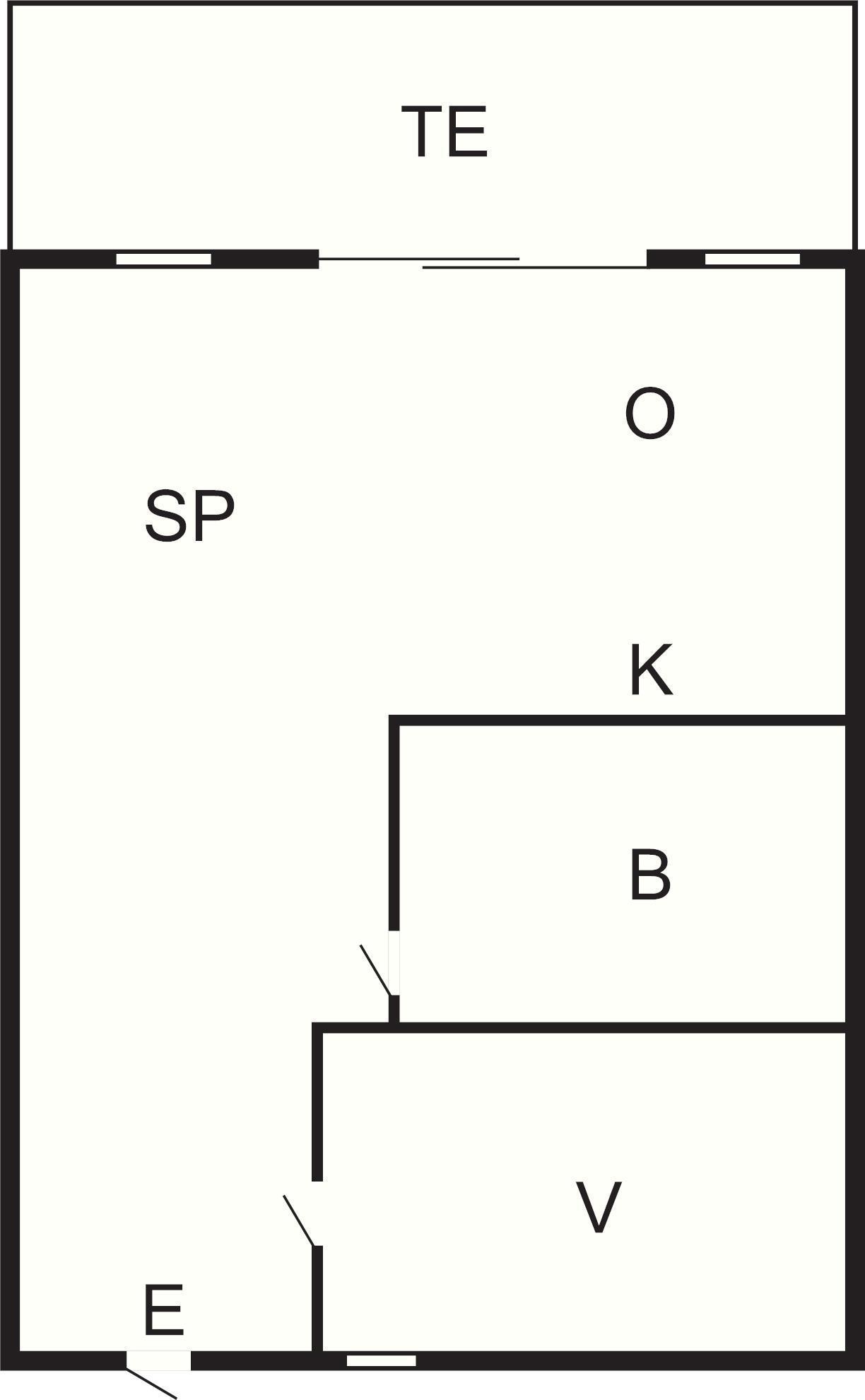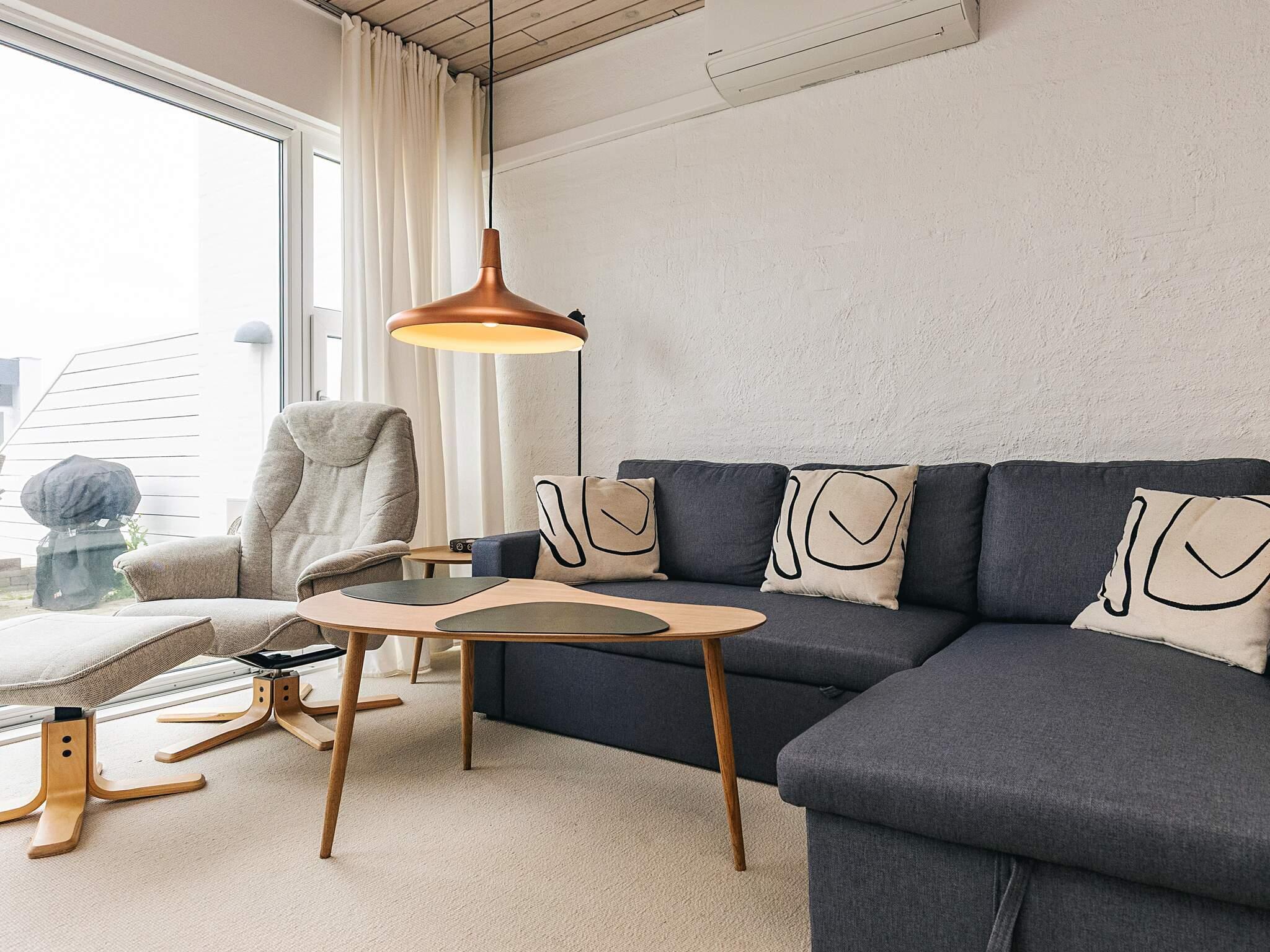 Stuen har godt lysindfald fra de store vinduespartier ud mod den private terrasse. I stuen er der en sovesofa, der kan klappes ud til 2 personer (ca. 140 x 200 cm). Der er soveværelse med to enkeltsenge på 90 x 200 cm, som kan skubbes sammen til en dobbeltseng.