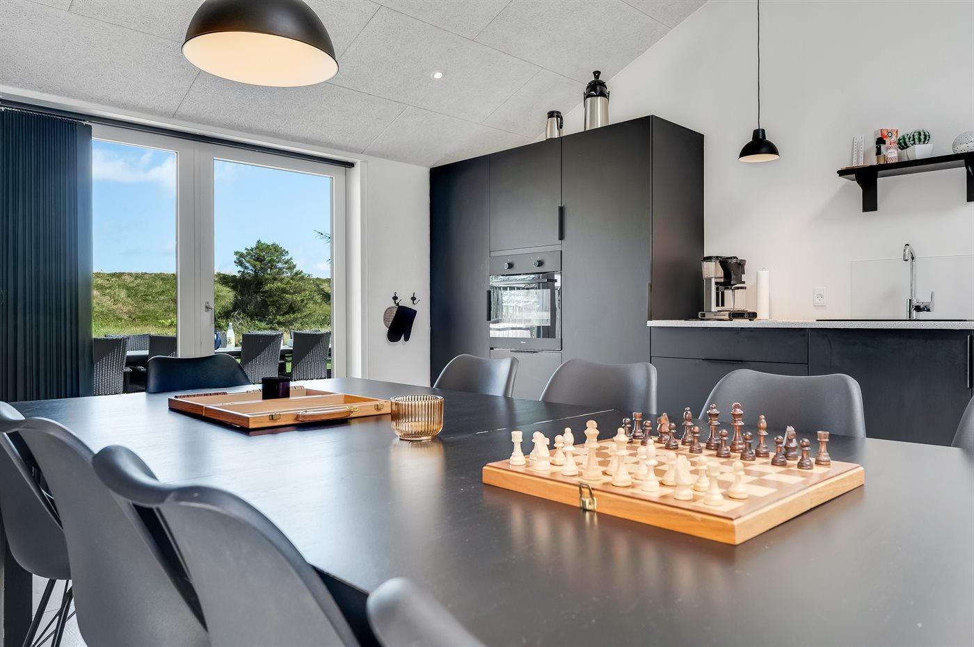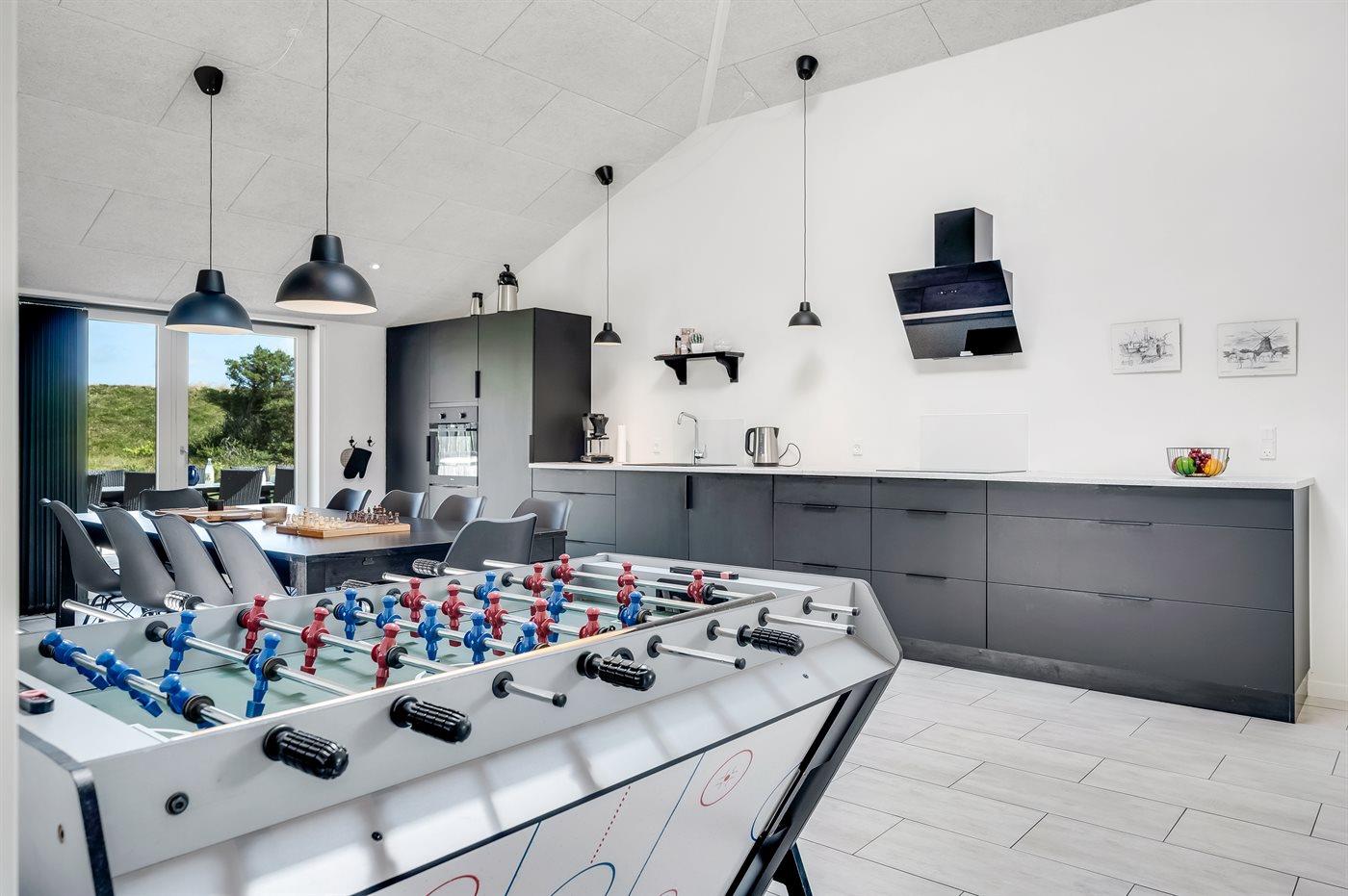Køkkenet er udstyret med 1 køleskab. Der er 4 elkogeplader, varmluftovn, mikrobølgeovn samt opvaskemaskine.