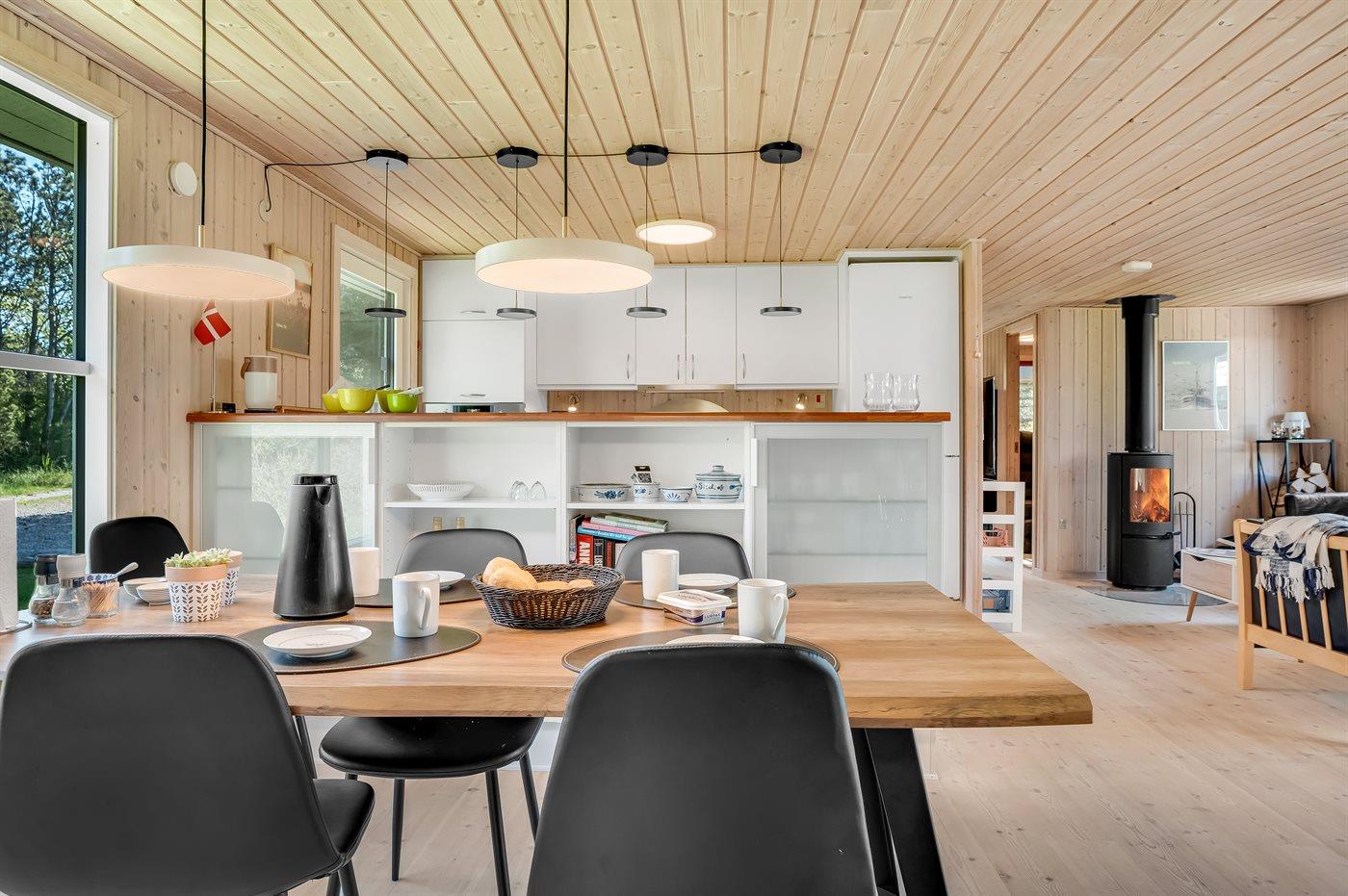 Køkkenet er udstyret med 1 køleskab. Der er 4 keramiske kogeplader, varmluftovn, mikrobølgeovn samt opvaskemaskine.