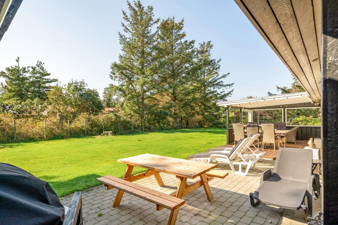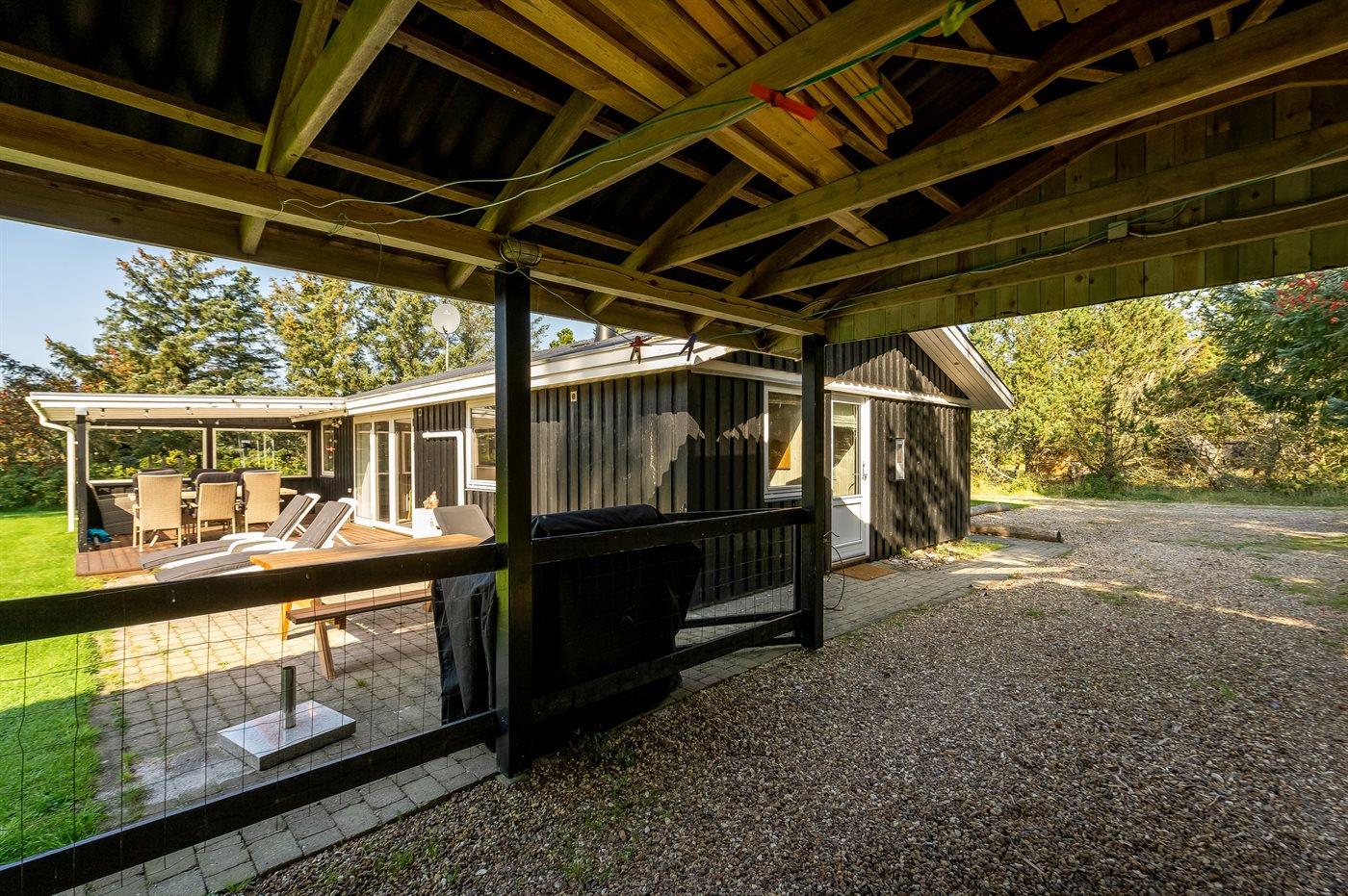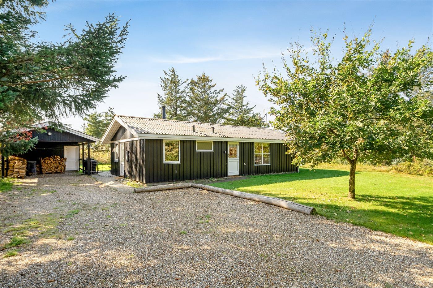 Ferieboligen er beliggende på en 1250 m² stor havegrund. Der er 2300 m til havet. Der er 500 m til fjorden. Nærmeste forretning er beliggende i en afstand af 1900 m. Der er en golfbane i en afstand af 8000 m. Til ferieboligen hører åbent terrasseareal. Desuden er der overdækket terrasse. Der ligger en legeplads i en afstand af 500 m. Grill til rådighed. Der er carport til rådighed. Parkering ved ferieboligen.