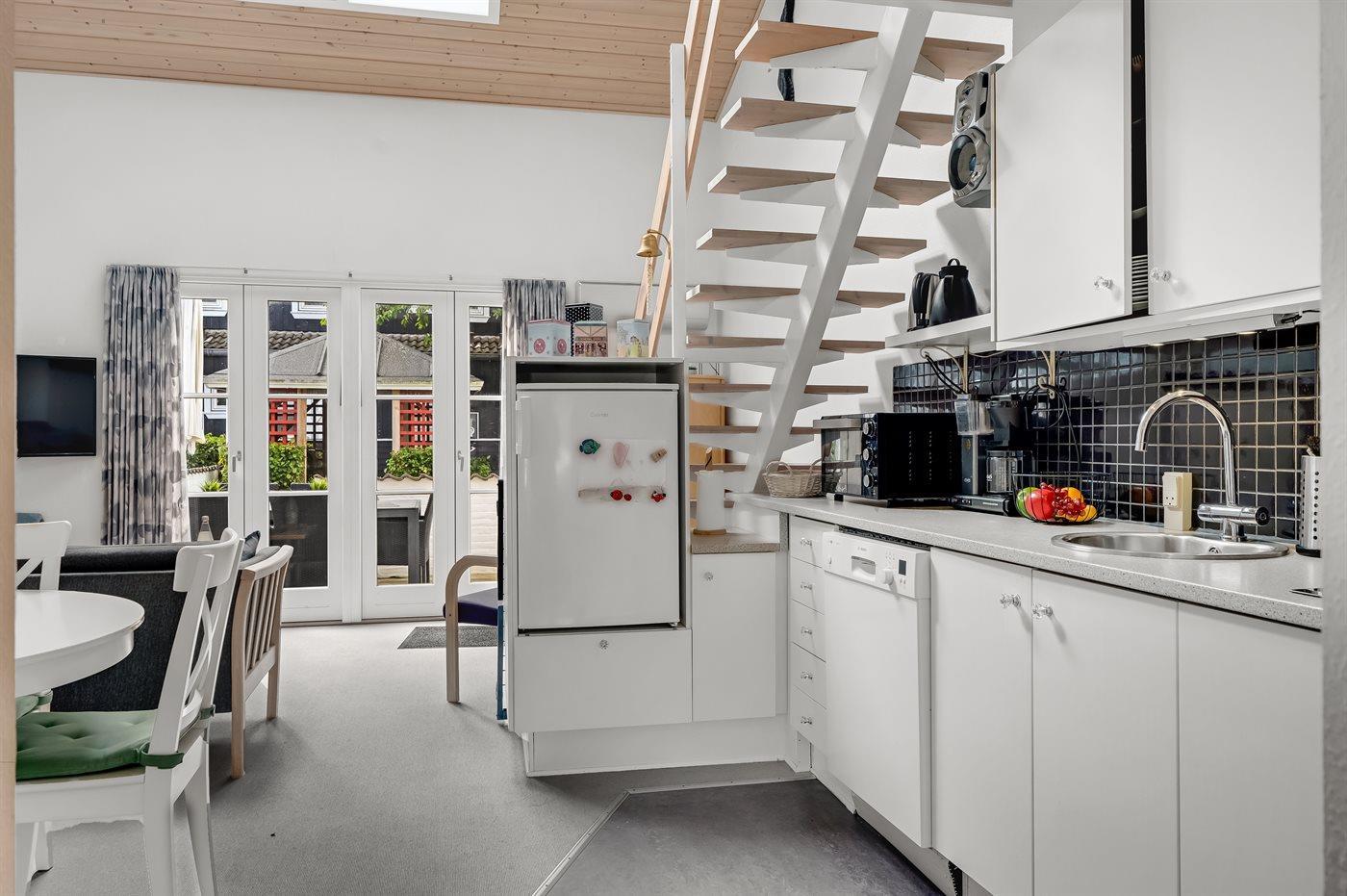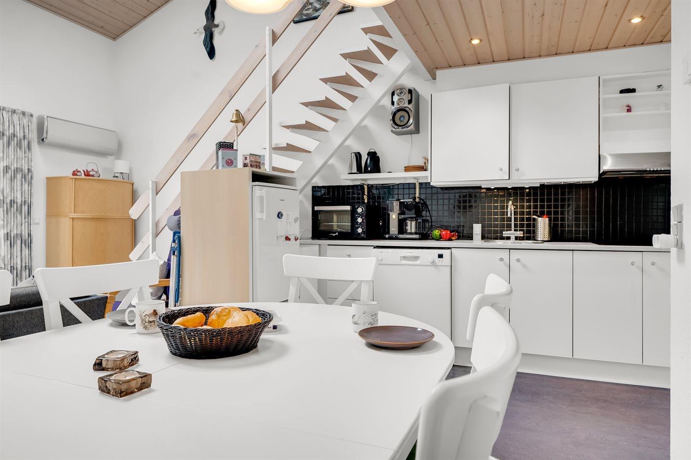 Køkkenet er udstyret med 1 køleskab. Der er 4 elkogeplader, varmluftovn samt opvaskemaskine.