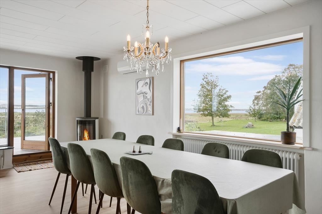 Når du træder indenfor, bliver du mødt af en lys og åben stue, hvor store vinduer lader fjordens skønhed og naturen udenfor komme helt ind i rummet. Huset er renoveret med respekt for det oprindelige hus. Stuen er forbundet med det funktionelle og veludstyrede køkken, så du nemt kan lave mad og samtidig være en del af selskabet. Fra sofaen kan du nyde en imponerende panoramaudsigt til Limfjorden og den nærliggende Aggersundbro, eller nyde varmen fra brændeovnen mens I spiller brætspil ved bordet. Huset indbyder til samvær. Der er fire lyse soveværelser, der er indrettet med fokus på komfort, så både familie og venner kan få en god nats søvn. Et velindrettet badeværelse fuldender de indendørs faciliteter og sikrer en behagelig base for din ferie.