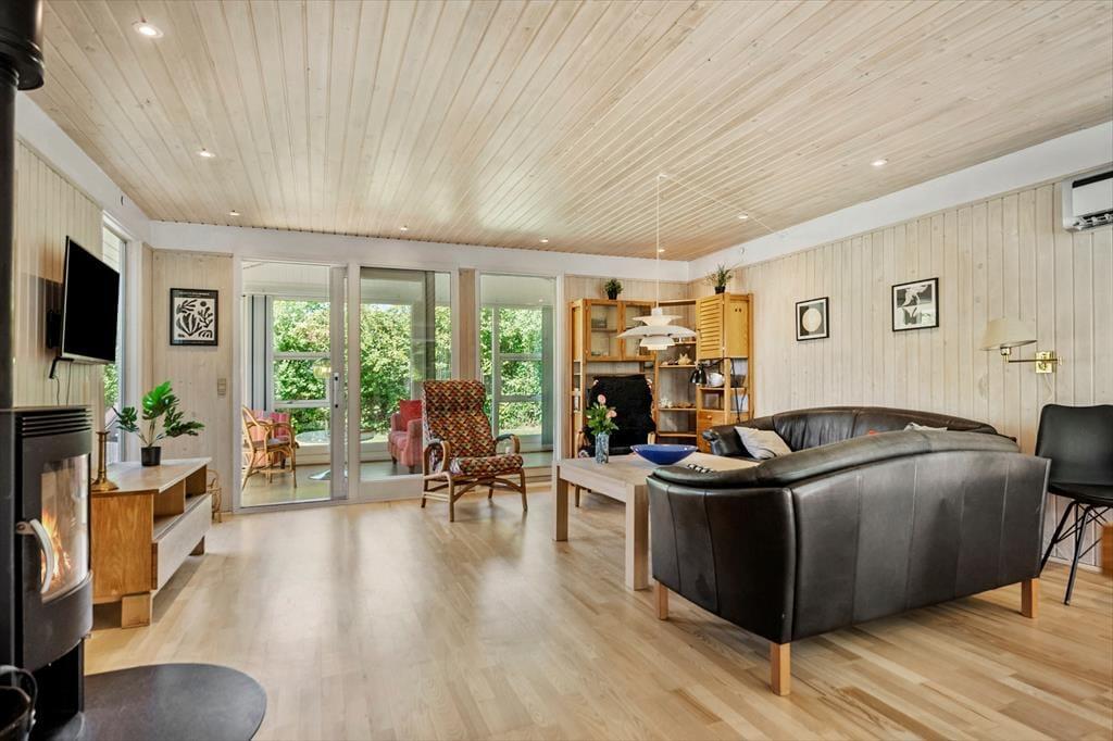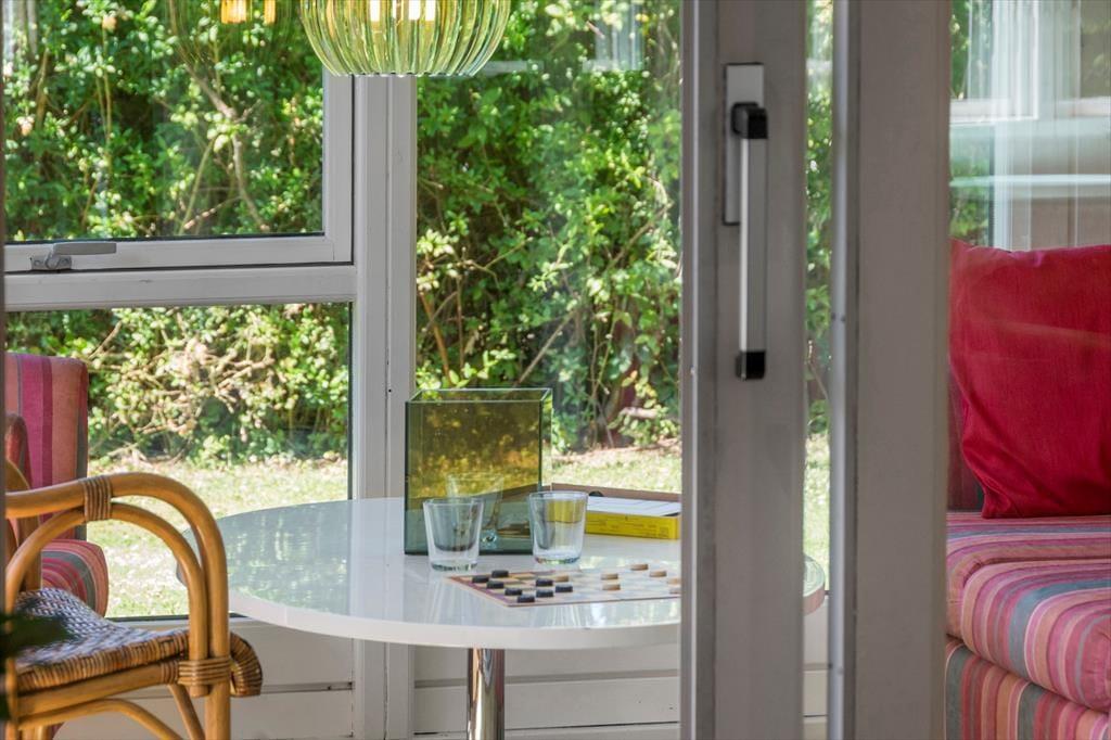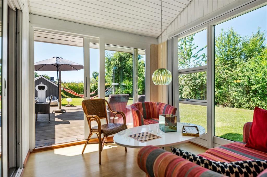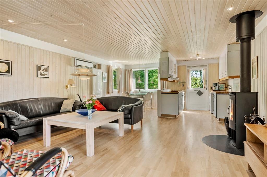 Indenfor møder du et lyst og åbent rum, der elegant lader naturens grønne farver trænge ind gennem de store vinduer. Her er gode rammer til både smilede samtaler og stille stunder, hvor du kan trække vejret dybt og lade tankerne falde til ro. Som et ekstra hjerterum finder du den hyggelige udestue, der hurtigt bliver et favoritsted. Her kan du sætte dig med en bog, lytte til regnen, lade lyset omfavne dig eller blot nyde udsigten til haven, mens dagen glider roligt afsted. Materialerne i hele huset er varme, stemningen indbydende, og når aftenen falder på, er det let at finde en ro der fylder hele huset med feriefølelse.