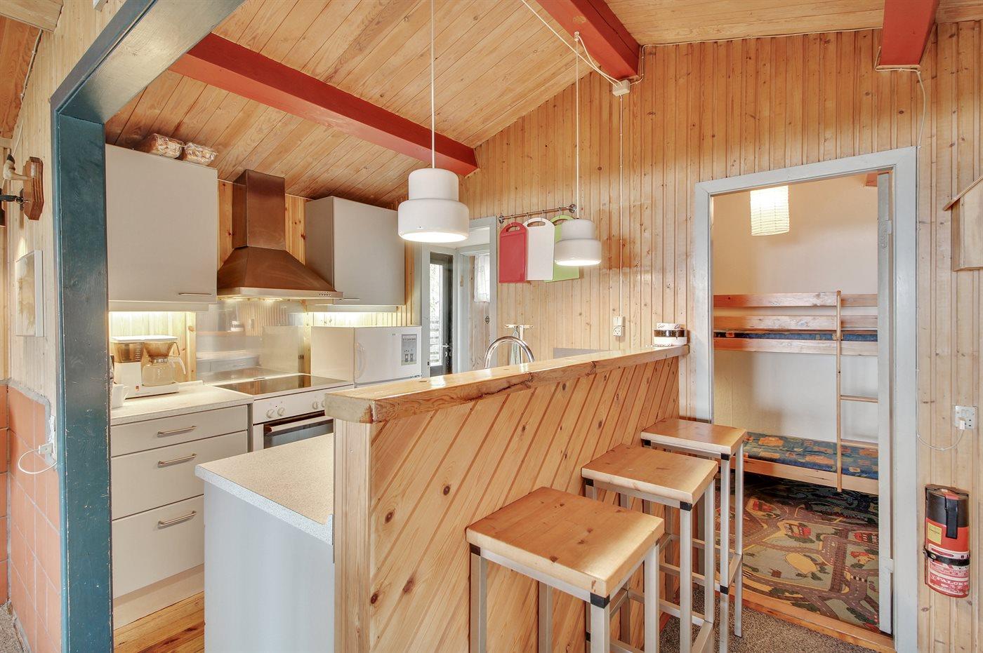 Køkkenet er udstyret med 1 køleskab. Der er 4 keramiske kogeplader, varmluftovn, mikrobølgeovn.