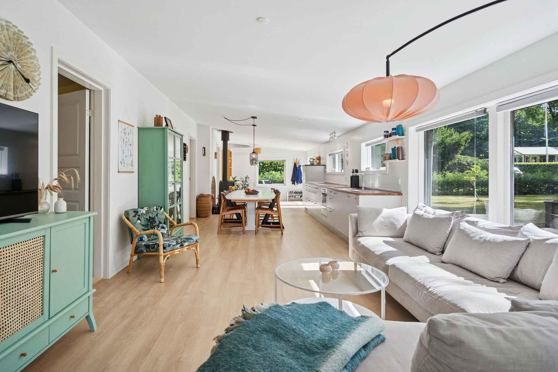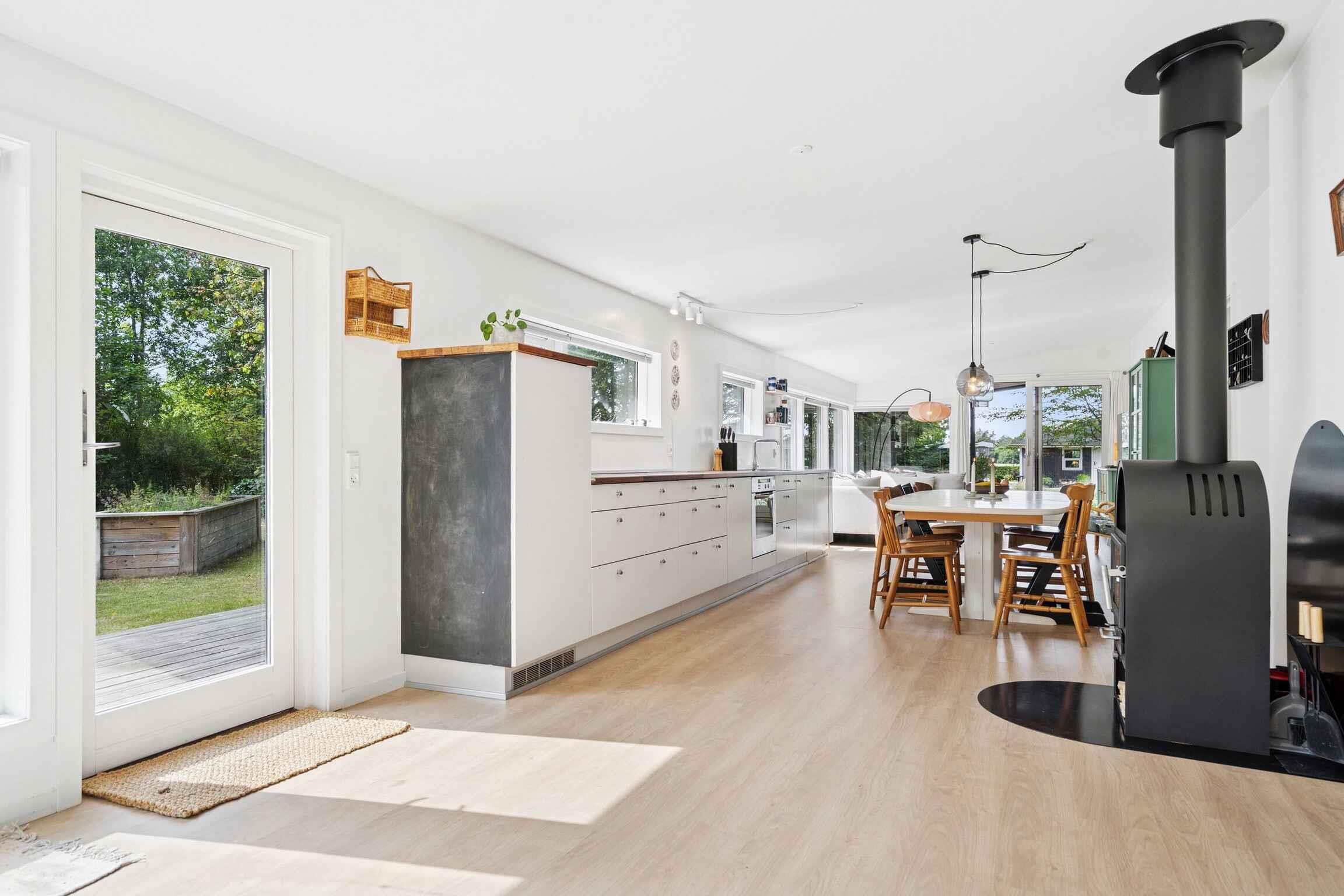 Her bor du blot få hundrede meter fra vandet, omgivet af høje træer og rolige stier. Det renoverede fritidshus på 83 m² rummer tre soveværelser i hovedhuset – alle med dobbeltseng – samt et fjerde soveværelse med dobbeltseng i et fuldt isoleret anneks. Den åbne planløsning, de store vinduer og brændeovnen giver et afslappet og funktionelt opholdssted. Den lyse stue og køkkenet bindes naturligt sammen og åbner mod den store træterrasse, hvor både sol og læ findes dagen igennem. Ét af værelserne har direkte adgang hertil, og annekset giver fleksible muligheder for gæster eller større familier. Terrassen skaber flere udendørs zoner, hvor du kan nyde morgenkaffe, middag i skyggen eller aftener i det udendørs spabad. Det overdækkede område giver plads til grill og samvær, mens haven tilbyder rum til leg, ro og små udendørs projekter. Området omkring huset er særligt attraktivt til ferie. Her finder du fredelige skovstier, lavtliggende strandbredder og gode muligheder for at bade, fiske eller sejle i kajak. Naturen er tæt på, men også små lokale attraktioner, hyggelige havnemiljøer og familievenlige udflugtsmål er inden for rækkevidde. Cykelruter, åbne landskaber og vandrestier gør det let at kombinere afslapning med aktive oplevelser. Med sin rolige beliggenhed i Lystrup Strand er huset et oplagt valg for familier og venner, der ønsker en komfortabel base med moderne faciliteter og nærhed til naturen. Her kan ferieformen skifte fra dag til dag – men følelsen af ro følger med hele vejen.