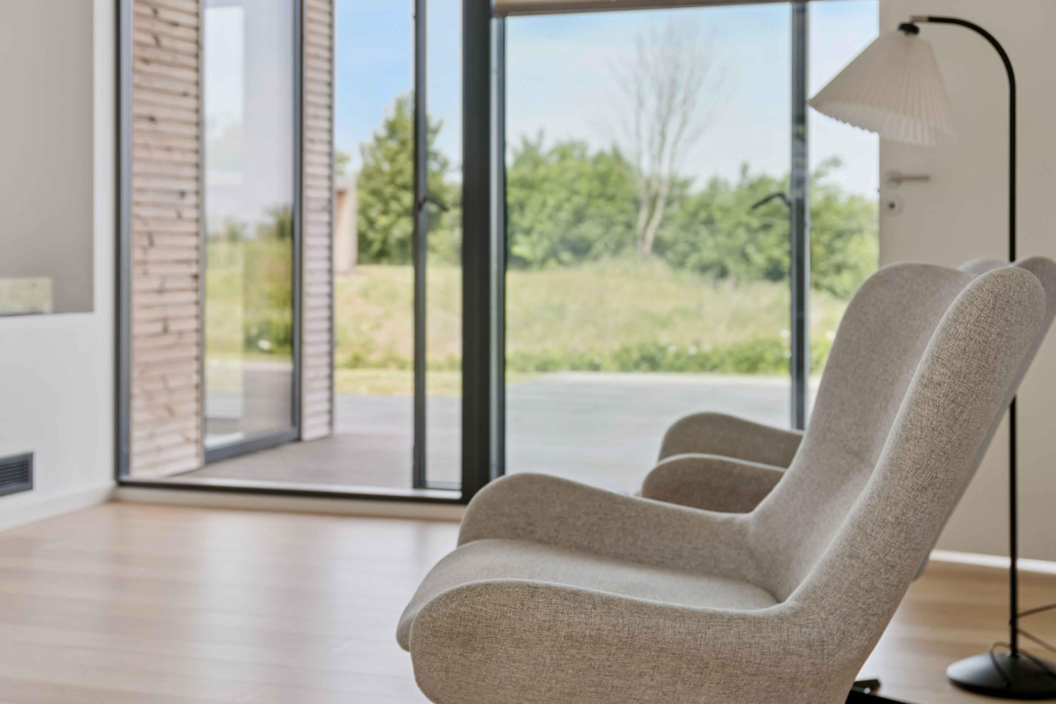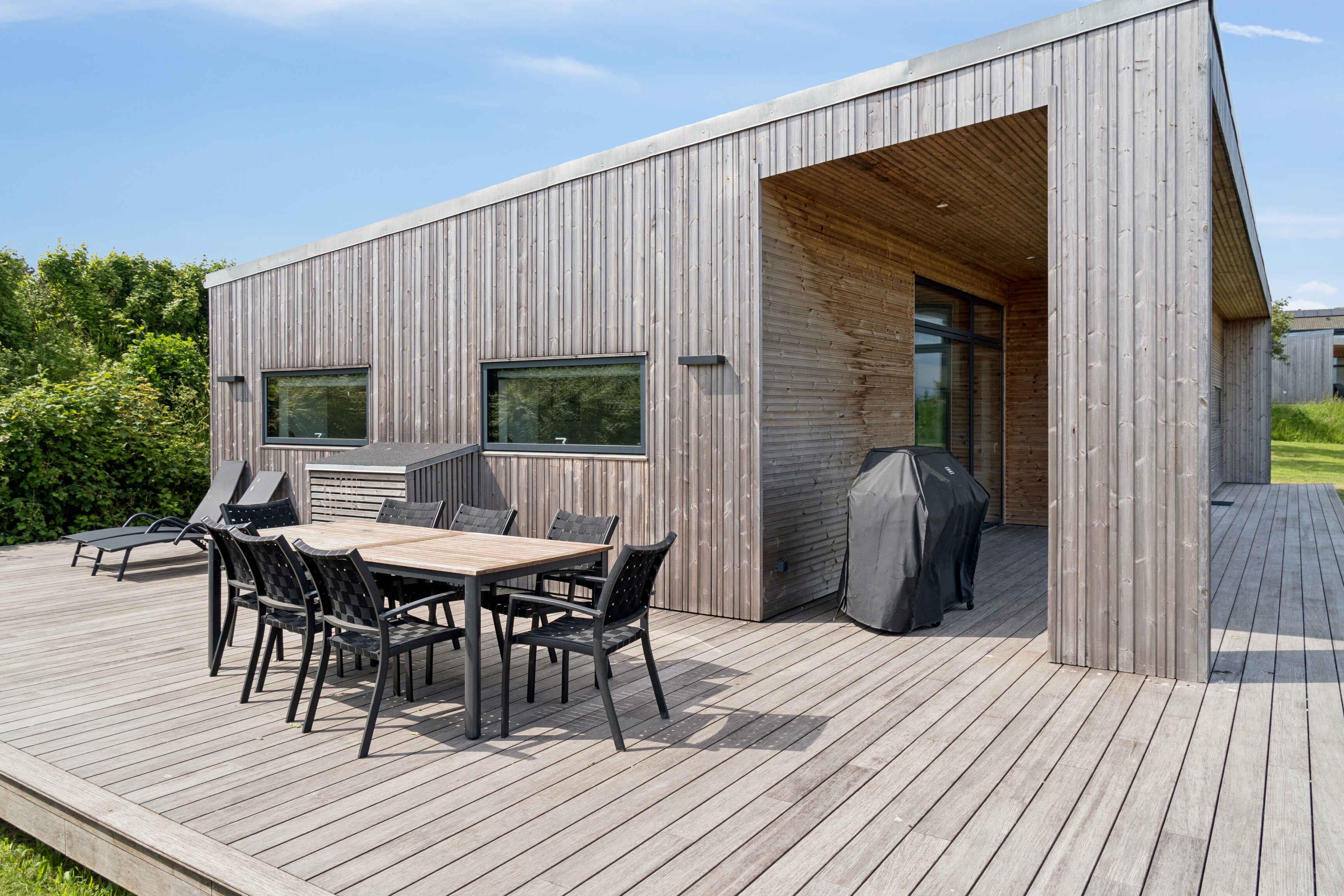 Arkitekttegnet feriehus med havudsigt, bæredygtige materialer og stor terrasse tæt på strand og naturoplevelser.