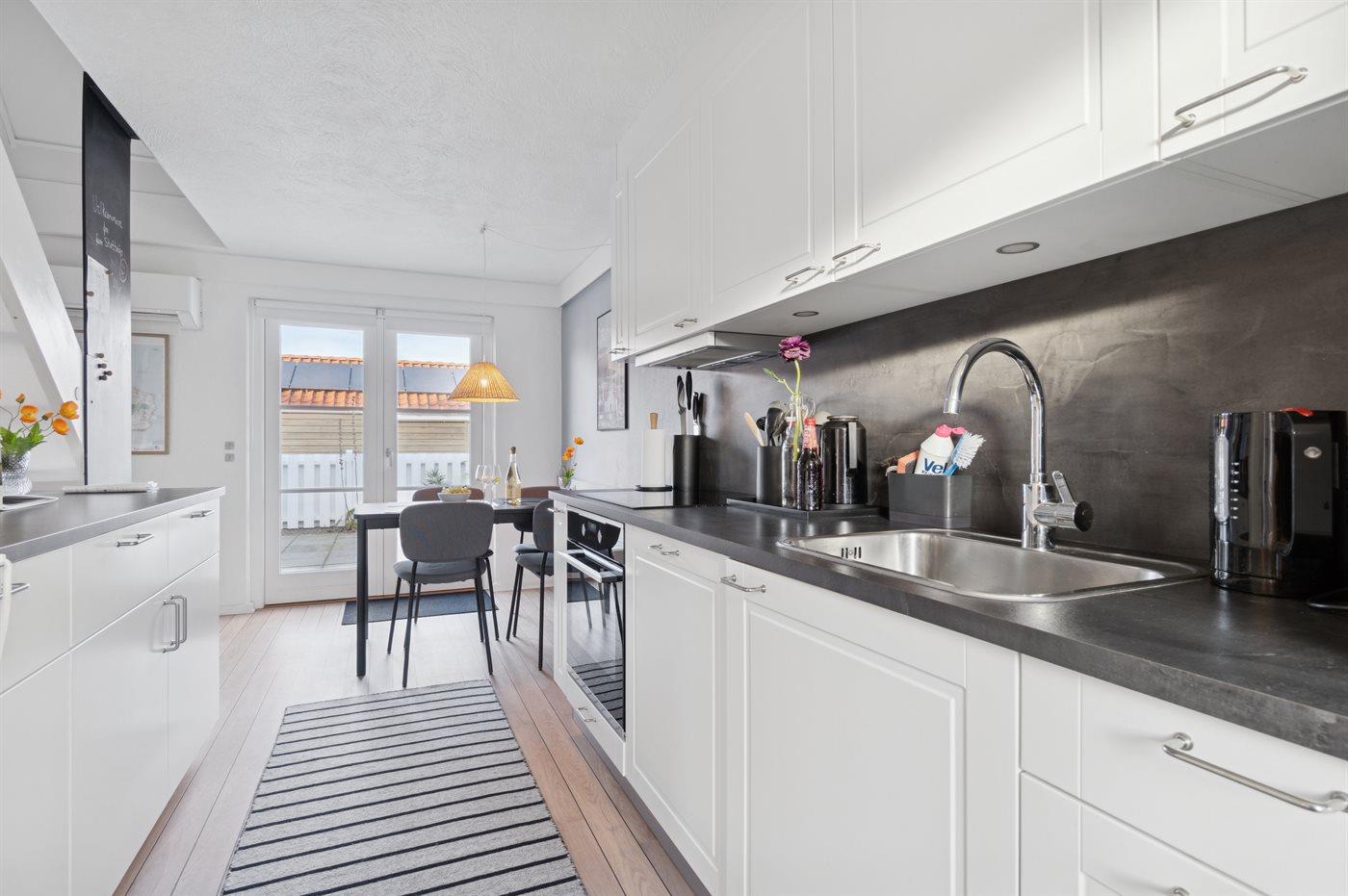 Køkkenet er udstyret med 1 køleskab. Der er 4 induktionskogeplader, varmluftovn, mikrobølgeovn samt opvaskemaskine.