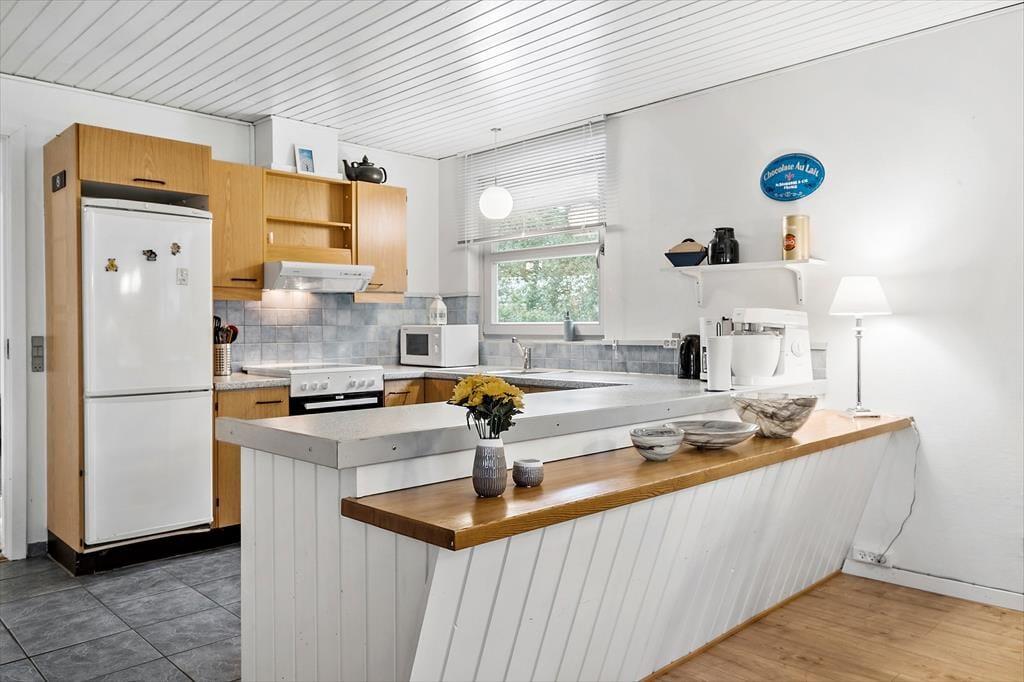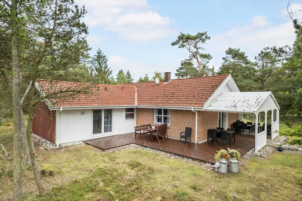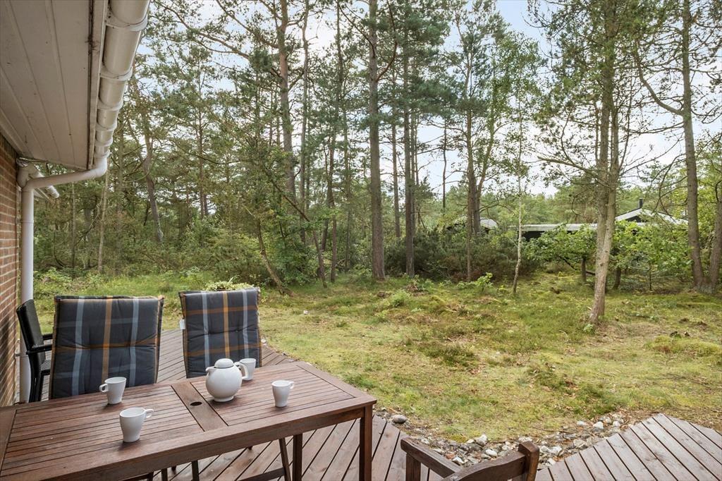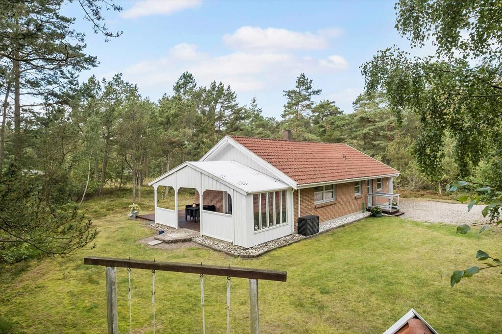 Indendørs er der en hyggelig stue med brændeovn og et velfungerende køkken. Udendørs kan I nyde både overdækkede og åbne terrasseområder, grill, udendørs pejs og en stor have med gynge og legehus. Naturgrundens frodige beplantning sikrer fred og ro.