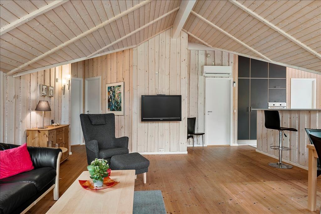 Da sommerhuset blev opført i 2009, blev der lagt vægt på, at det skulle være både hyggeligt og funktionelt. Derfor er de 104 m2 særdeles godt udnyttet, og kiploftet og de lyse trævægge giver rummene den helt rette sommerhusatmosfære. Planløsningen byder blandt andet på en entré med vaskefaciliteter, et gæstetoilet, et badeværelse og tre soveværelser med i alt otte sengepladser. Badeværelset er det værd at dvæle ved, for her er der nemlig både sauna og spabad, hvilket er helt perfekt, hvis I virkelig trænger til at koble af. Afslapningsstunderne kan også foregå i opholdsrummet, der består af køkken og stue i åben forbindelse. Her kan I samles omkring spisebordet og i sofaafdelingen, og der er også en alkove, der fungerer som en ekstra lille hyggekrog.