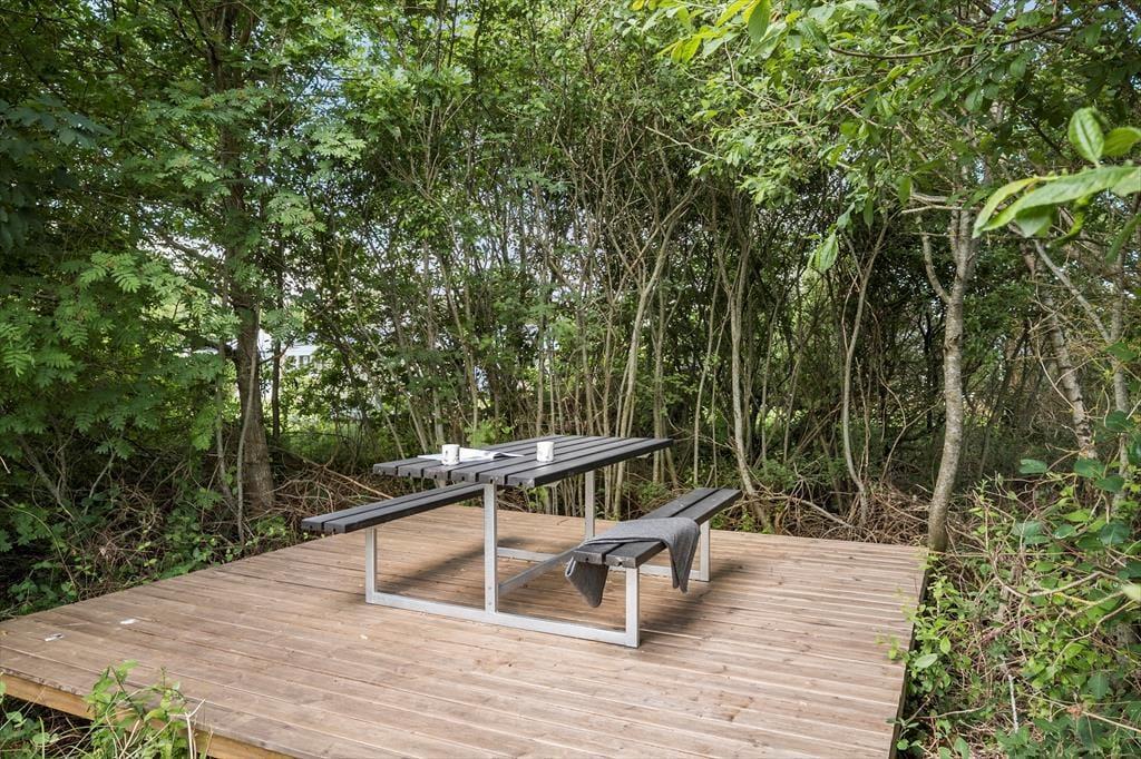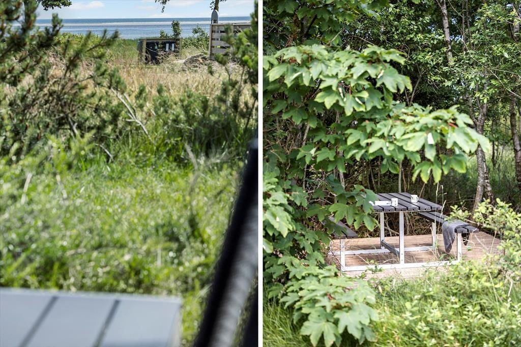 Huset ligger på en god stor grund med god græsplæne, høje træer og buskads hvor børnene kan lege. Der er udsigt over vandet og man er helt tæt på stranden. De skønne terrasser danner rammen om hyggelige stunder hvad enten man har gang i grillen eller sidder og nyder morgenkaffen når vejret tillader det.