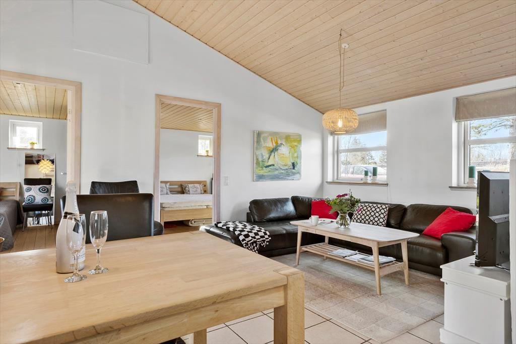 Træd ind i dette velholdte sommerhus på Rønnemose 51, hvor hygge og komfort mødes i et rummeligt og indbydende miljø. Den åbne planløsning skaber en luftig atmosfære, og de store vinduer lukker naturligt lys ind, hvilket forstærker følelsen af rummelighed. Indretningen er klassisk og stilren med varme trædetaljer. Køkkenet er veludstyret og indbyder til fælles madlavning og samvær. Her er plads til både rolige stunder og livlige ferieminder.