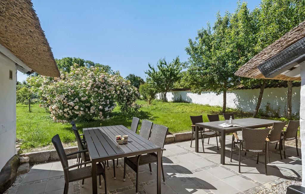 Nyd en hyggelig ferie i et moderniseret stråtagshus med vildmarksbad og stor have i Alslev.