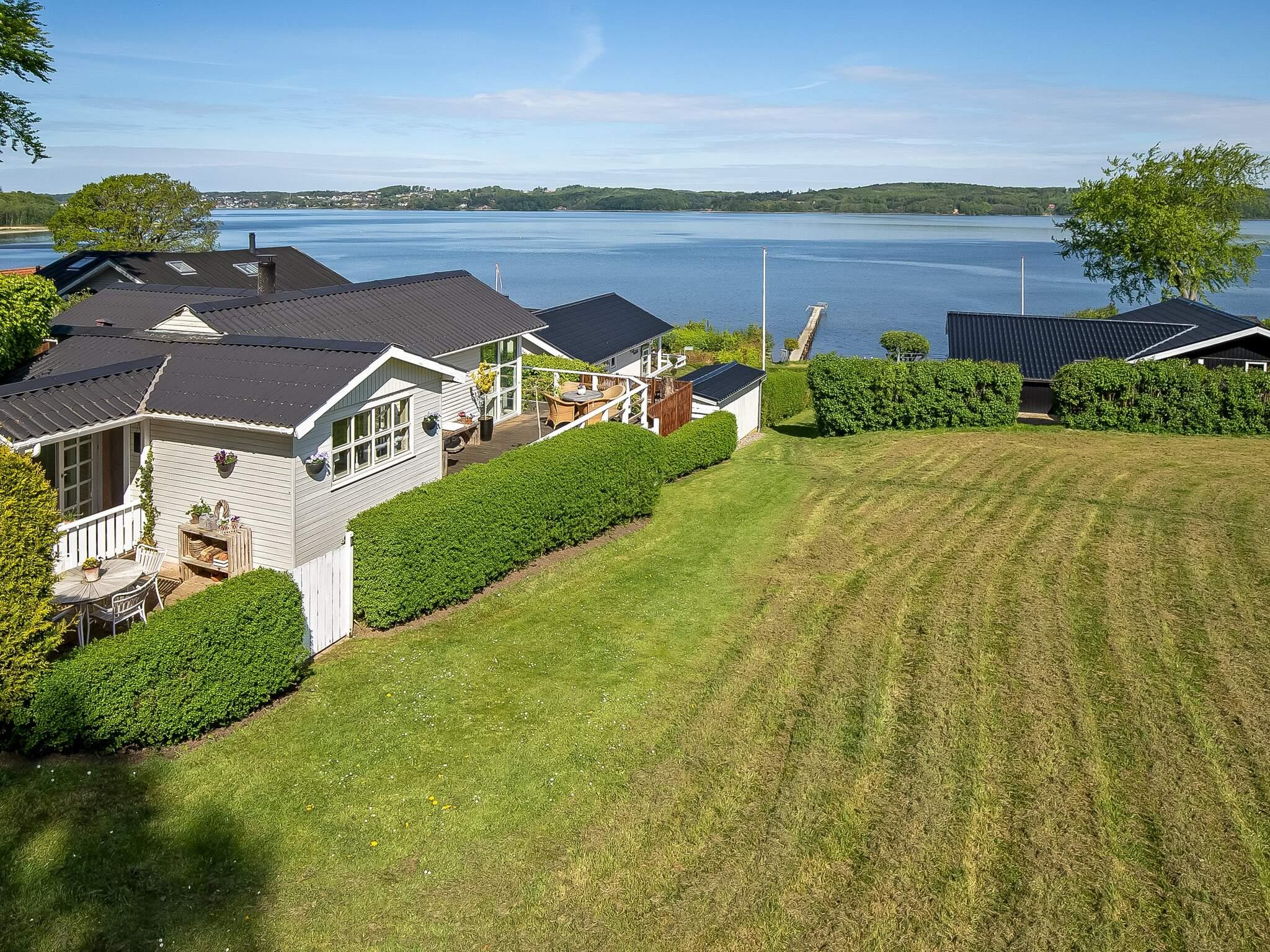 Dette smukt beliggende feriehus ligger højt over Vejle Fjord og byder på en fantastisk panoramaudsigt og direkte adgang til vandet via en privat sti med badebro. Ved siden af ejendommen er der et stort græsareal med en fælles legeplads - perfekt til familier. Indenfor er boligen lys og luftig med skrå lofter og store vinduer, der indrammer fjordudsigten. Både stuen og soveværelset har direkte adgang til terrassen, så du kan nyde den spektakulære natur fra morgen til aften.