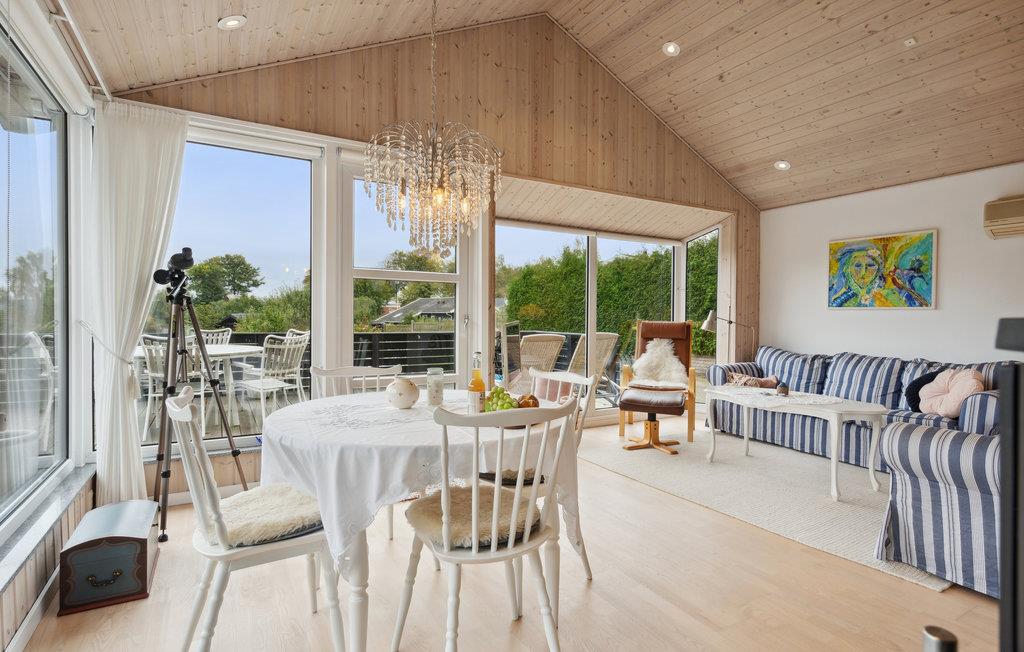 Træd indenfor og nyd den dejlige atmosfære i den lysgennemstrømmede stue. Her vil I føle jer hjemme. Sæt jer godt til rette i de smagfulde sofaer, se på fuglene over vandet eller slap af med en god bog i lænestolen. For børnene er der en hyggelig hems, hvor de kan lege og bygge huler i mange timer.