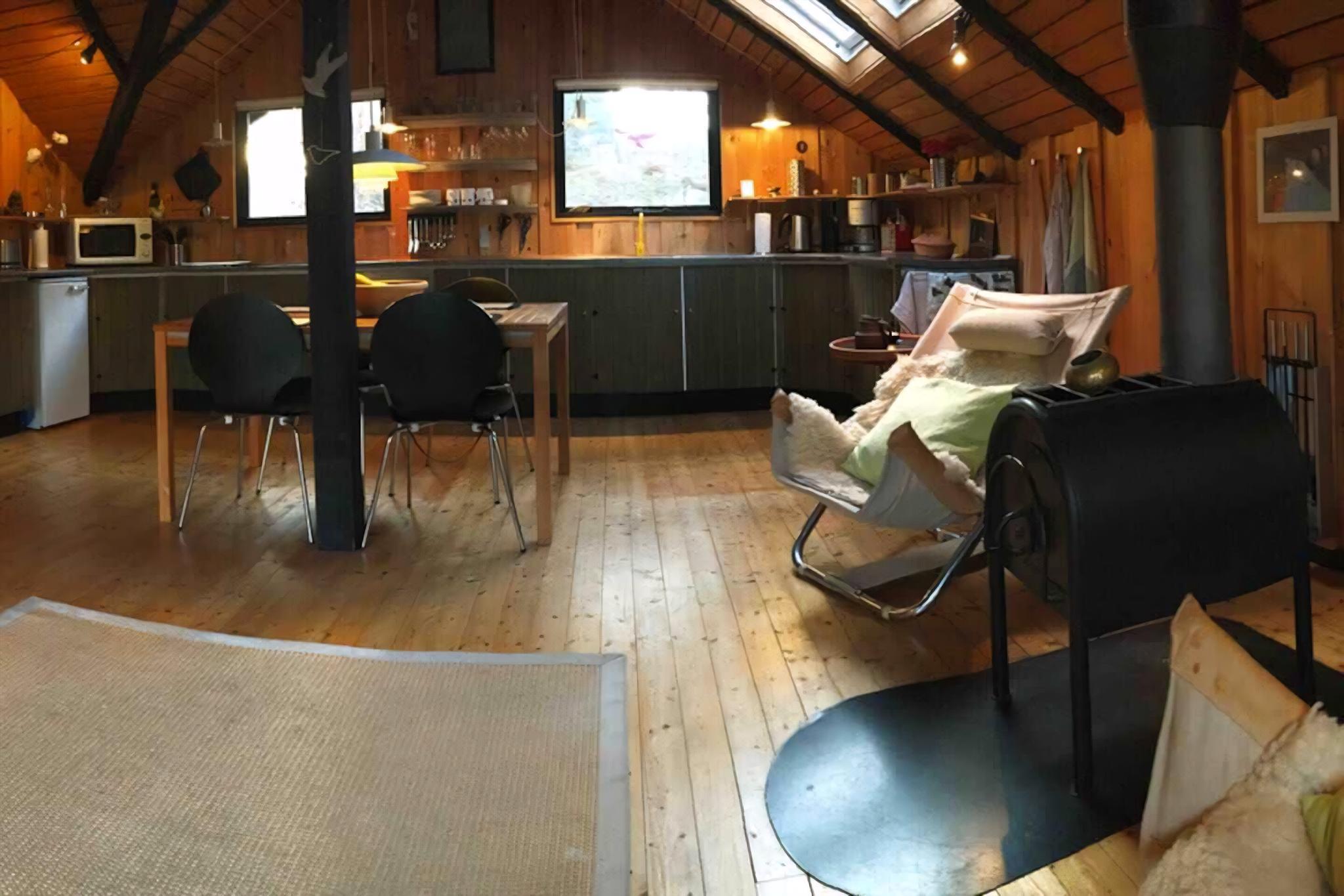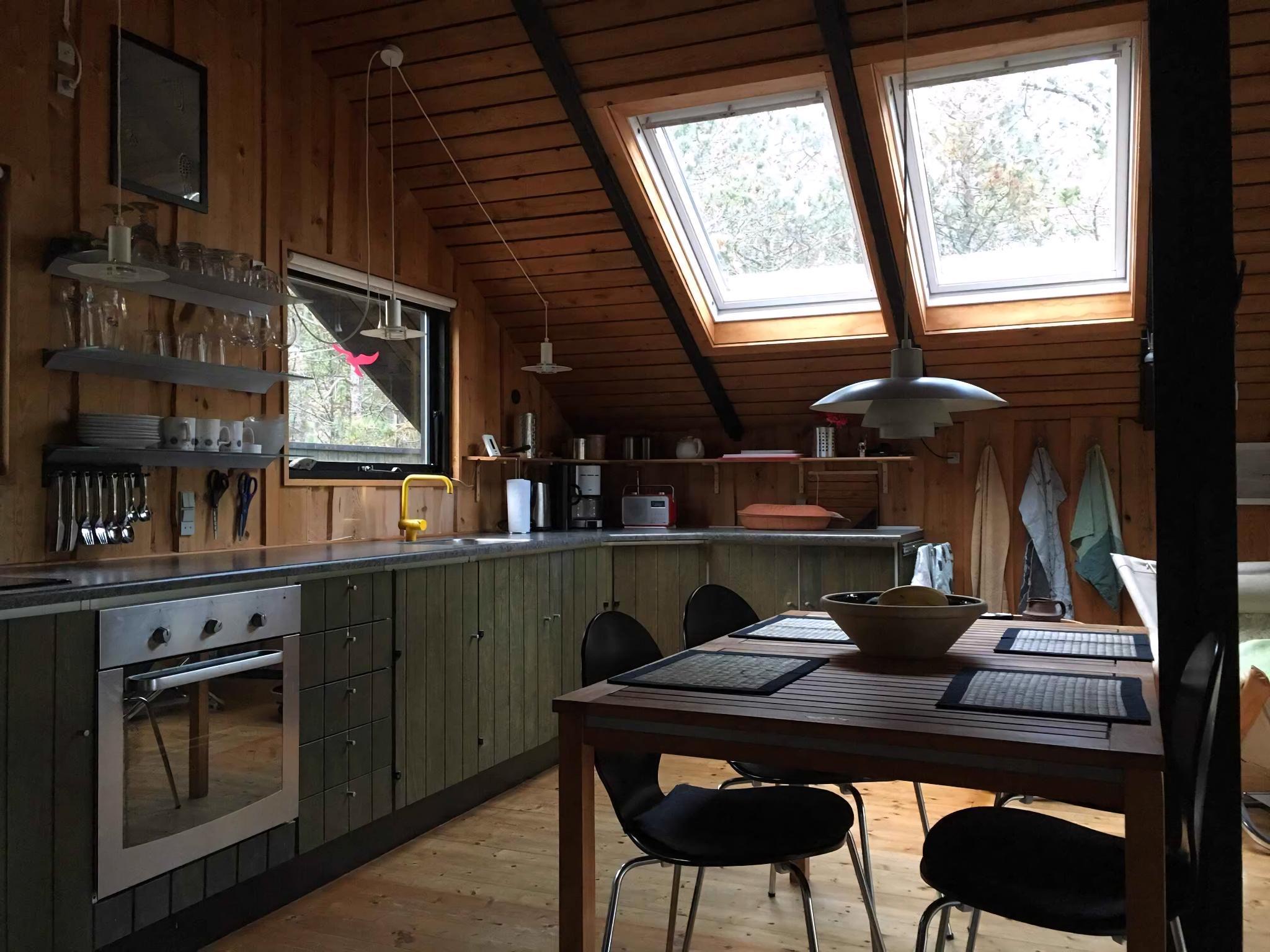 Direkte adgang til “Ørkenen” - et 16 km2 stort fredet naturområde (hedelandskab og skov) med mange spændende planter, fugle og dyr. Stort køkken-alrum-stue med spisebord, lænestole, afslapningsbriks, brændeovn og et moderniseret køkken.