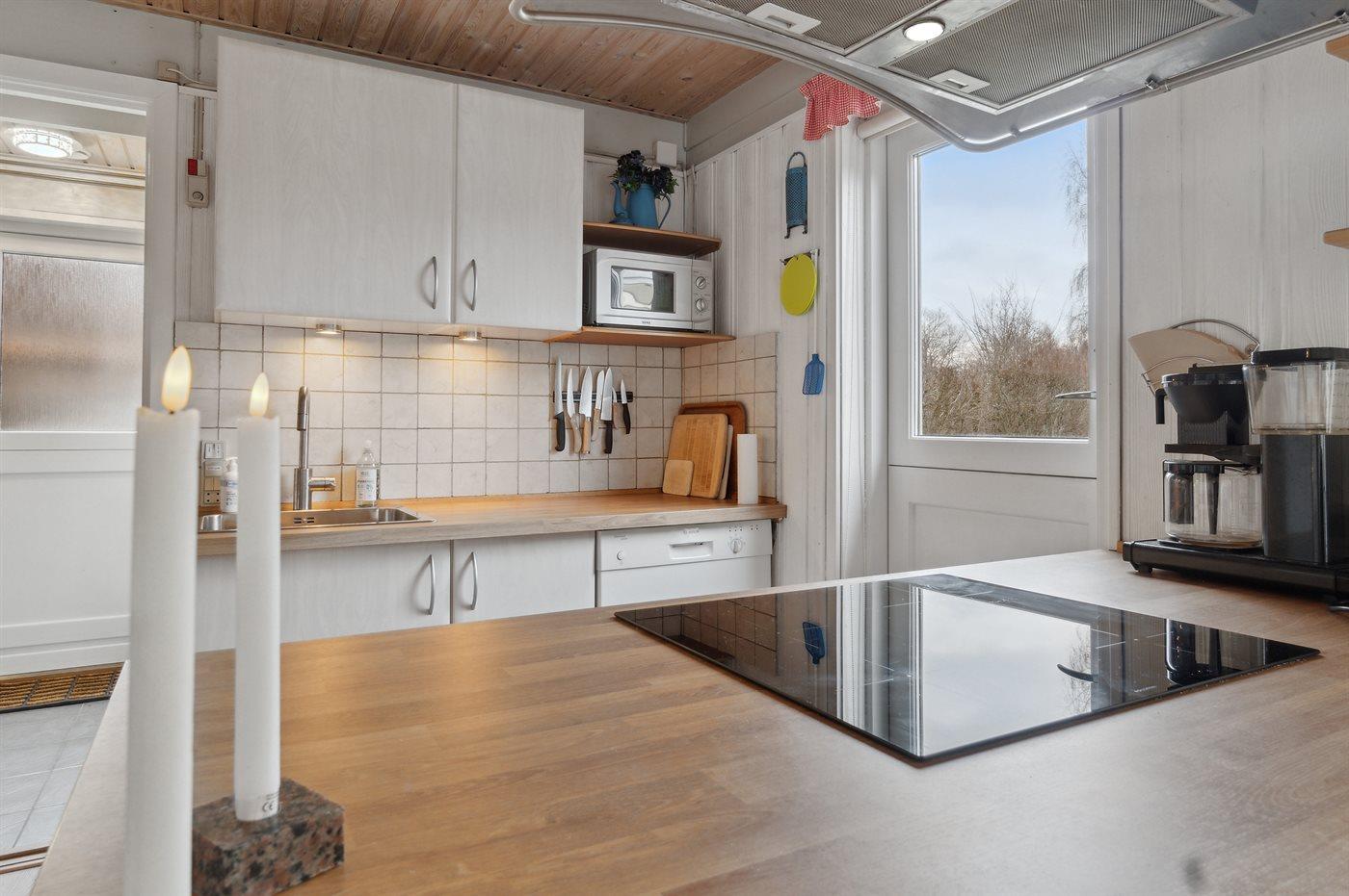 Køkkenet er udstyret med 1 køleskab. Der er 4 induktionskogeplader, varmluftovn, mikrobølgeovn samt opvaskemaskine.