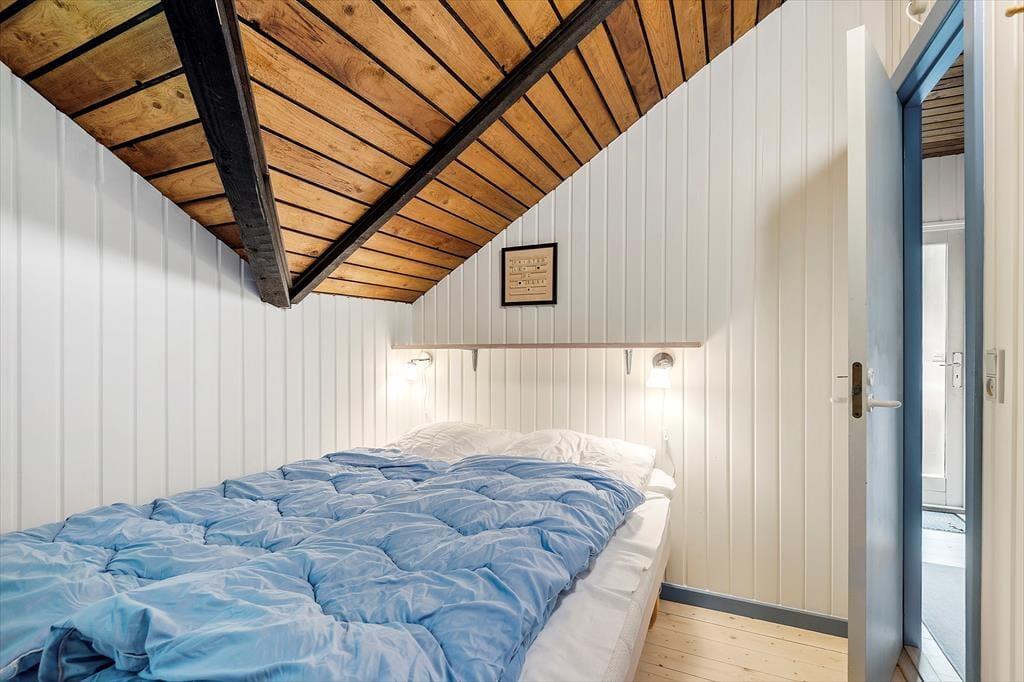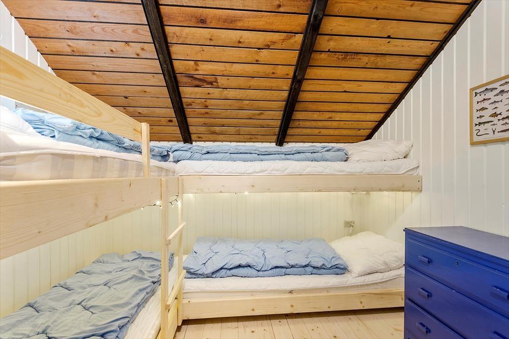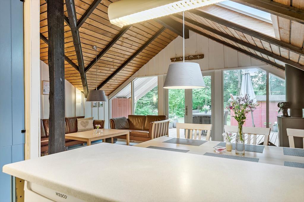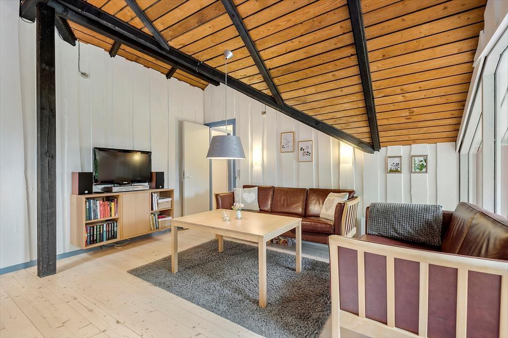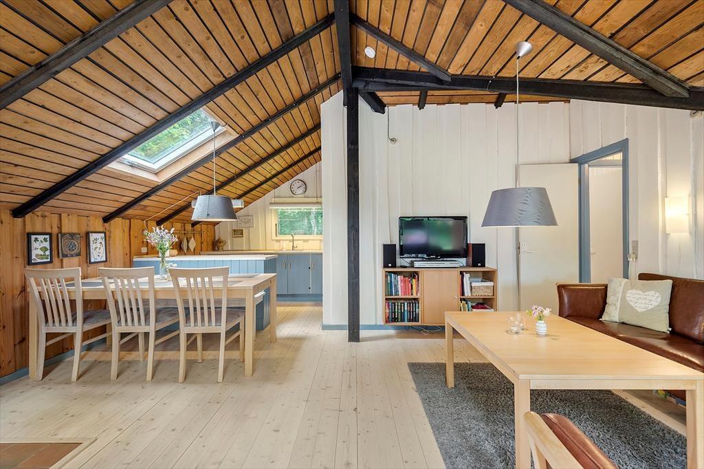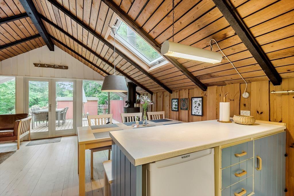 Hvis I er den slags, der holder af klassisk sommerhusatmosfære og tilbagelænet hyggestemning, vil I helt sikkert falde for netop denne feriebolig. Med loft til kip, umalede trævægge og brændeovn har sommerhuset nemlig bevaret sit originale udseende, og det opdaterede møblement er med til at understrege den gode rumfornemmelse inden døre. I kan for eksempel hurtigt føle jer hjemme i stuen, der ligger i åben forbindelse med et fint og funktionelt køkken. Også badeværelset er pænt indrettet, og på de to soveværelser kan I se frem til en god nats søvn, når feriedagen nærmer sig sin afslutning. Det ene soveværelse er indrettet med to køjesenge, så i alt kan I være seks feriegæster i huset.