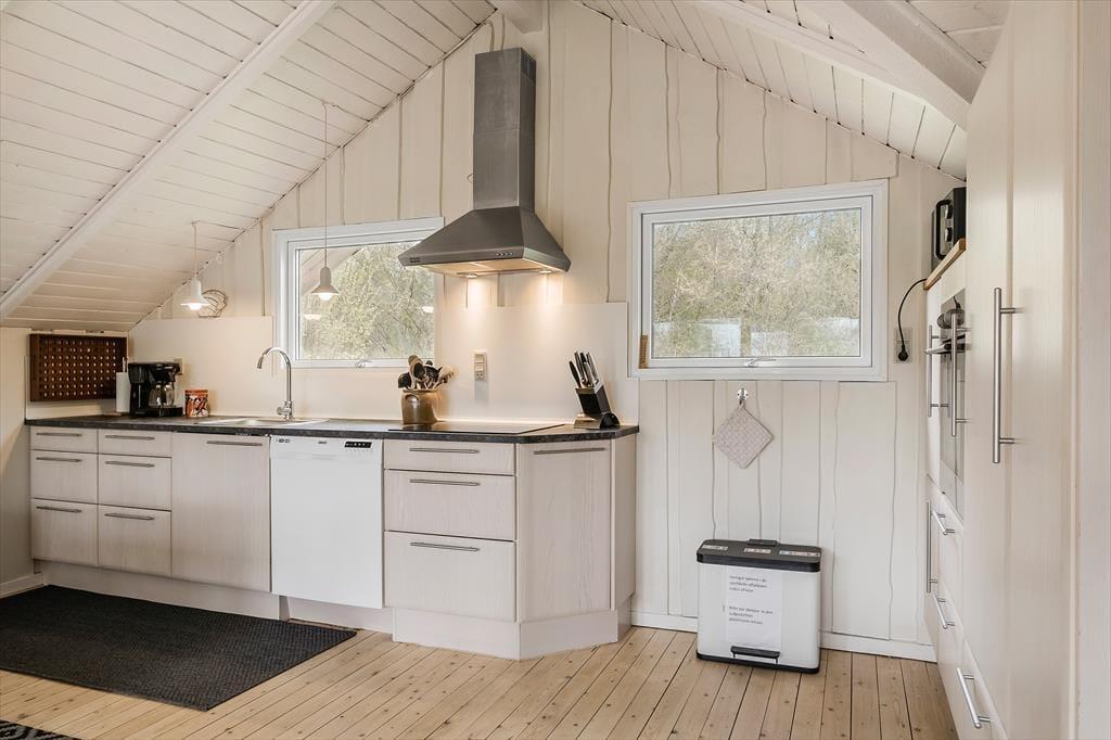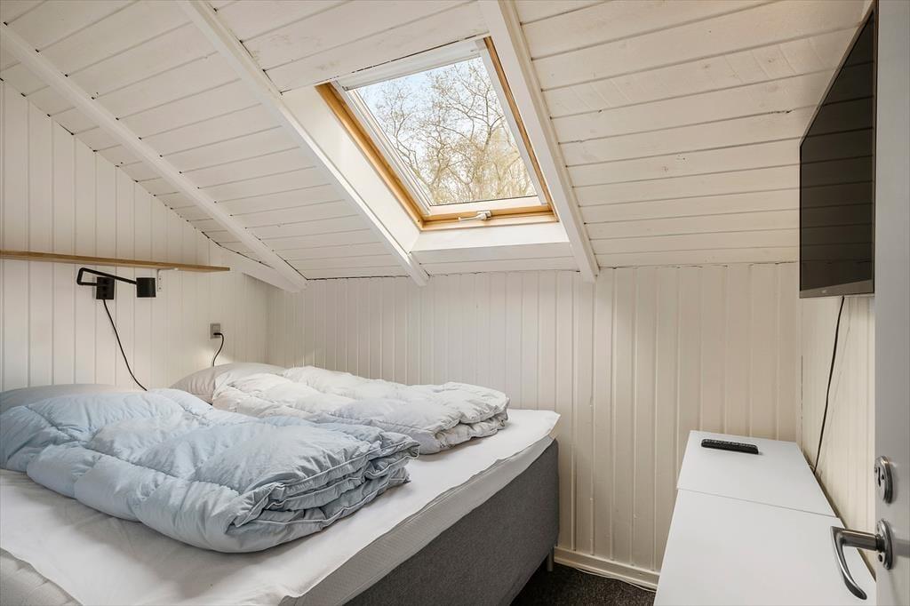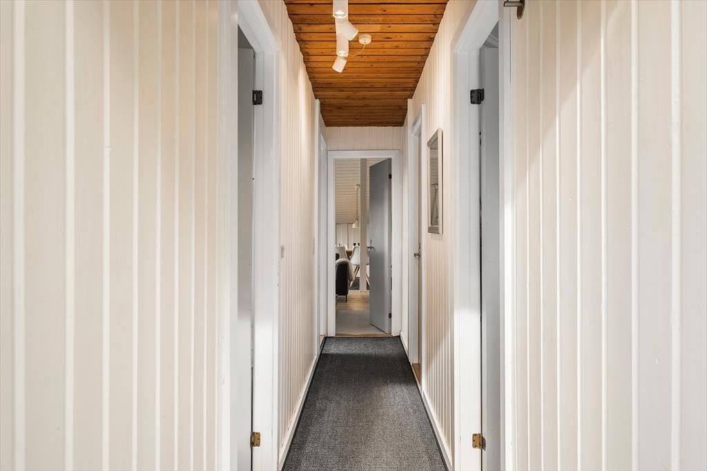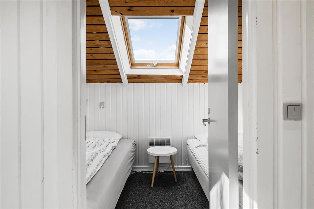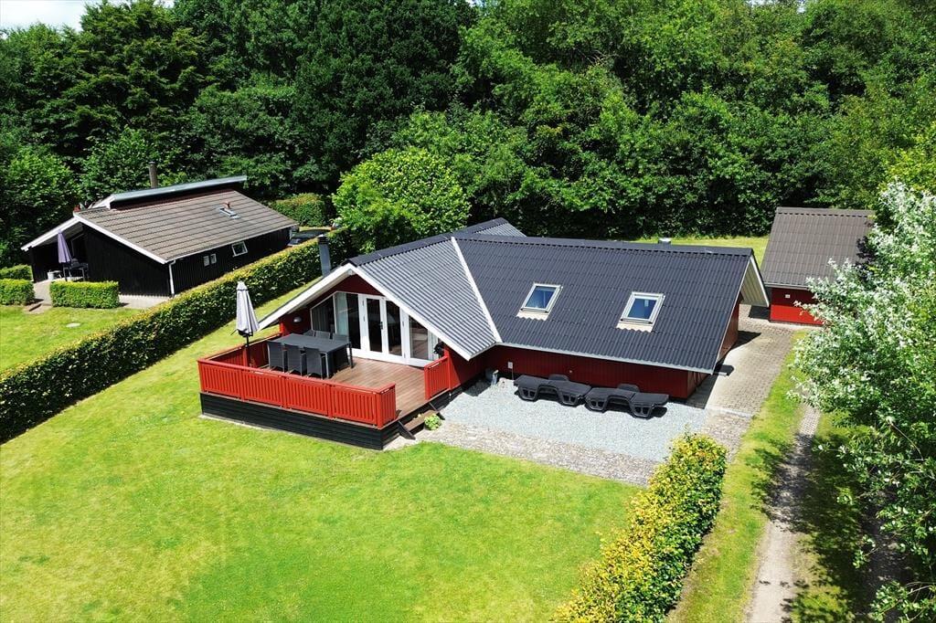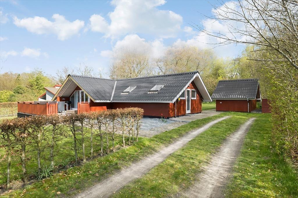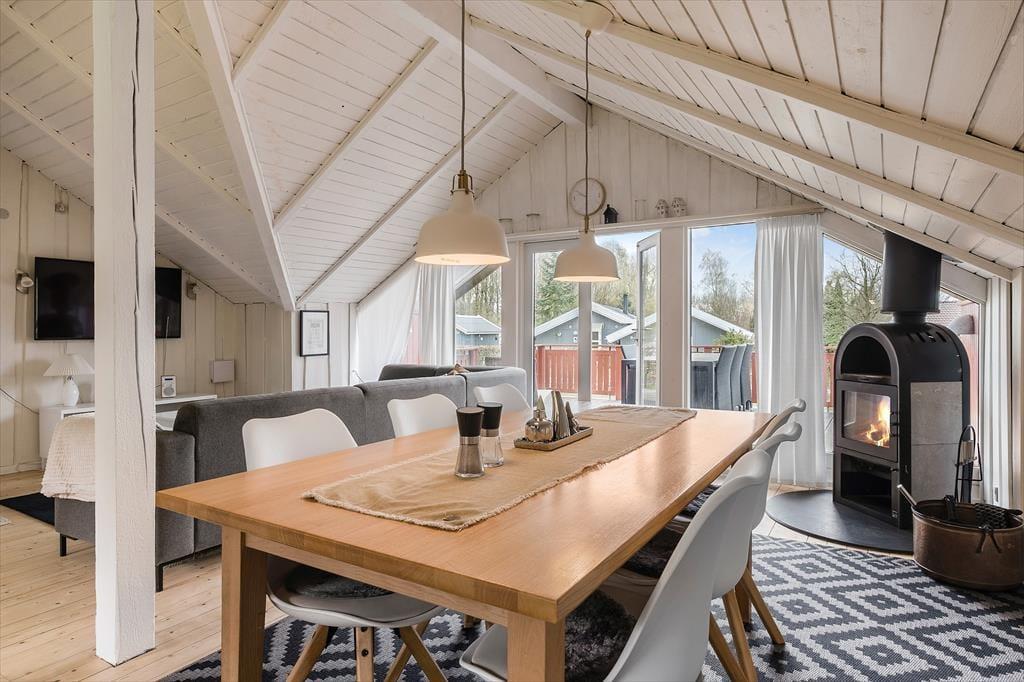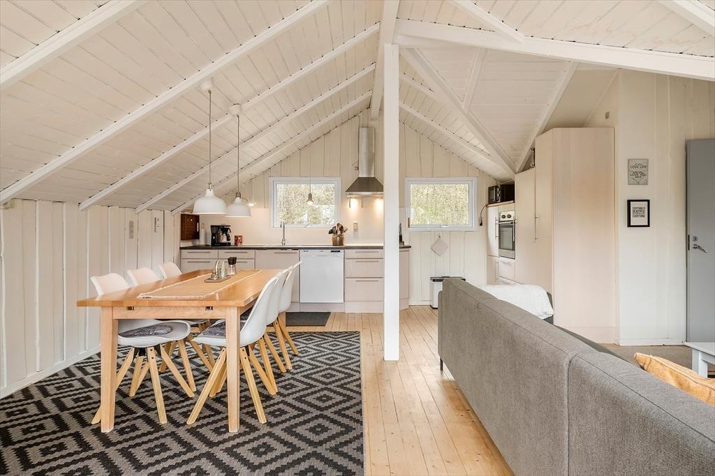 Det rødmalede sommerhus, der ligger helt for enden af en lukket vej, har en pæn og velholdt indretning, og du kan hurtigt føle dig hjemme i de indbydende rammer. På helt klassisk manér er der loft til kip og lyse trælister på væggene, og i stuen står der en brændeovn – den kan du for eksempel tænde op i, hvis du og dine kære vil hygge jer med varm kakao og brætspil ved spisebordet. Køkkenet er integreret i rummet, og derfor skal du ikke gå mange skridt, hvis du vil hente snacks, inden I går i gang med at se film i sofaafdelingen. Og hvis det er ved at være sengetid, behøver du egentlig bare lige at runde badeværelset for at børste tænder, inden du kan se frem til en god og lang nats søvn på et af de tre soveværelser.