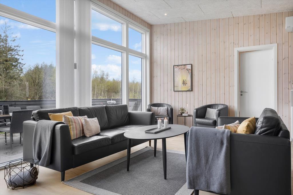 Allerede når du træder ind i huset, fornemmer du den lyse og venlige atmosfære. Det store opholdsrum er domineret af en imponerende vinduesfront, der lukker masser af dagslys ind og giver en følelse af at sidde midt i naturen – som en kæmpestor havestue. Her er køkken, spiseplads og stue samlet i ét, så alle kan være en del af fællesskabet, uanset om du laver mad, spiller spil ved spisebordet eller slapper af i sofahjørnet med en god bog. Køkkenet er usædvanligt rummeligt og fuldt udstyret med alt, hvad hjemmekokken kan ønske sig, så det er en fornøjelse at tilberede alt fra hurtige frokoster til lækre middage efter en dag med dejlige ferieoplevelser.