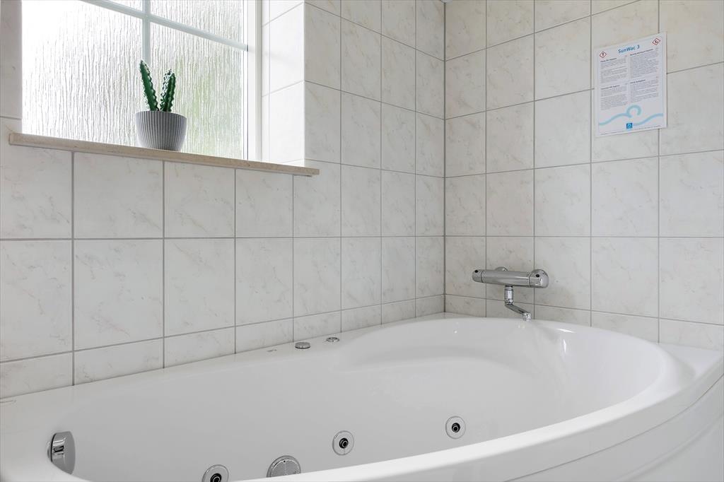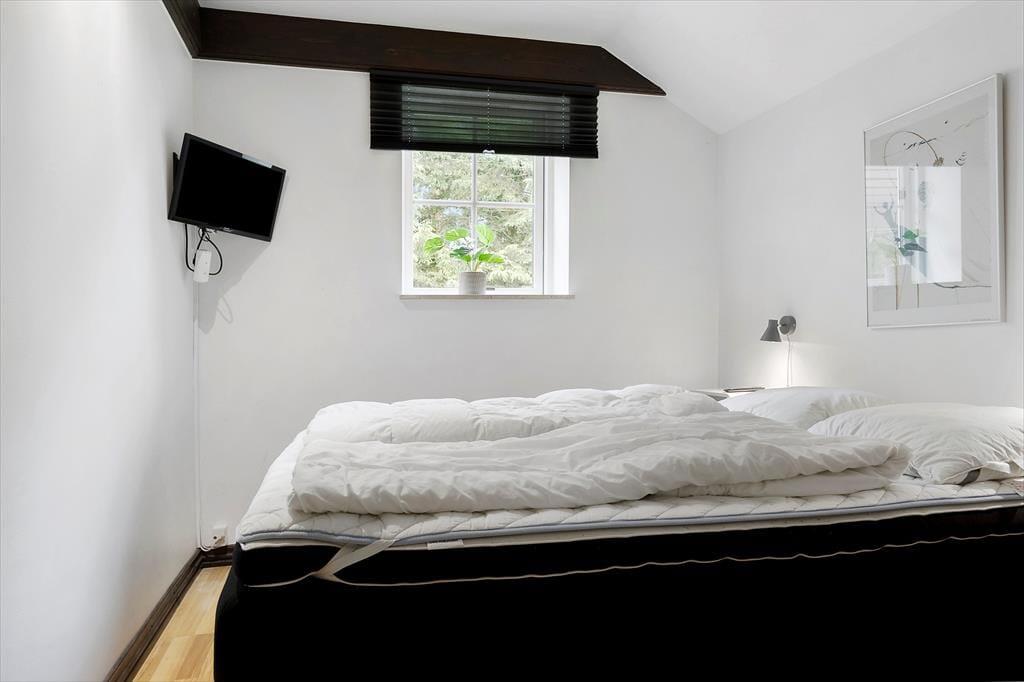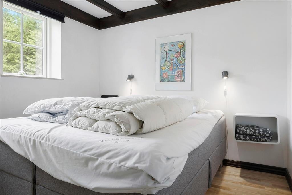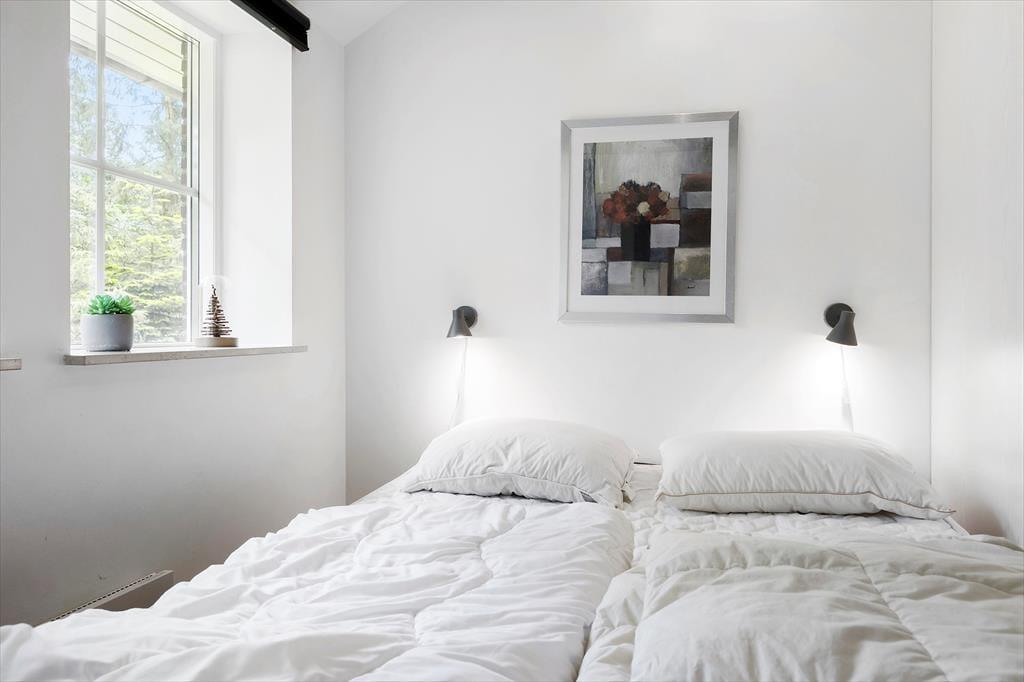 Med hvid vægfarve, lette gardiner og loft til kip er der en lys og indbydende atmosfære i stuen. Møblementet giver karakter til rummet og sørger for, at du kan sidde komfortabelt – og indbygningspejsen kan forvandle enhver aften til en særligt hyggelig stund. Det kan sommerhusets spabad også, for der er ikke noget så skønt som at kunne forkæle sig selv med et varmt bad, når dagen går på hæld. I alt er der to badeværelser, og planløsningen byder på tre soveværelser såvel som to hemse med ekstra madrasser.