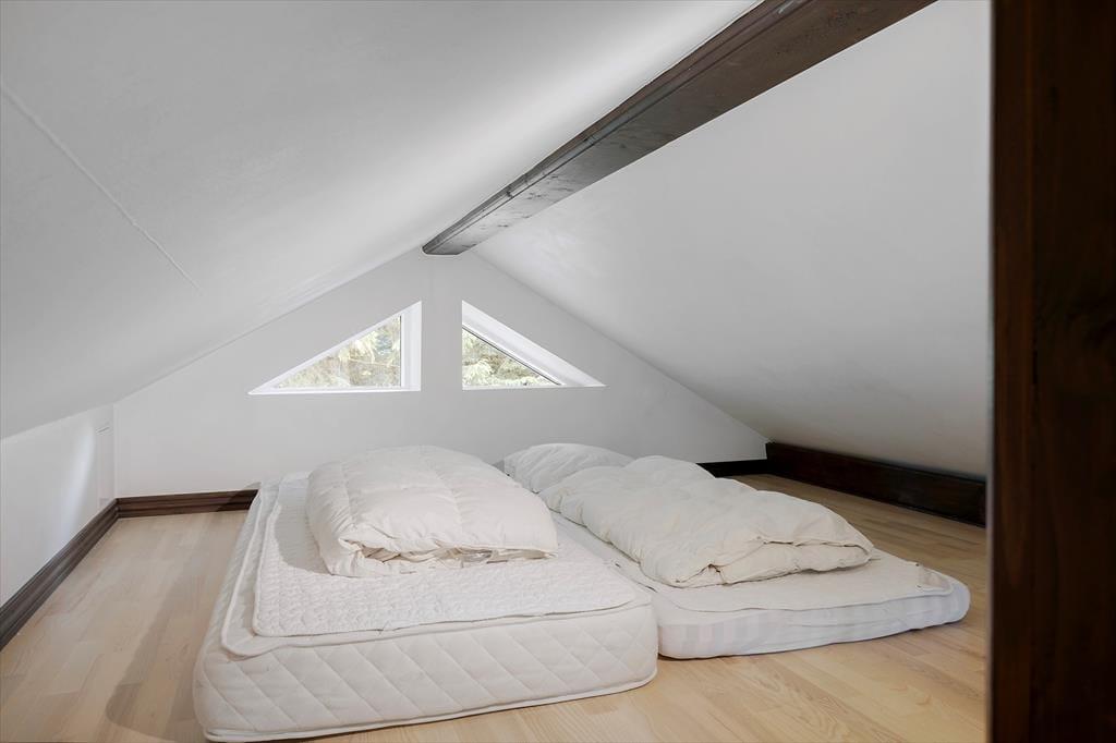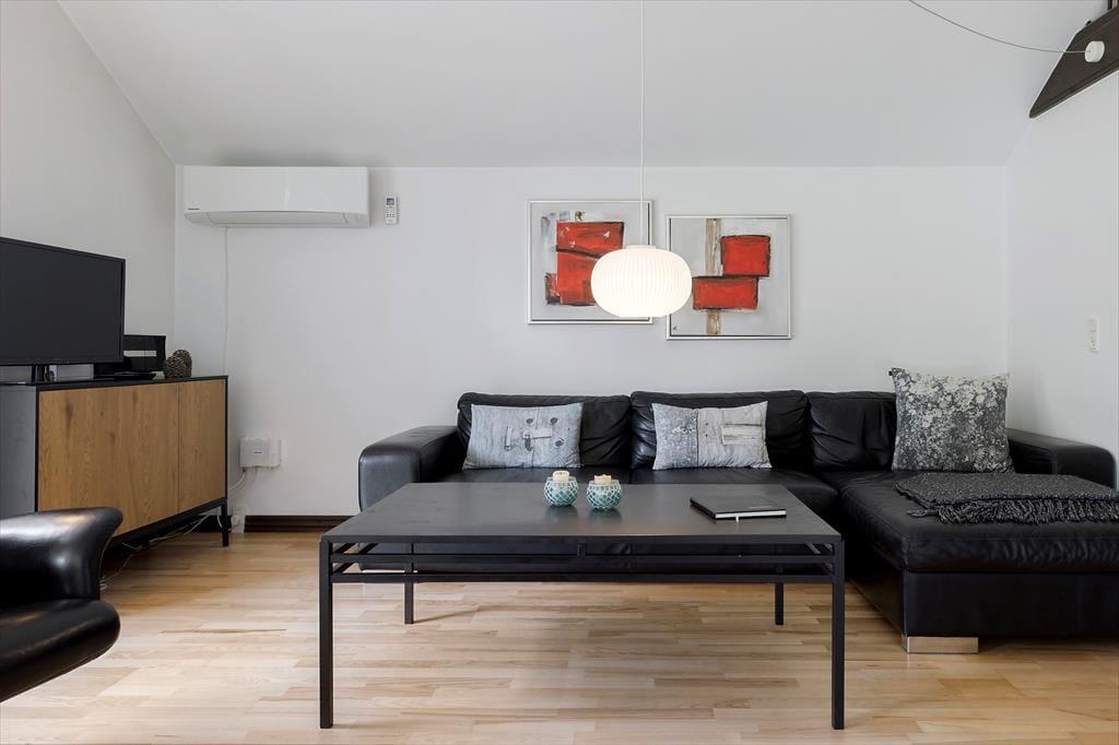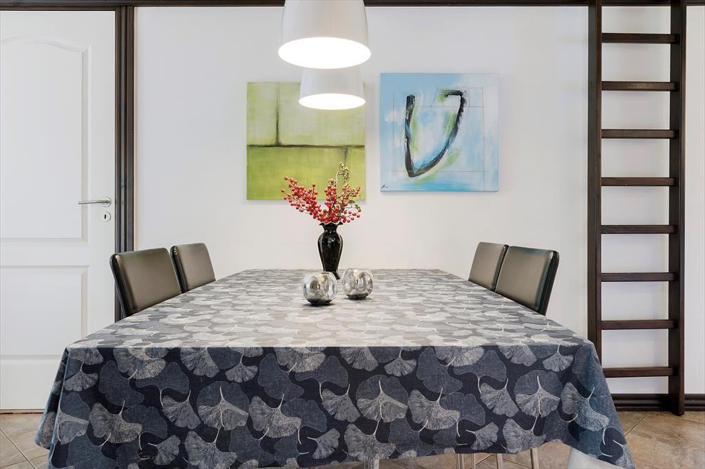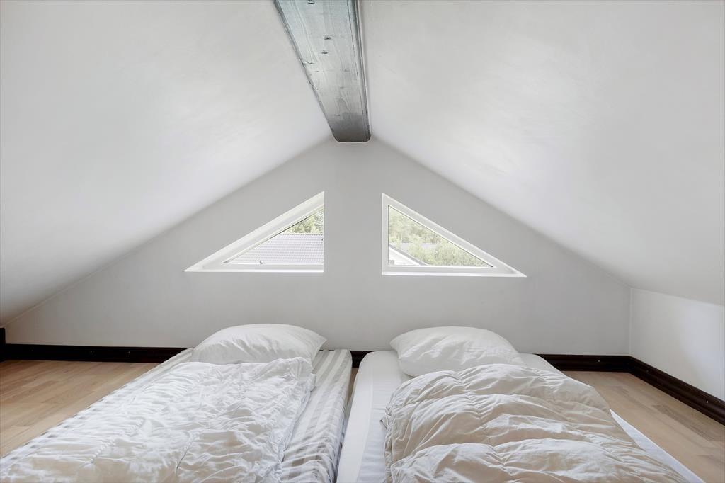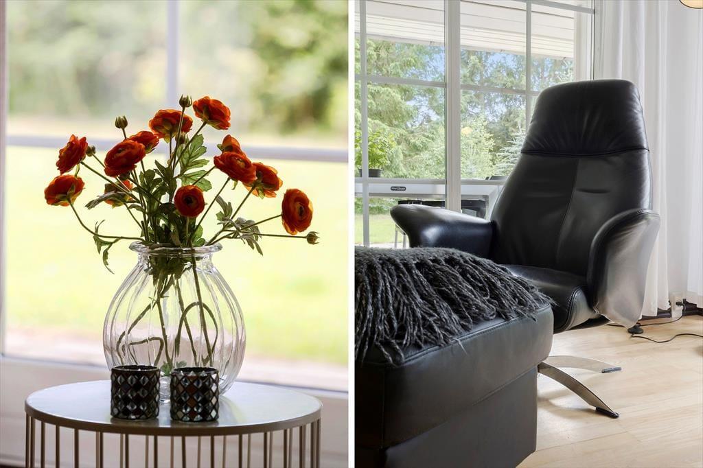 Med hvid vægfarve, lette gardiner og loft til kip er der en lys og indbydende atmosfære i stuen. Møblementet giver karakter til rummet og sørger for, at du kan sidde komfortabelt – og indbygningspejsen kan forvandle enhver aften til en særligt hyggelig stund. Det kan sommerhusets spabad også, for der er ikke noget så skønt som at kunne forkæle sig selv med et varmt bad, når dagen går på hæld. I alt er der to badeværelser, og planløsningen byder på tre soveværelser såvel som to hemse med ekstra madrasser.